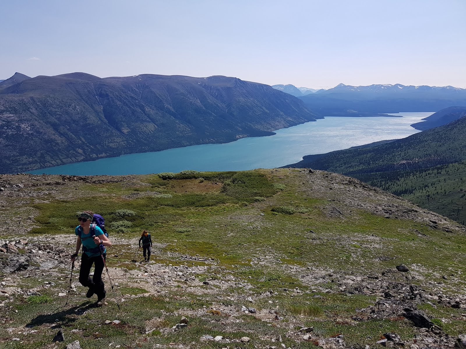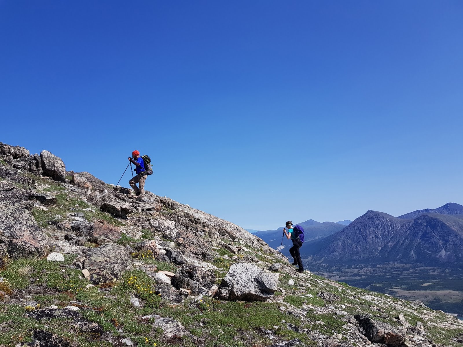 Le lendemain, c’est sous un grand ciel bleu que nous entamons notre périple. Puisque nous n’avions pas trouvé le début du sentier la dernière fois, nous avons retenté notre chance avec les coordonnées soigneusement notées par Stéphane. Nous avons donc pu nous rendre compte qu’en fait, il avait mal noté les données la première fois et que le départ du sentier n’était pas du tout au même endroit, ha ha. Mais cette fois, ça va beaucoup mieux. Le début est tout de même un peu hésitant, mais notre castor junior a vite fait de nous emmener sur le bon chemin. Et nous ne l’avons pas regretté. C’est l’une des randonnées les plus variées que nous avons faites jusqu’ici : forêt, toundra, pierrier et pré alpin. Le tout avec une vue à couper le souffle à l’arrivée, parce que comme d’habitude, ça grimpe.
