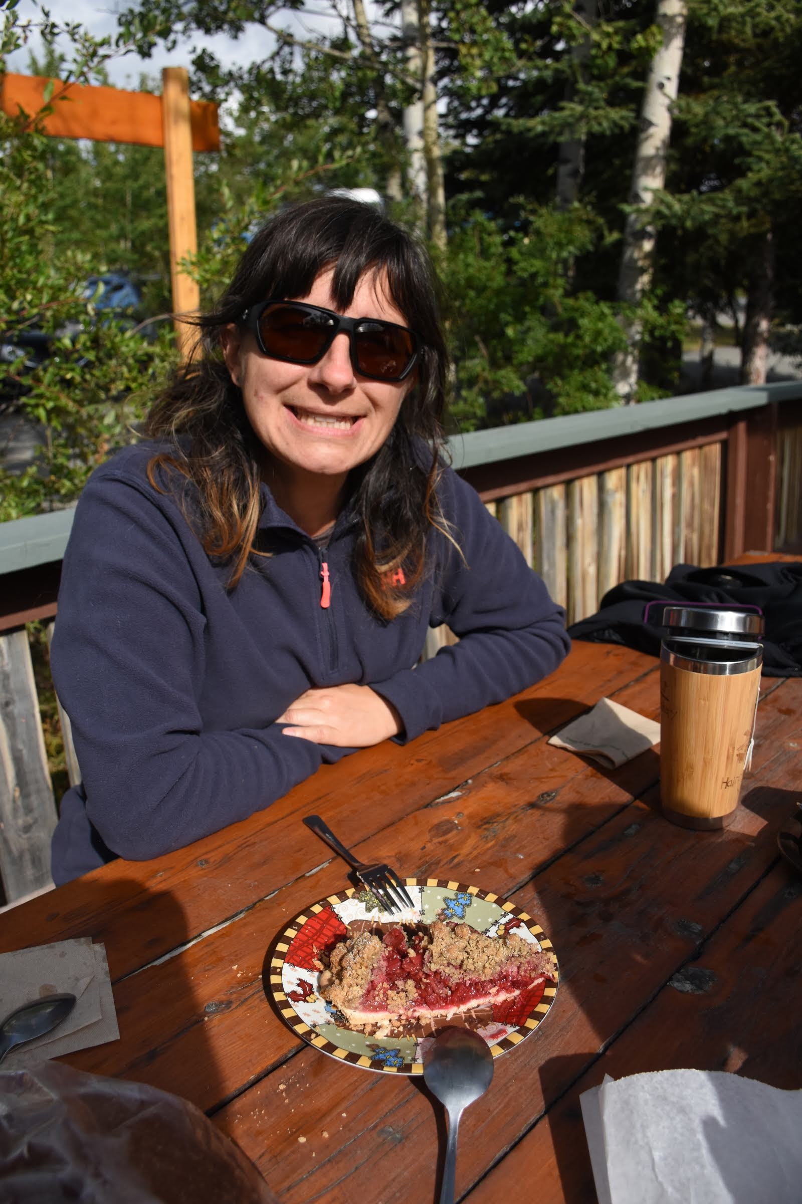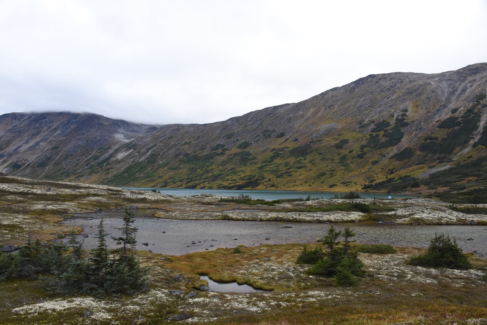 Après une courte semaine de travail, nous sommes aller vadrouiller en amoureux dans la région des Lacs du Sud pour le week-end : camping à Dyea, en Alaska. Il n’y a plus grand monde, c’était vraiment agréable de se retrouver presque seuls, même si le bruit d’une grosse bête invisible dans le noir nous a quand même fichu la trouille. Puis retour au Yukon le lendemain pour marcher jusque Fraser Lake, sur les conseils de mon collègue Michel. On n’a pas vu d’ours, mais des crottes. On n’a pas vu de caribous, mais des traces de pattes. Par contre, on a vu plein de rochers et de montagnes. Et on a aussi trouvé plein de bleuets sauvages. On a fait une petite récolte pour un bon goûter.