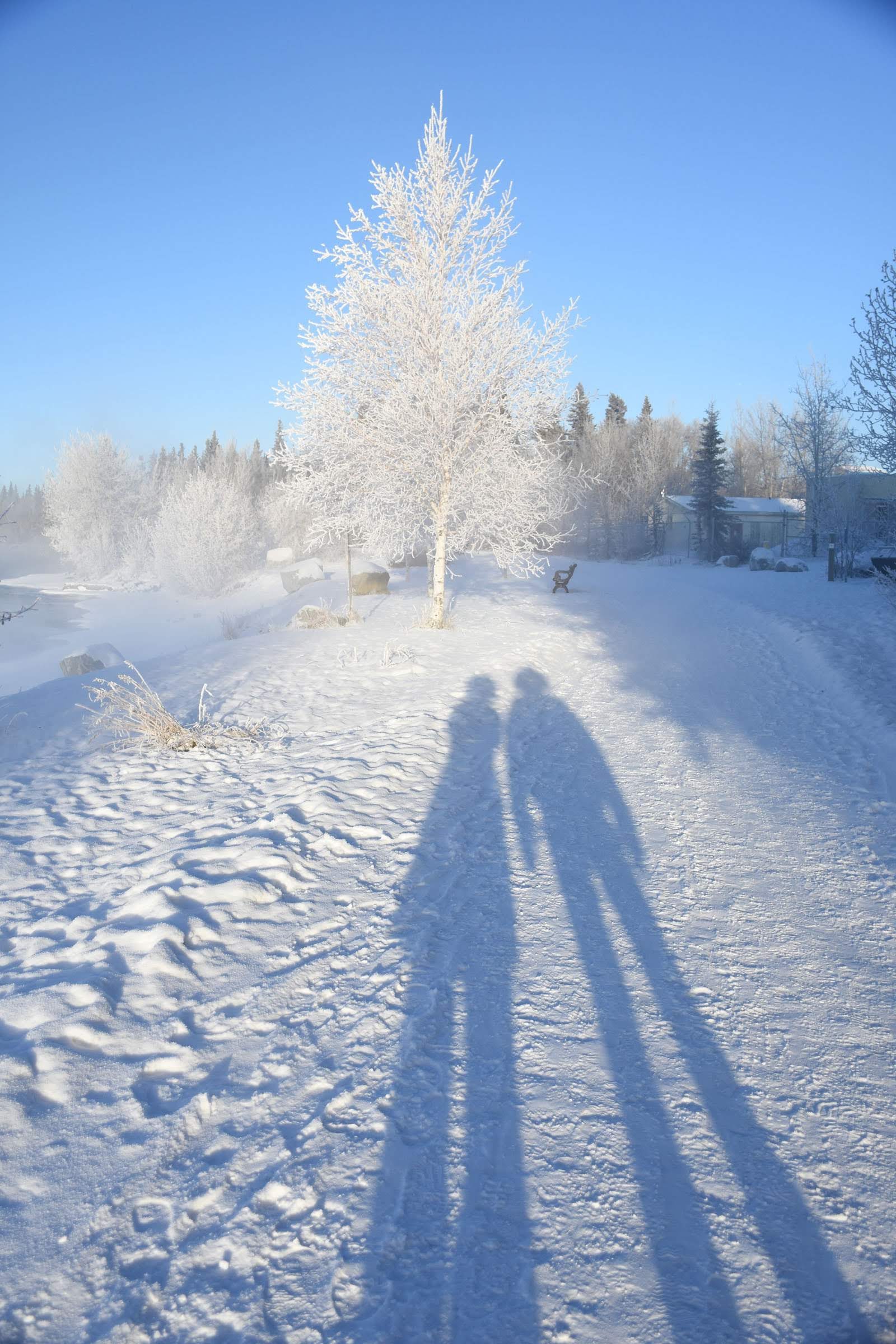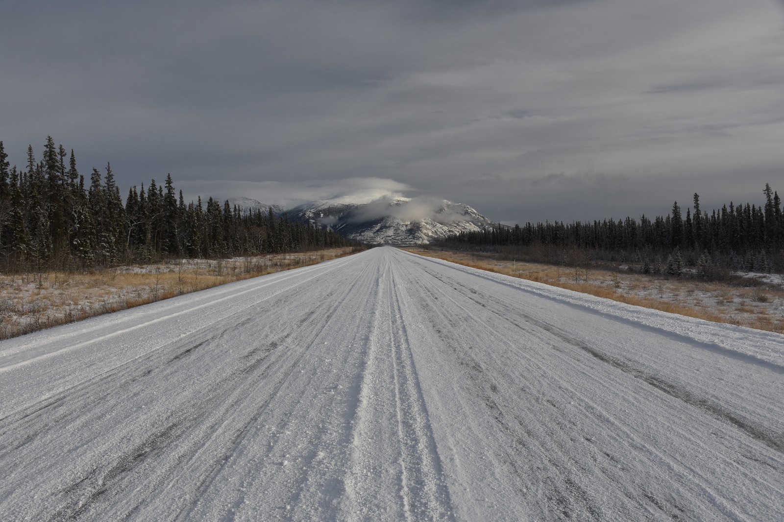 Mais la nature a remédié à ça le week-end suivant. Nous avions loué un petit chalet près du lac Kluane dans l’espoir d’aller randonner à la grotte de glace qui se trouve dans les environs. Nous avons dû changer notre fusil d’épaule en nous réveillant le samedi et que nous avons retrouvé Étienne sous 10 cm de neige. La route n’était pas dégagée et nous étions encore à 60 km du départ de la randonnée, et à 150 kilomètre de Whitehorse. Nous avons donc décidé de rentrer. Nous avons tout de même fait une petite halte sur la route dans le parc pour marcher sur une partie du sentier Auriol, histoire de ne pas avoir fait toute cette route pour rien. Et là, pour le coup, les raquettes étaient bien à nos pieds. Pendant 6 km seulement, mais c’était déjà ça. Et la grotte, ce sera pour une prochaine fois.