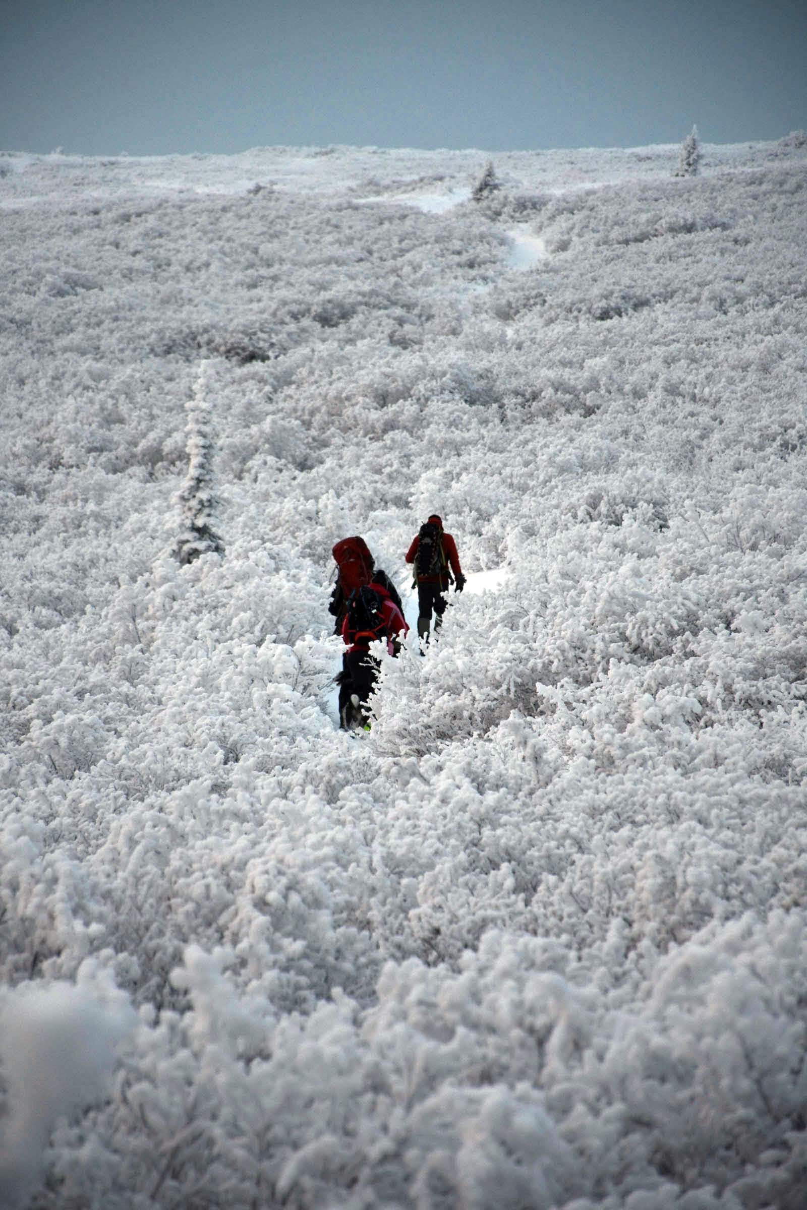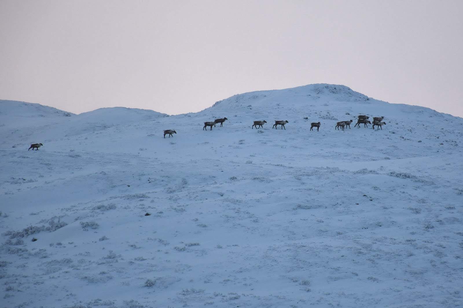 Le point fort de cette balade de 20 km (quand même…) n’aura cependant pas été la maisonnette, mais bien la harde de caribous que nous avons pu observer au lever du soleil en atteignant la crête de la montagne. Une première : on a beau être végétaliens, les caribous manquaient à notre tableau de chasse (ha ha ha). C’était tout simplement magnifique.