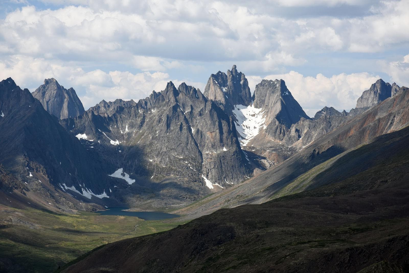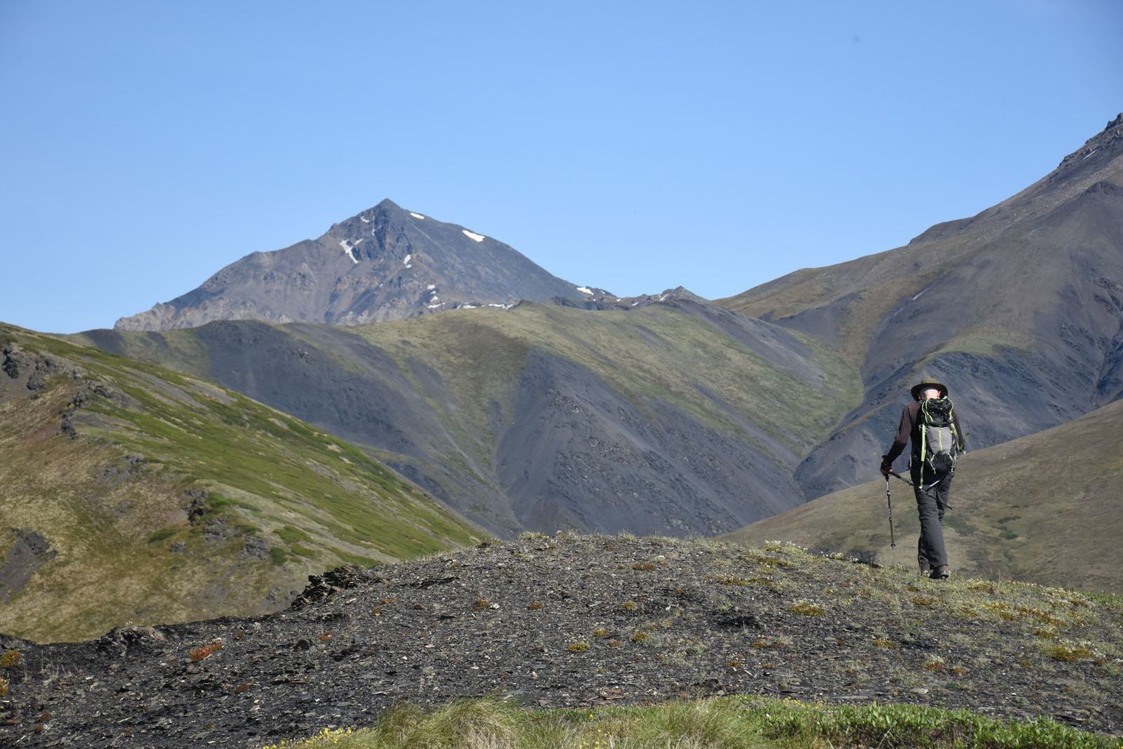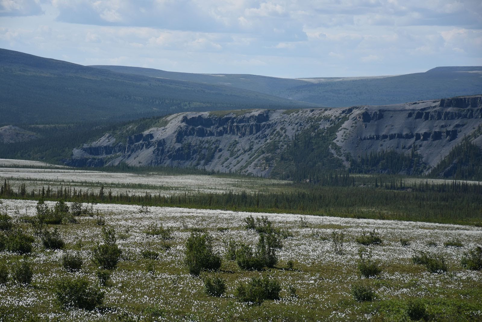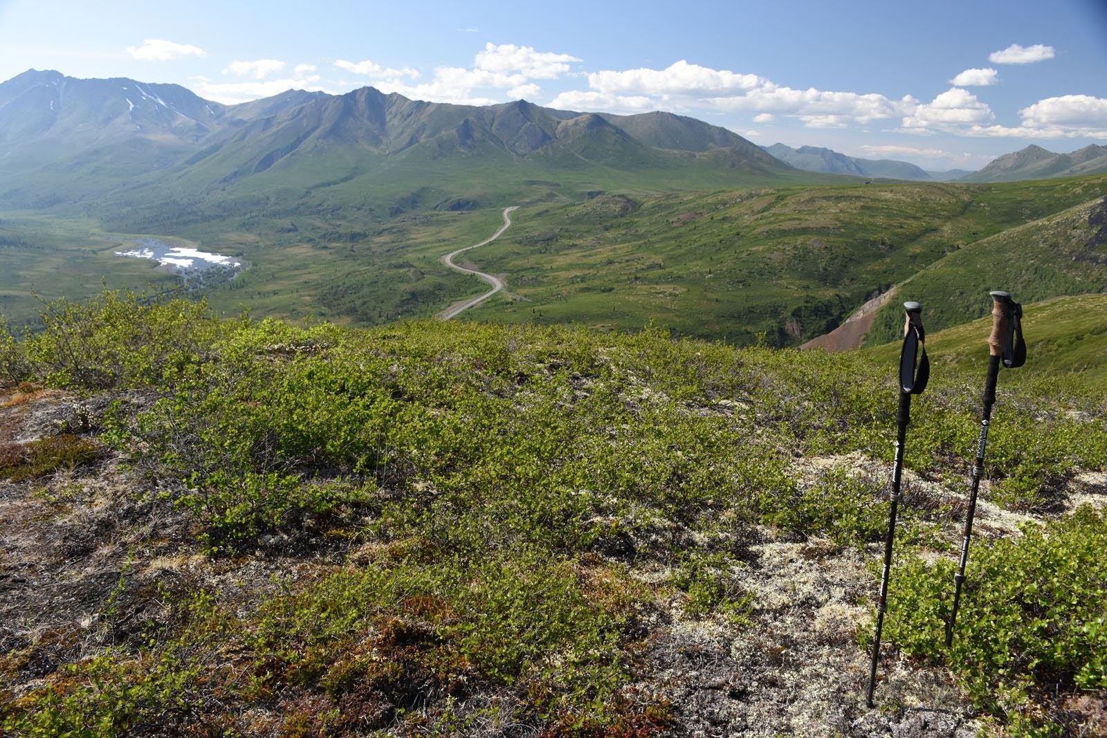 Jour 2, direction le parc territorial Tombstone, au Nord de Dawson. Comme il fait vraiment beau, nous décidons de nous y arrêter tout de suite plutôt que de risquer d’avoir de la pluie au retour. Mieux vaut tenir que courir. Arrêt obligé au croisement de la Klondike Highway qui part à l’ouest vers Dawson et la Dempster Highway qui part vers le nord : on remplit le réservoir. Après ça, plus de station essence avant au moins 400 km. Nous nous installons au camping du parc. Quand je dis nous installons, je veux dire nous installons la tente moustiquaire. Nous retrouvons les joies du camping et les moustiques ne tardent pas à nous rappeler leur présence. Dès le deuxième soir, on peut dire que ça commence bien… Cela ne nous empêche pas d’aller faire une courte randonnée pour nous mettre en jambes avant la vraie marche du lendemain.