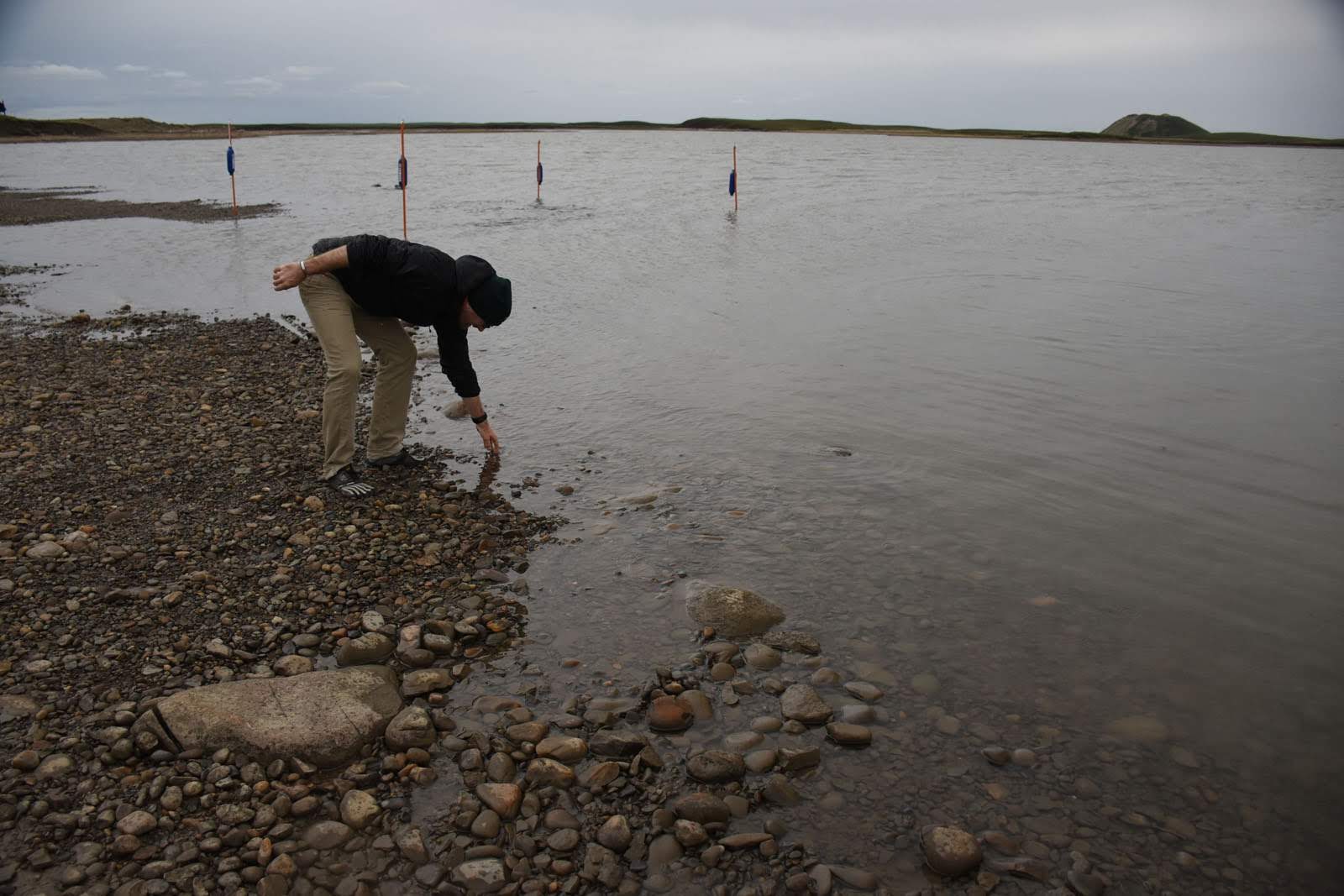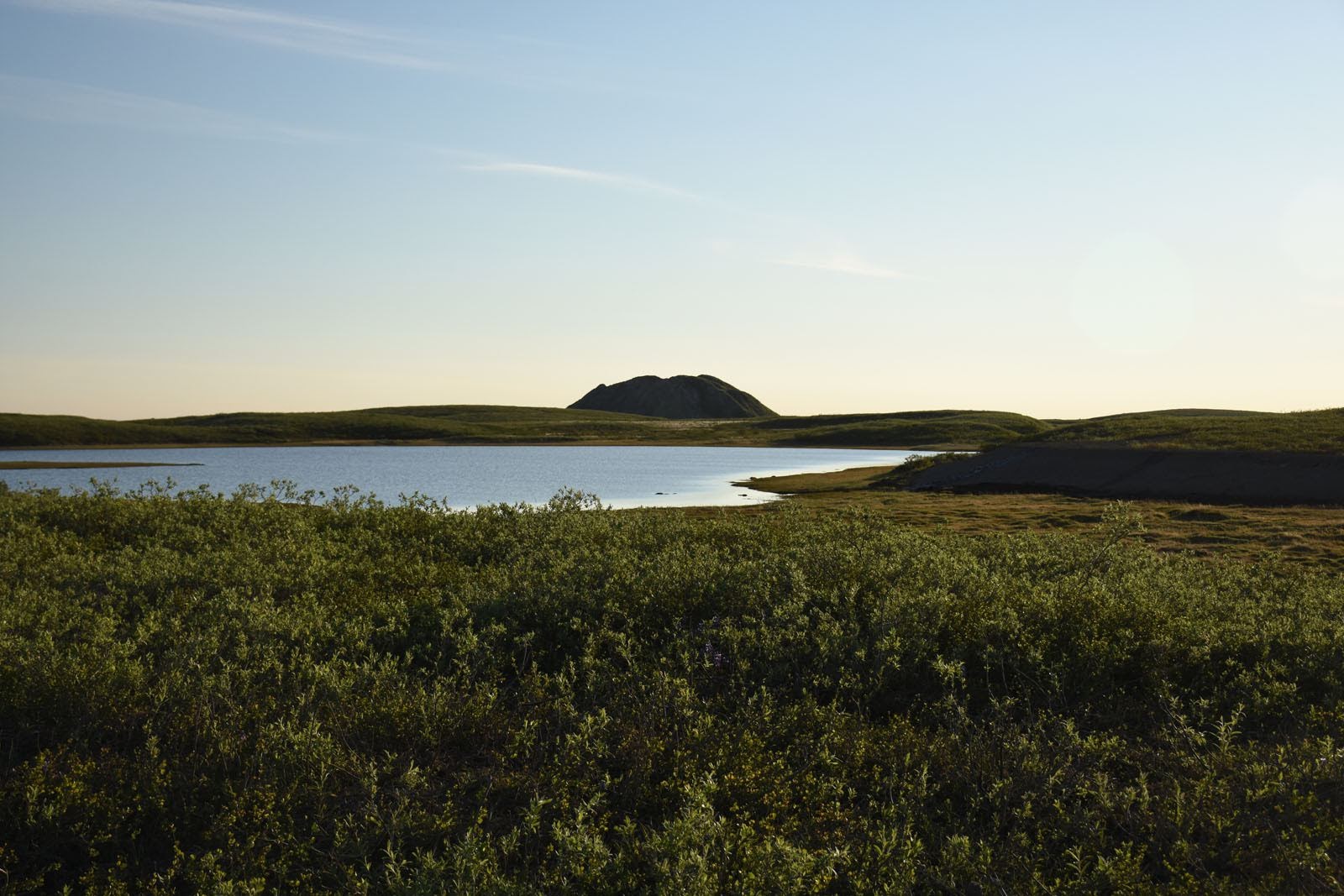 Le lendemain, surprise, il fait grand jour lorsque nous nous réveillons. Le ciel, bleu d’un côté et grisonnant de l’autre ne présage rien de bon. Nous nous installons à la table de pique-nique pour déjeuner et nous voilà partis à la recherche de quelqu’un qui voudra bien accepter de nous vendre le permis de camping que nous aurions dû acheter la veille, mais nous étions arrivés trop tard. Après l’office de tourisme fermé, la vendeuse de la boutique d’art qui ne sait pas, le vendeur du supermarché qui ne sait pas et la mairie fermée, nous abandonnons. On ne va quand même pas frapper à toutes les portes. Il faut se rendre à l’évidence, le camping est gratuit à Tuk. On passe quand même acheter deux-trois trucs à l’épicerie (tant par nécessité que par curiosité), mettons de l’essence pour le plus grand bonheur du jeune vendeur et, le ciel devenant de plus en plus menaçant, nous dépêchons de repartir au sud vers les pingos avant la pluie. Les pingos sont l’une des curiosités de la région : de petites collines formées par la fonte du pergélisol et le mouvement des plaques tectoniques. Trop technique pour moi, vous trouverez tous les détails ici. On en profite pour goûter la température de l’eau – pas si froide. Stéphane ne respectera toutefois pas son engagement et n’osera pas se baigner. Petit joueur!