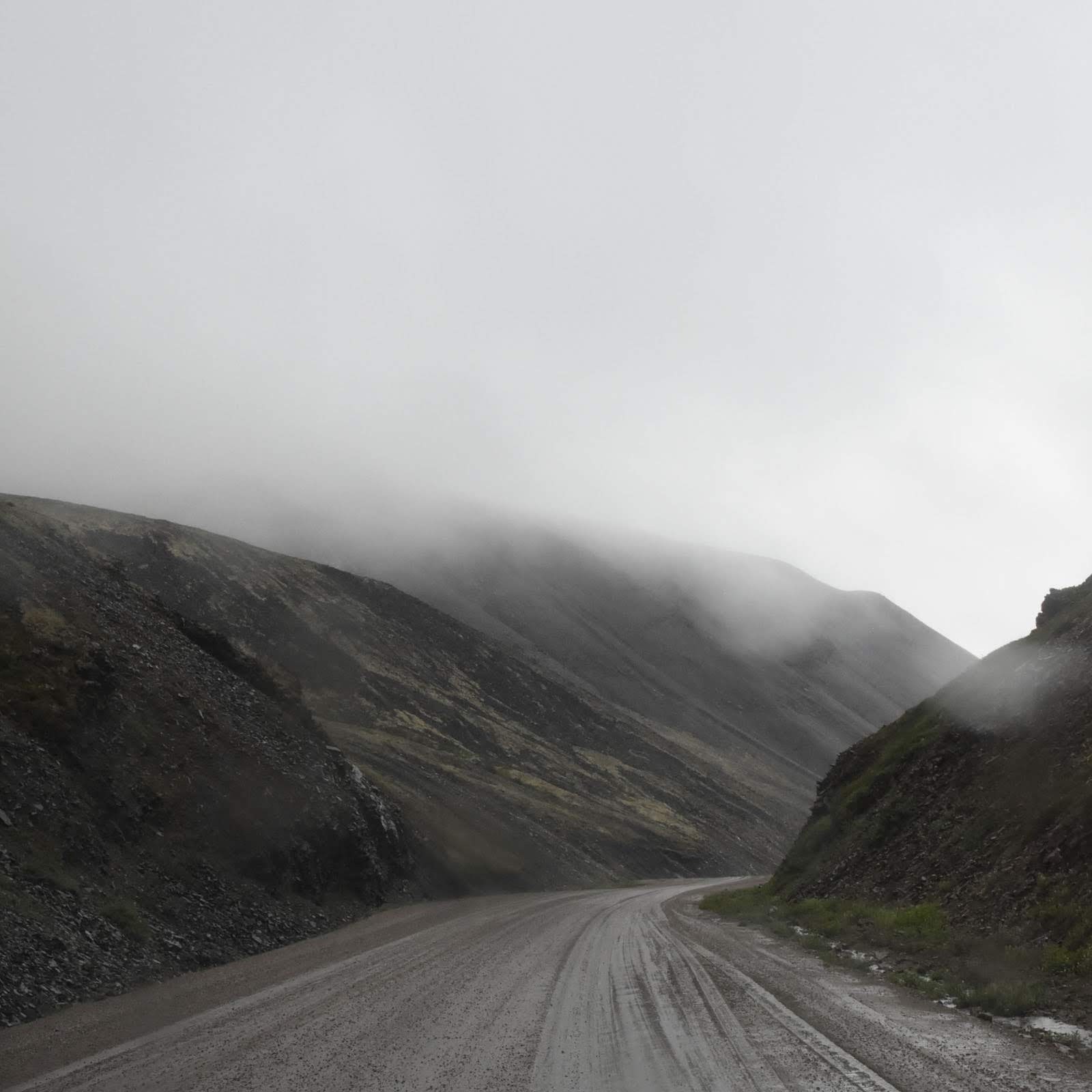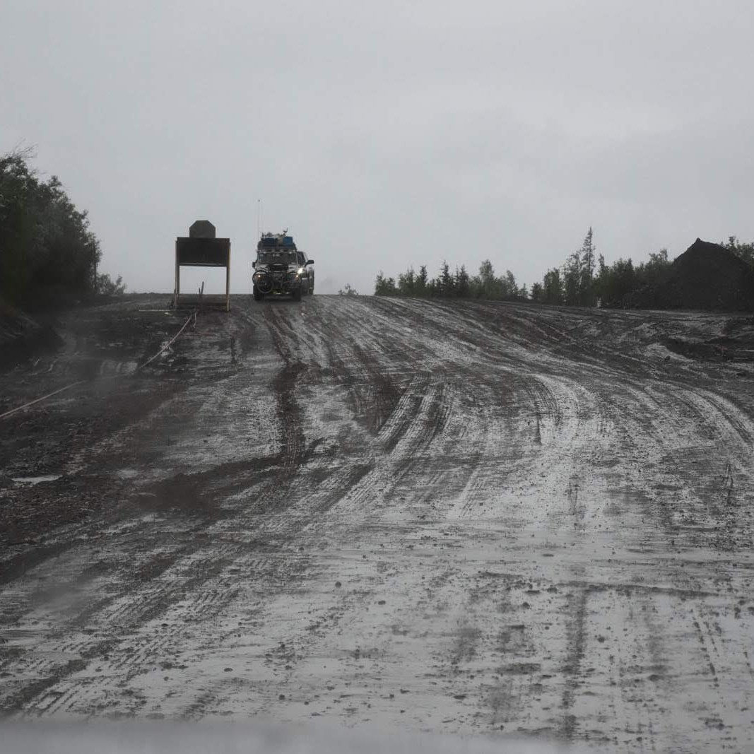 La pluie arrive et il est temps de reprendre la route, direction Dawson. On décide d’aller le plus loin possible, on verra où on s’arrête. Le temps se gâte vraiment à mesure que nous avançons et après un court arrêt à Inuvik pour voir à quoi ressemble la plus grande ville du Nord (à rien d’exceptionnel), c’est le déluge. Sur une route non asphaltée, on vous laisse imaginer ce que ça donne. Les passages de traversiers se font littéralement dans la boue et on soulève de la terre (de couleur différente selon la portion de route) qui reste collée sur la carrosserie d’Étienne. Son nouveau look fait d’ailleurs fureur auprès des gens qu’on croise qui nous félicitent en reconnaissant notre exploit.