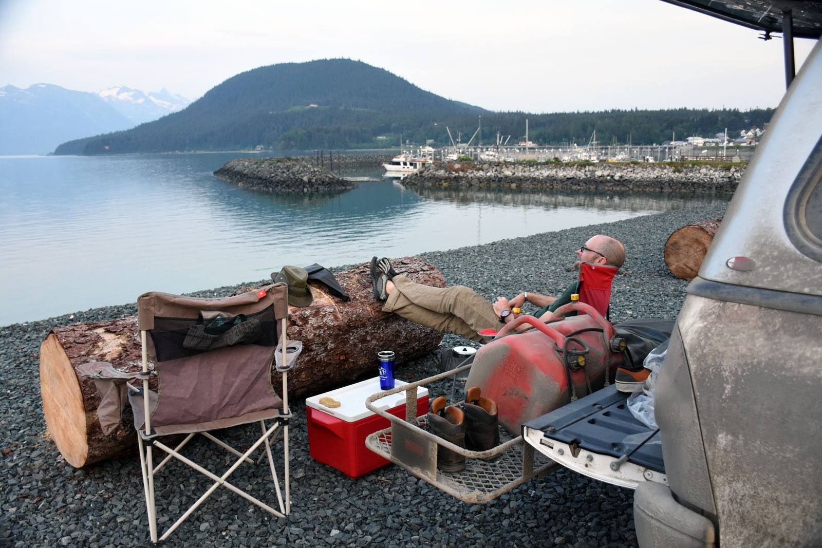 Le lendemain, nous partons à l’assaut de l’office de tourisme. Notre plan est de passer quelques jours à Haines, puis de prendre un traversier jusqu’à Juneau, la capitale, deux jours plus tard. On nous indique le camping d’état et le terminal maritime, où nous nous arrêtons en passant pour réserver nos billets. Et là, problème : le traversier que nous pensions prendre le surlendemain est plein. Il y en a un qui part aujourd’hui, mais il est plein aussi. Et pour le retour, ceux qui ne sont pas pleins ne nous permettront pas de passer suffisamment de temps en ville si nous partons avec le prochain sur lequel il reste de la place. Si nous n’allons pas à Juneau, nous perdrons la fin des vacances, car les distances ne sont pas suffisantes pour faire grand-chose aux alentours en si peu de temps. Alors on change les plans : on se met sur la liste d’attente pour partir aujourd’hui (septièmes, ça peut marcher) et réservons le retour à une date qui nous convient, le 4 juillet – fête nationale des États-Unis. Nous aurons ainsi suffisamment de temps pour profiter de la capitale et des environs, et passerons du temps à Haines au retour.