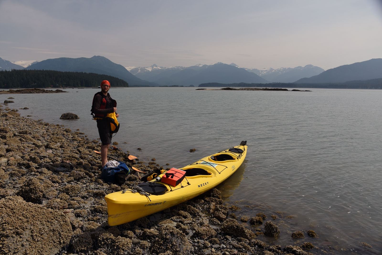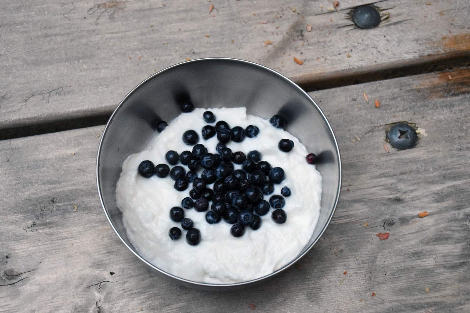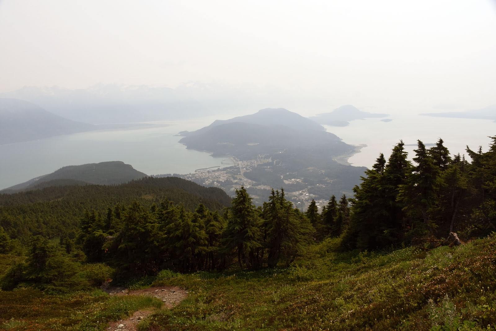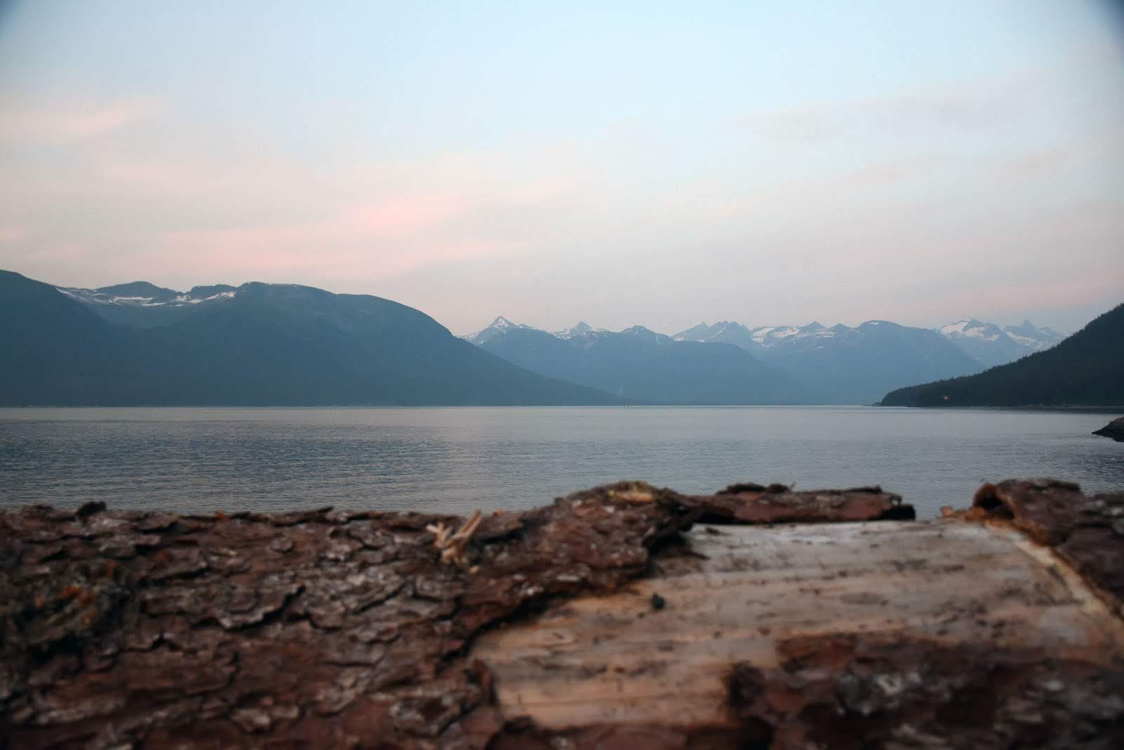 Après avoir bien profité du spectacle, nous décidons enfin de nous remettre en route pour le Mont Ripinsky, la rando du jour. Une belle petite ascension de 900 mètres de dénivelé : aïe aïe aïe, les jambes. Mais c’est super joli et varié : forêt humide en bas, près alpins en haut et sur la crête, une vue imprenable sur les montagnes, les glaciers et la mer. Dommage que la fumée nous empêche d’en profiter, hé hé. On se sera quand même fait une belle idée, et nous nous serons bien dépensés, de quoi mériter la bière de la micro-brasserie locale. Celle-là aura été très attendue, car après deux tentatives, l’établissement était enfin ouvert et nous avons pu profiter de la terrasse pour la déguster. Et de cette chaleur, ça requinque. En plus, nous ne nous sommes pas fatigués pour rien : c’était vrai, les bleuets sont en avance. Nous avons pu faire notre première récolte de l’année. Avec un super yaourt fermenté végane (genre fromage blanc) découvert sur place, le dessert était tout trouvé!