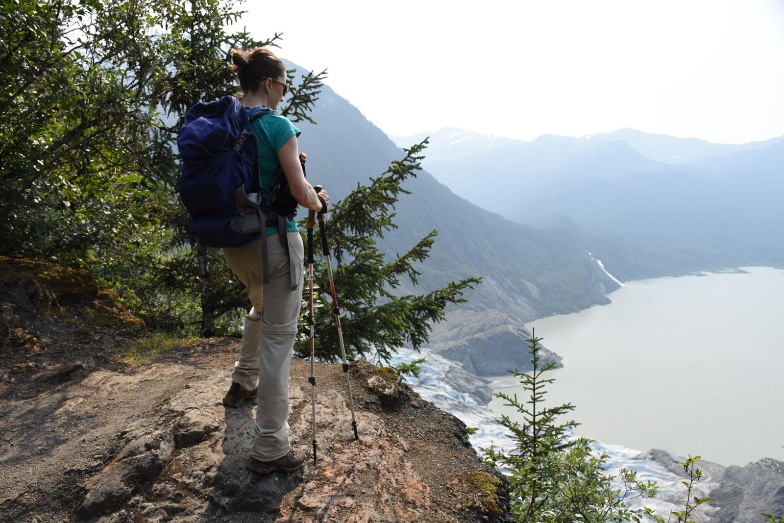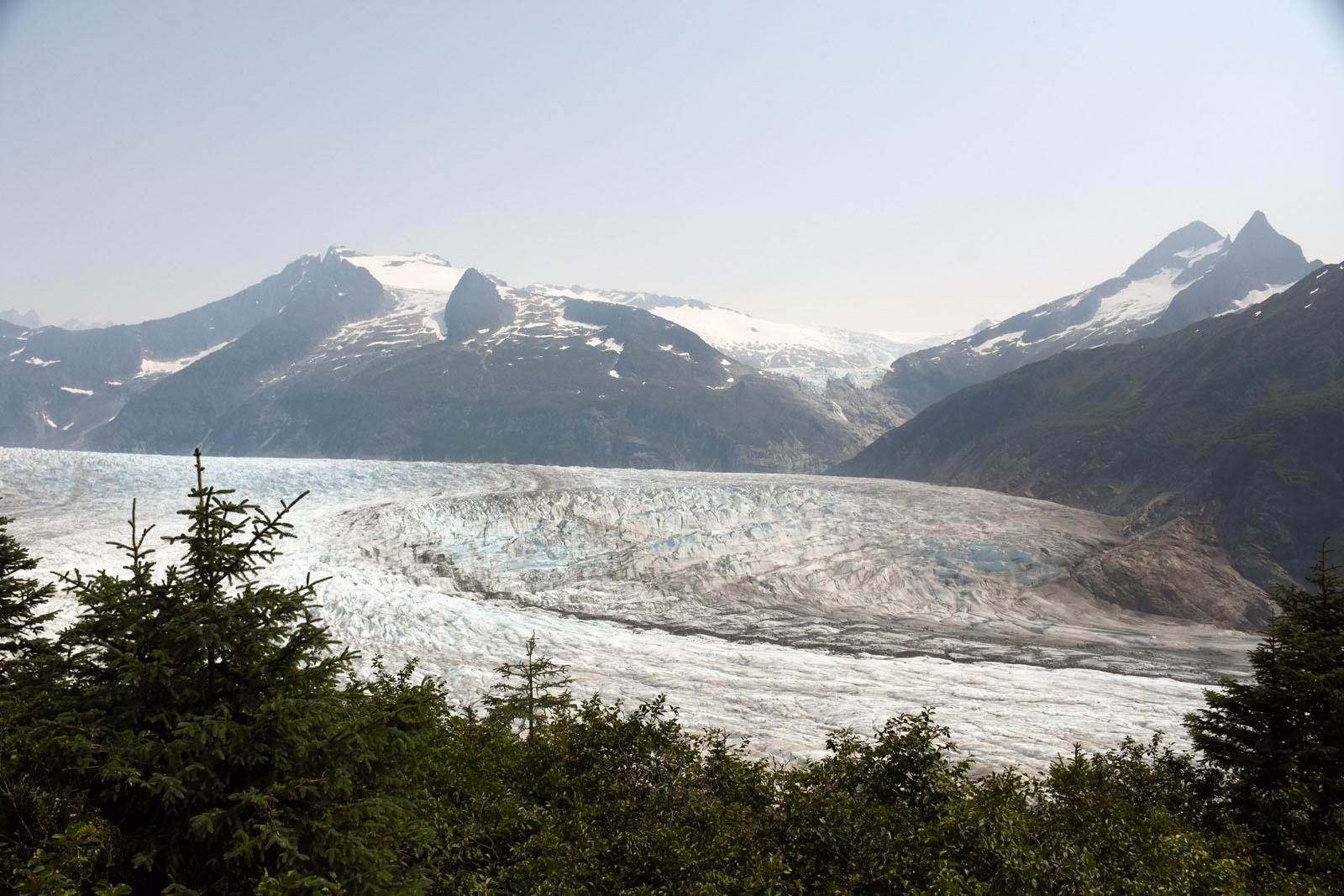 Nous avons de la chance, ça fonctionne. C’est parti pour 4 h 30 de traversée. Nous arrivons en fin d’après-midi et nous rendons directement au camping. Et là, on hallucine. Les États-Unis sont vraiment surprenants. On y trouve les deux extrêmes, le pire et le meilleur. On peut croiser des gens avec un fusil dans leur voiture, et pour autant, pour 12 $, on campe sur un grand emplacement boisé mais pas trop, avec des douches et de l’eau courante et potable. Pour ce prix-là, au Yukon, c’est toilettes sèches et tu fais bouillir ton eau… Le seul truc, c’est que les Américains sont au top de la technologie, et dans les camping fédéraux, il faut réserver à l’avance par Internet, ou par téléphone. Nous, on est tout sauf à la pointe de la technologie, on ne savait pas qu’il fallait réserver, on n’a pas de téléphone, et pas plus Internet. Et pas moyen de payer en liquide. Mais la dame du camping est vraiment très gentille et nous laisse nous installer sur un emplacement en nous disant qu’un ranger viendra demain pour la réservation. Le lendemain, comme promis, on vient nous voir pour nous prêter un téléphone et nous permettre de réserver pour les trois nuits suivantes. Une fois ce petit détail réglé, nous pouvons nous rendre compte de ce qui nous entoure : le camping donne directement sur le plus gros glacier de la région : le glacier Mendenhall. On ne le savait même pas. Le paysage est saisissant. Nous prévoyons marcher demain sur un sentier qui le longe par le côté ouest, d’où nous pourrons probablement profiter de la vue. Et c’est le cas. Après une montée de 5 km, nous atteignons un point de vue magnifique. On retrouve un peu les émotions ressenties en Amérique du Sud.
