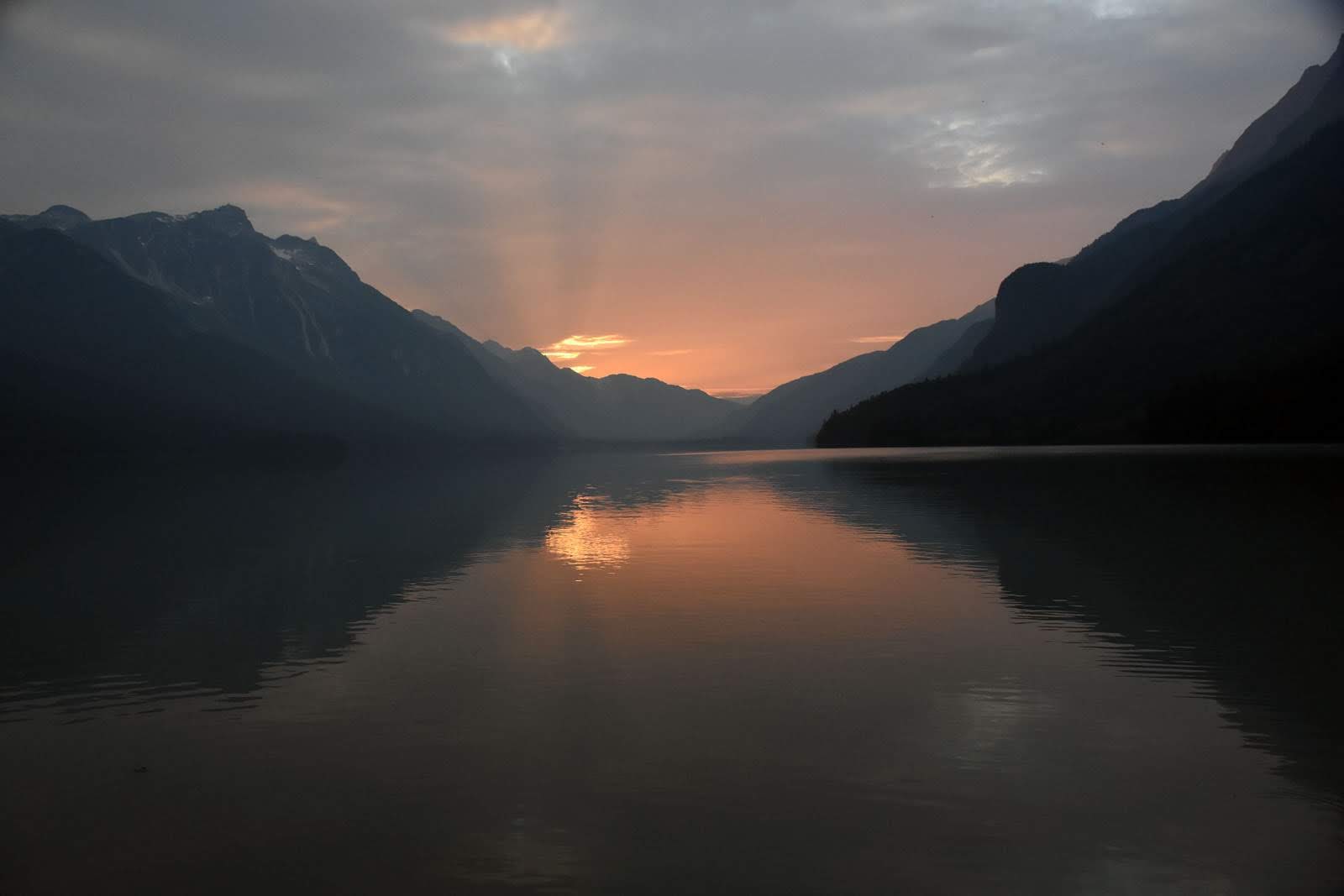 Après le repas, nous allons nous promener au bord de la rivière. Pas de grizzli ce soir, mais un magnifique coucher de soleil sur le lac. Nous ne sommes pas déçus!
