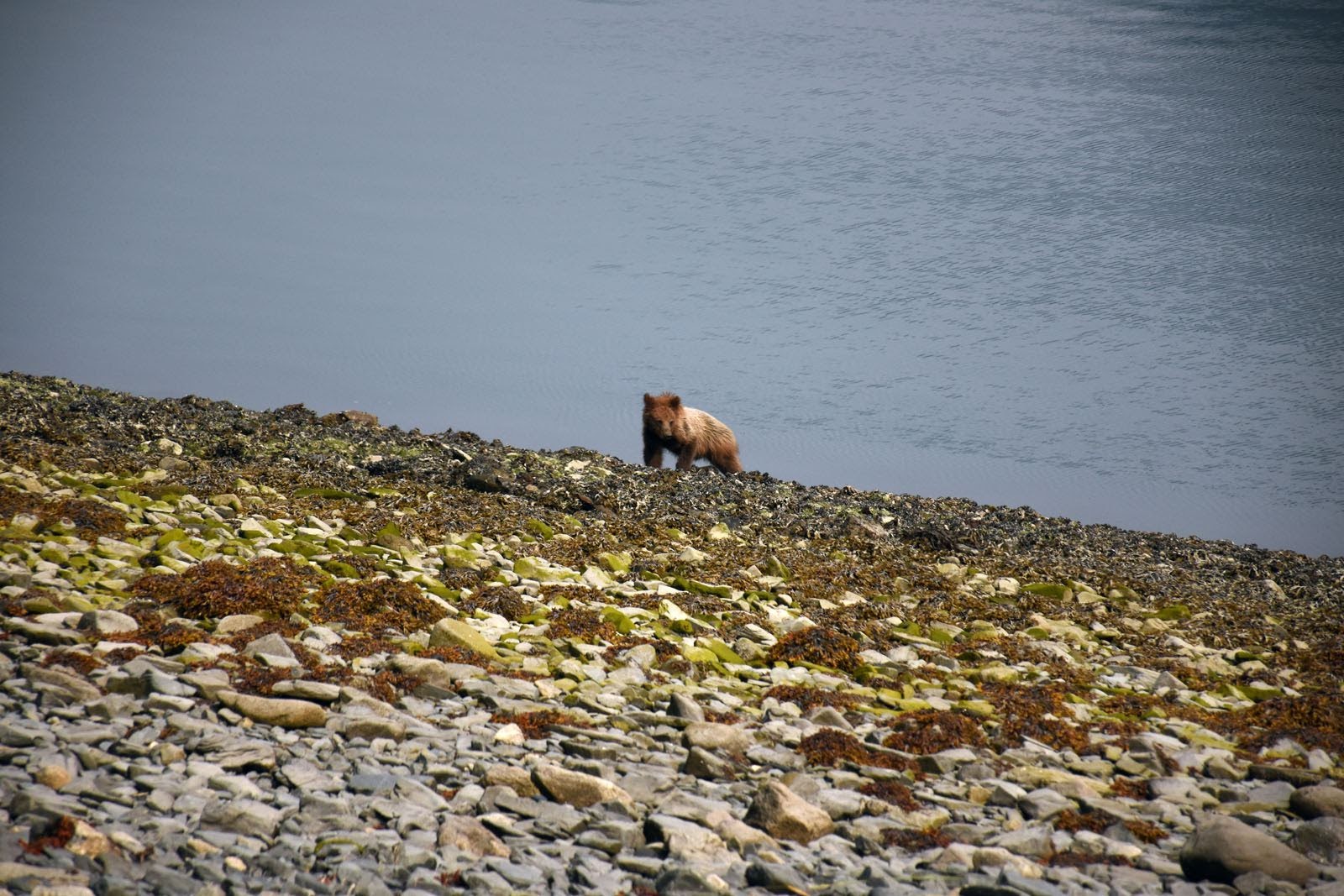 Pas de grizzli la veille, on nous explique qu’il est peu probable que nous en voyions pêcher. C’est très tôt dans la saison, et comme il fait chaud cette année, les bleuets sont déjà mûrs et les ours préfèrent se concentrer là-dessus et revenir à la rivière à l’arrivée des saumons. Mais celui qui se trouve sur la plage ce matin nous satisfait amplement. Il profite de la marée basse pour ramasser des moules et des coquillages et nous, on en profite pour l’observer. On ne se lassera jamais de ce spectacle.