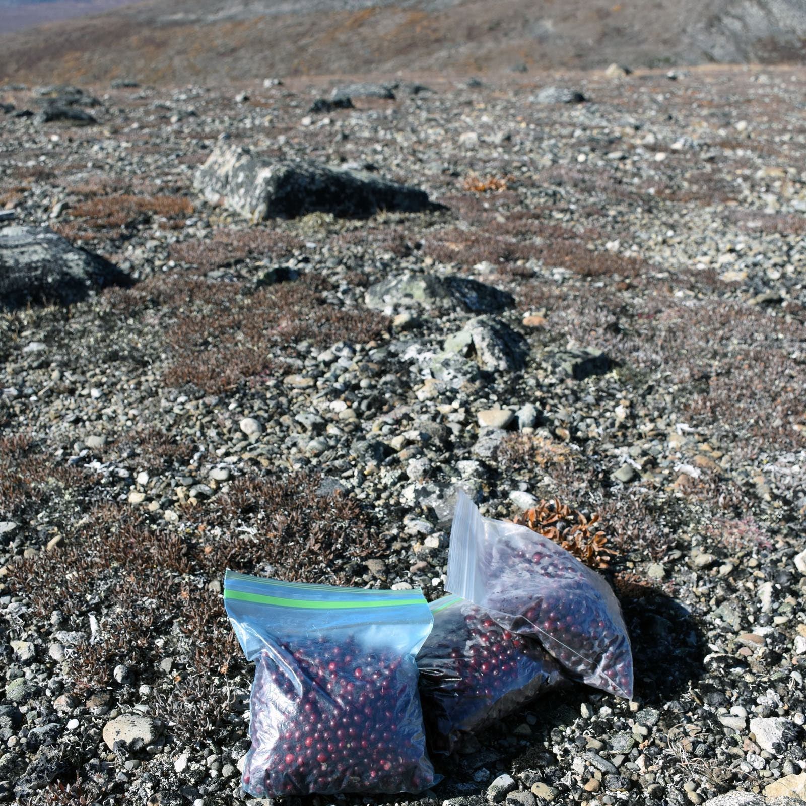 La semaine dernière, par contre, nous avons choisi une randonnée beaucoup moins abrupte, mais plus longue : 19 km aller-retour. Que nous n’avons pas vu passer tant les vues étaient variées, les couleurs incroyables, et les canneberges… nombreuses. Le chemin montait progressivement sur une route bordée de concessions (l’exploitation de placer a toujours cours à cet endroit) et de terrains de piégeage jusqu’à un sommet à 1586 m d’altitude du haut duquel la vue était imprenable. Et la surprise (qui n’en était pas vraiment une, puisque c’est la saison) a été la quantité de canneberges sur le chemin. Nous nous sommes bien arrêtés deux heures pour en cueillir et sommes revenus avec une belle récolte. Y a plus qu’à pâtisser, maintenant!