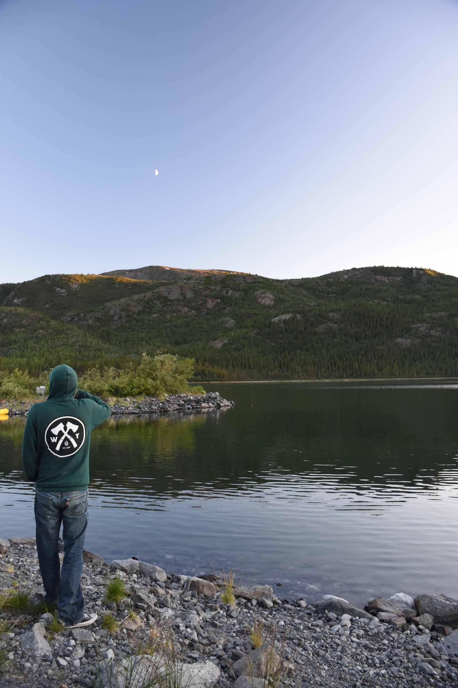 Le week-end suivant, direction le lac Ashihik (prononcer à peu près « éjak »), du nom de la Première nation locale. Encore une fois, de la route de gravier, parce que nous aimons nous faire secouer les miches. Mais ça valait la peine. En arrivant au bout du chemin, au bord du lac, presque seuls (un exploit dans les campings assez proches de la ville cette année en raison de la COVID qui empêche les gens d’aller vadrouiller hors du Yukon), nous savions que la soirée serait bonne. Soleil et absence de moustiques nous ont convaincus. C’est quand même bien, la solitude…