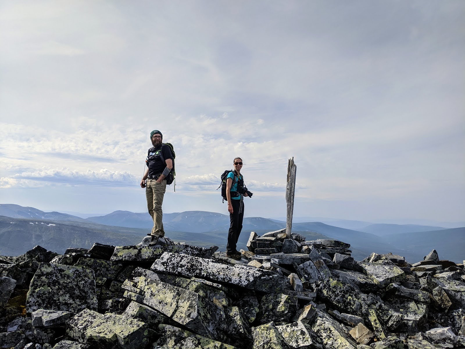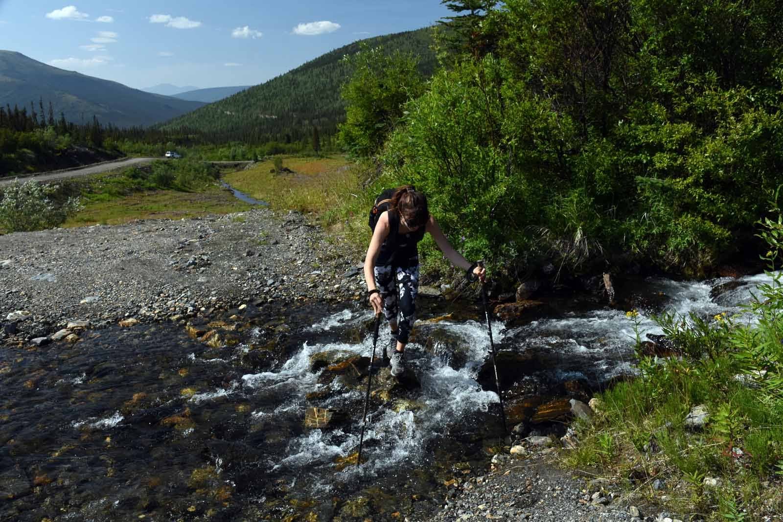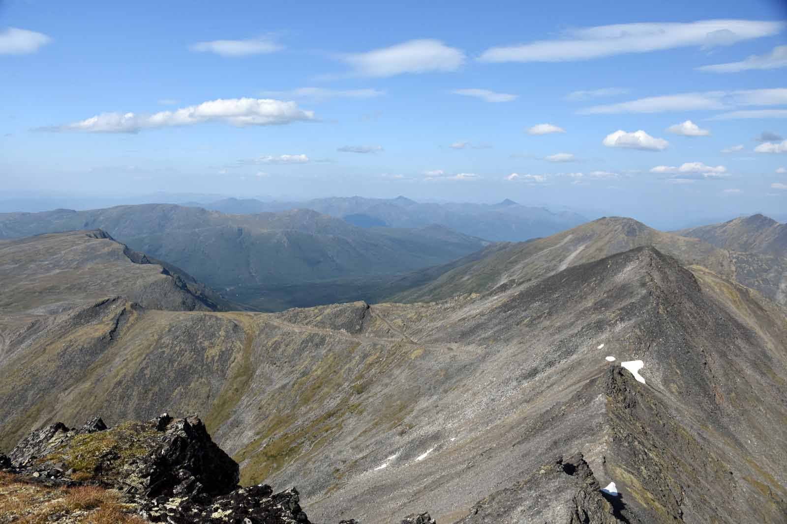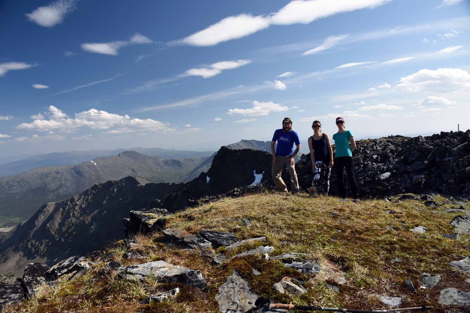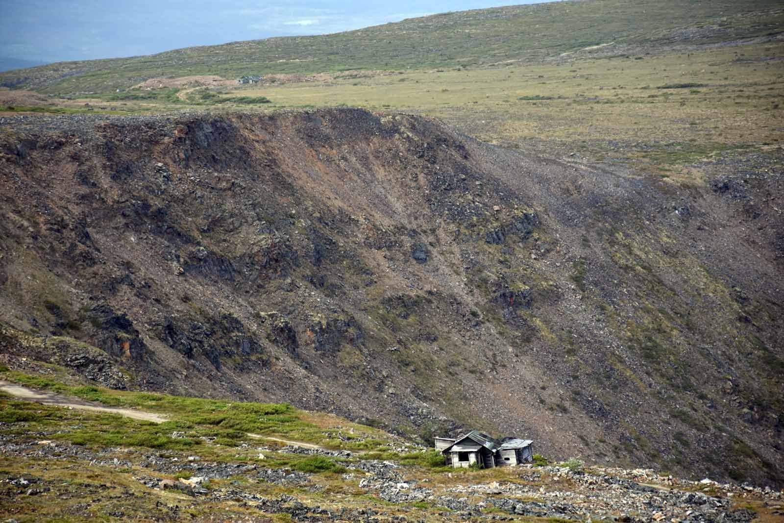 Nous commençons notre randonnée après un rapide passage à gué. L’ascension du Mont Hinton se fait assez facilement car nous suivrons en grande partie des chemins de prospection. Ce n’est qu’au dernier kilomètre que nous les quitterons et grimperons vers le sommet à travers un pierrier. D’en haut, la vue est magnifique. Nous avons une vue panoramique sur les montagnes voisines. On peut maintenant voir tous les chemins tracés sur les montagnes et les quelques mines qui sont encore en activité.