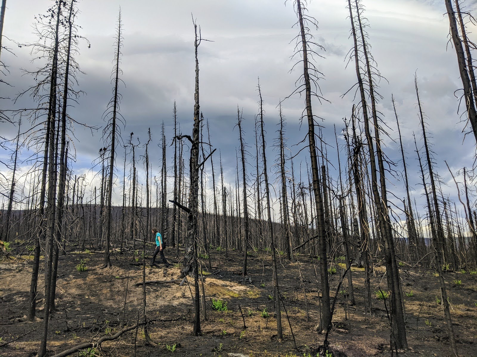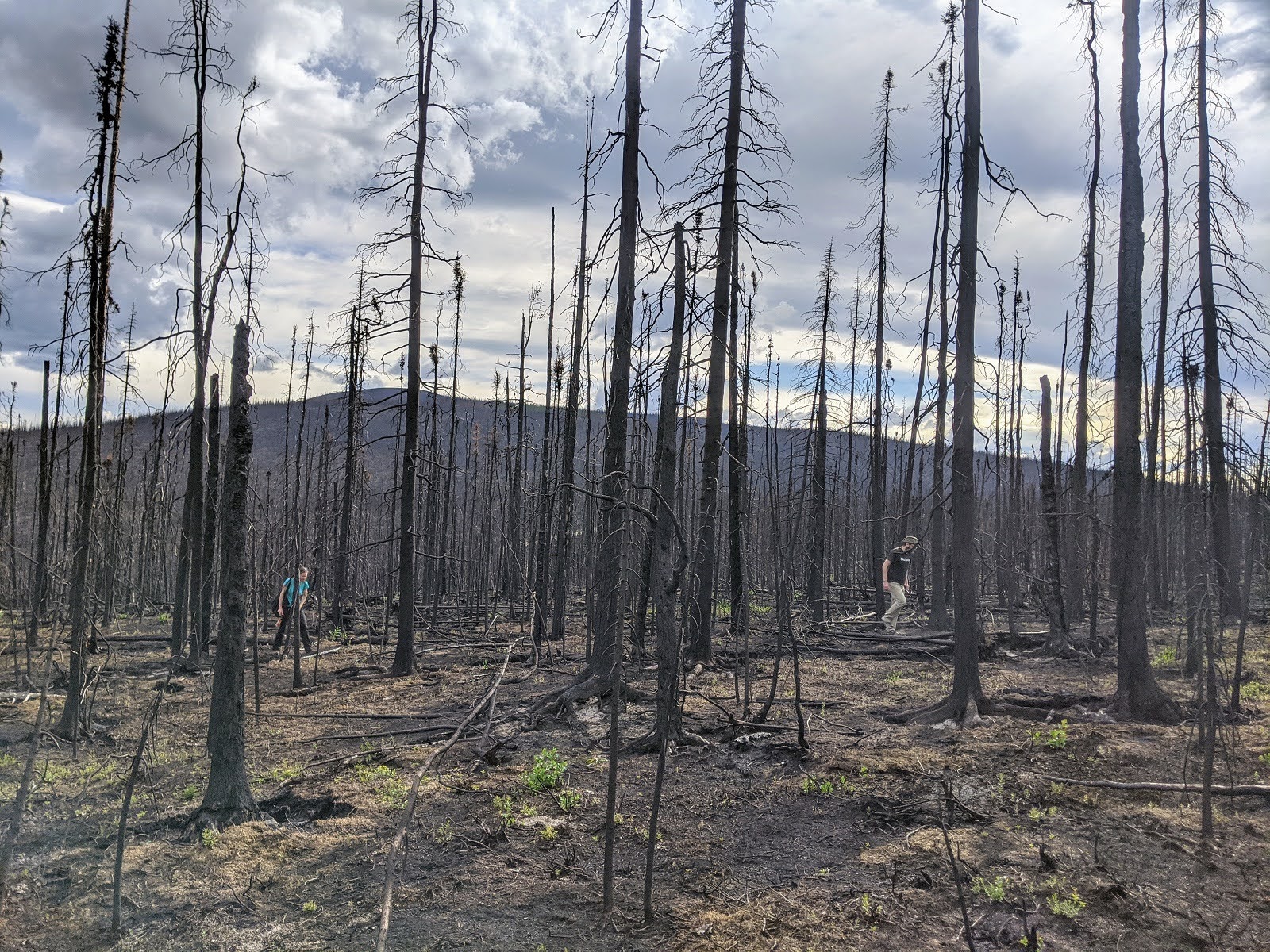 Nous prévoyons camper à Ethel Lake. Pour y arriver, il faut suivre la North Klondike Highway vers le sud puis prendre vers l’est pendant 20 kilomètres sur une route de gravelle. À l’embranchement, on découvre que cette zone a complètement brûlé, sûrement l’année dernière et voyons des campements installés le long du chemin. On devine vite ce qu’il s’y passe. De nombreuses personnes sont installées ici pour cueillir des morilles. Tout le long du chemin, ce ne sont qu’arbres et terres brûlés et campements. Le camping sera lui aussi occupé par les cueilleurs. Pas de place pour nous. Nous faisons demi-tour et décidons de nous arrêter pour chercher, nous aussi, les précieux champignons. Cela faisait partie des choses que Mélanie souhaitait faire avant de quitter le Nord. Là voilà récompensée. Nous passons une heure à chercher dans la terre brûlée. Paysage de désolation qui regorge de ressources…
