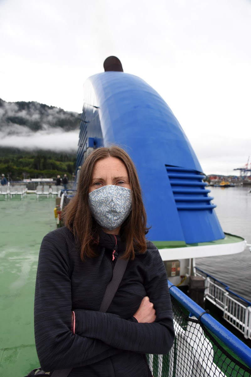 4 septembre : c’est parti. Embarquement à bord du Northern Adventure. Départ à 11 h pour une traversée de 22 h. Première expérience de port du masque, obligatoire sur le ferry. Verdict : on respire mal. Mais ce n’est pas plus grave que cela, surtout quand les masques ont été confectionnés spécialement pour nous par notre amie Julie. En plus, vu qu’on roule sur l’or, on s’est payé le luxe d’une cabine pour la nuit : quatre couchettes et un placard de bains qui sent le renfermé rien que pour nous. Rien de tel pour aller reprendre une bouffée d’air frais.