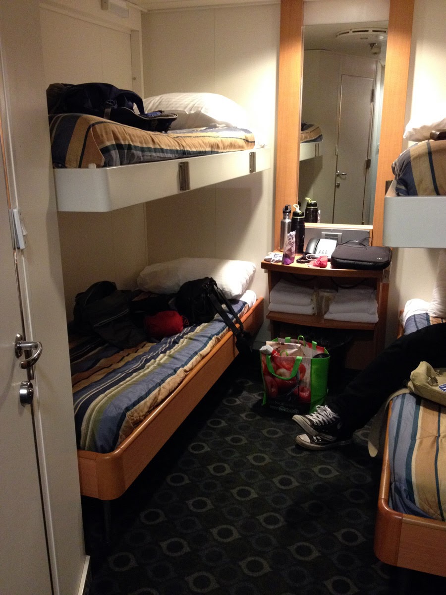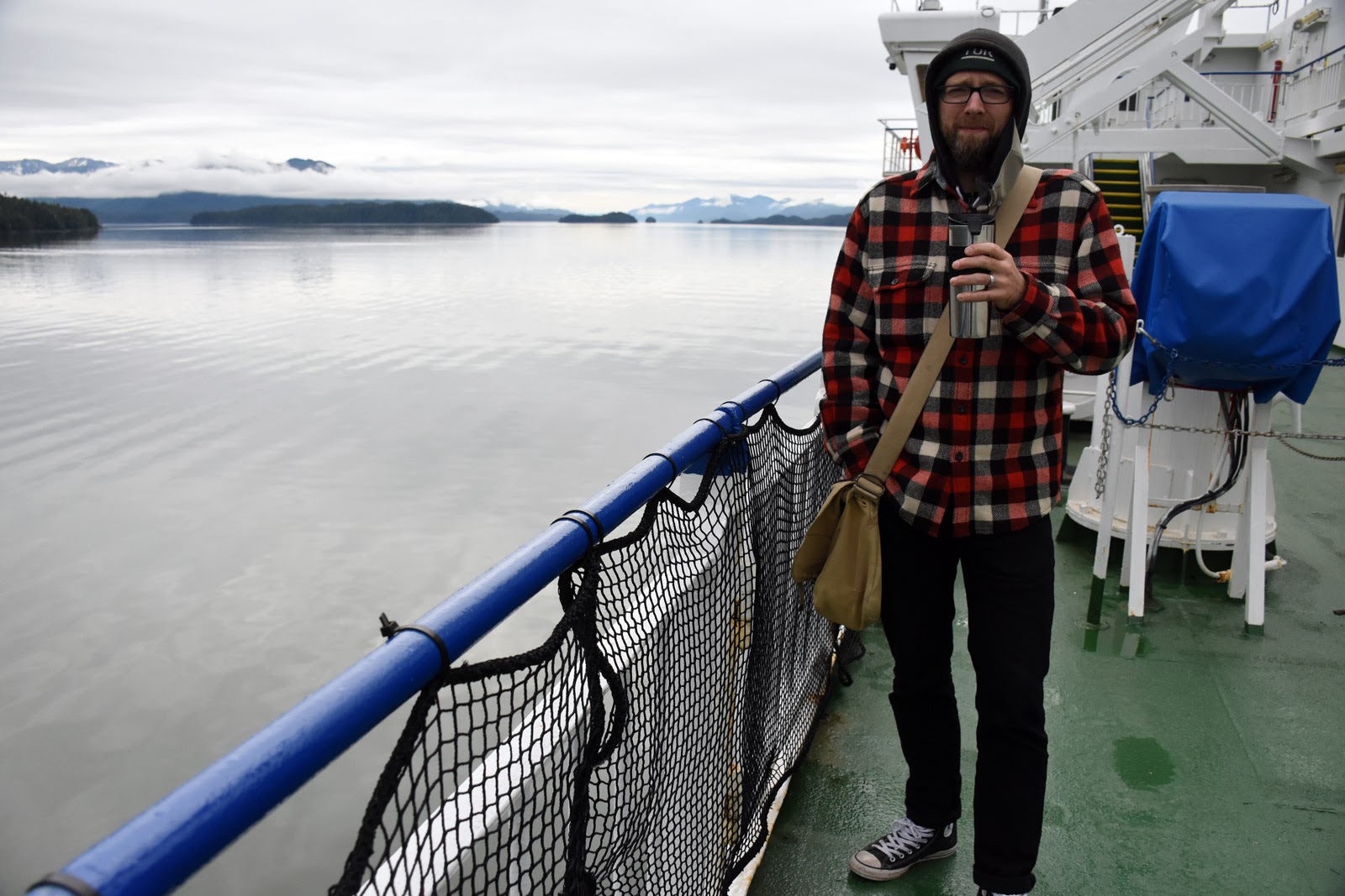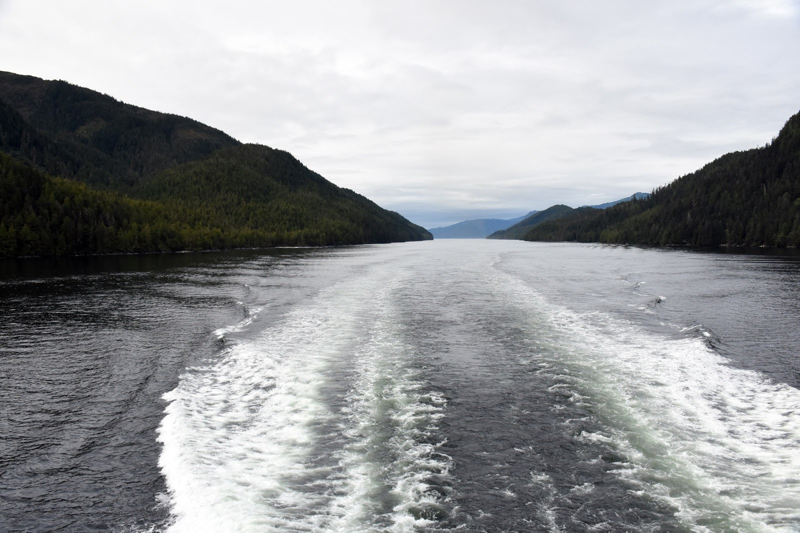 Nous empruntons l’Inside Passage et naviguons lentement entre diverses îles, ce qui nous laisse tout le temps d’observer le paysage : montagnes, forêts, chutes d’eau, on ne sait plus où donner de la tête. D’autant qu’il fait soleil. Nous qui croyons que c’était un mythe… Dommage que les photos ne rendent pas justice à ce qui nous entoure. Et bien sûr, il ne faut pas oublier la faune. Le gentil capitaine fait des annonces lorsqu’il voit quelque chose d’intéressant, et nous avons eu la chance de pouvoir observer des rorquals, une baleine à bosse et… un groupe d’orques! Le premier de notre vie! Un peu loin, il faut le dire. On fera mieux la prochaine fois, mais c’était déjà quelque chose. Après toutes ces émotions, il est temps d’aller rejoindre nos quartiers pour la nuit. Demain est un grand jour : nous débarquons sur l’île.