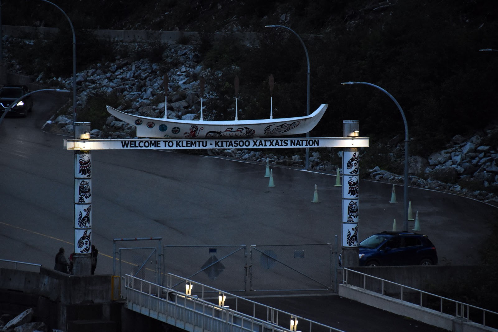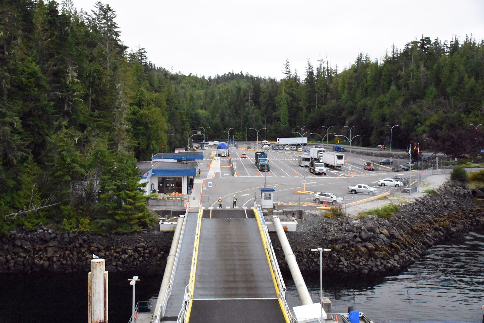 1er septembre : ça y est, on traverse la frontière. Direction Prince Rupert où nous prenons le traversier à destination de Port Hardy le 4. Nous avons un peu de temps, et ce n’est pas plus mal. La remorque est lourde. Du coup, c’est long. Très long. Surtout qu’on connaît la route (c’est celle qu’on a faite en juillet sous la pluie) et qu’il pleut (encore), alors on ne voit toujours rien. On ne peut même pas profiter des paysages. Le soir, on campe en tente, puisqu’Étienne est plein. Inutile de dire que le camping sous la pluie, on adore! Premier arrêt à Terrace, au camping municipal qu’on avait bien aimé cet été. Deuxième arrêt au parc provincial proche de Prince Rupert. Troisième arrêt, tannés de se faire tremper, dans un motel à proximité du terminal maritime. Parfait pour demain puisque nous devons y être à 9 h. En attendant, grand luxe, chambre avec cuisine des années 70, électros bleu turquoise et tout. Une belle expérience.