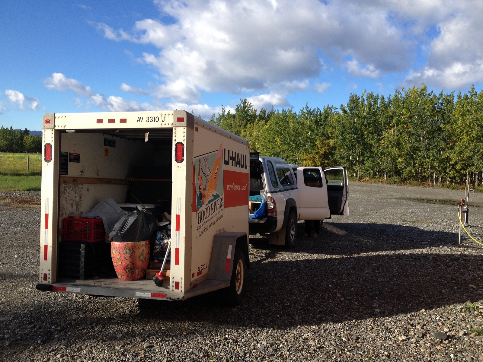 Assez larmoyé. Nous nous sommes élancés vers notre nouvelle vie le 31 août en fin de matinée, Étienne chargé à bloc (tu vois, je t’avais bien dit qu’il faudrait un trailer…), remorque pleine aux trois-quarts (tu vois, je t’avais bien dit que ça rentrerait largement…), après une dernière récolte dans notre potager chéri – ben, quoi, on n’allait pas abandonner nos légumes, quand même.