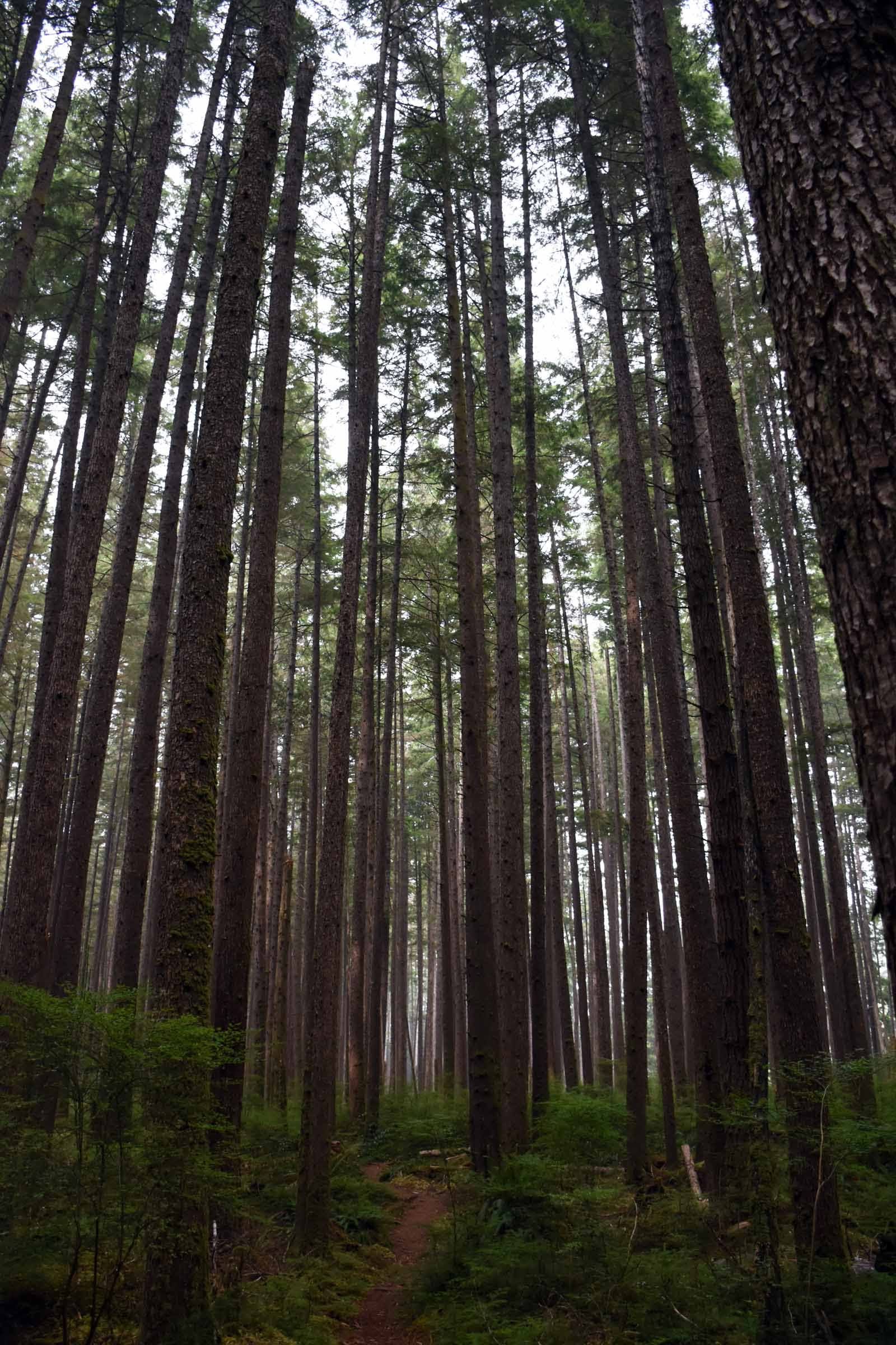 En chemin, nous faisons un crochet vers le petit village de Port Alice, au bord d’un bras de mer. Tranquille et très mignon, c’est le genre de lieu qui nous plaît. Nous reviendrons sûrement admirer le paysage dont nous ne pouvons malheureusement pas profiter à cause de la fumée. Sur la route, nous nous arrêtons pour faire une petite marche dans le parc provincial Marble River : 4,5 kilomètres le long d’une rivière pour aller observer les saumons et admirer des bassins turquoises, c’est tentant. Finalement, ce sont 8 kilomètres dans la forêt avec un petit point de vue sur une chute d’eau (sans saumons) et au bout, une plage (sans bassins).