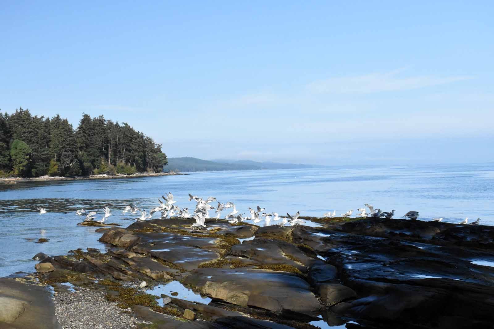 Nous voilà sur l’île Galiano. Située entre Vancouver et l’île de Vancouver, Galiano compte quelques 1000 résidents à l’année, près du double pendant la saison estivale. Cette fine bande de terre d’une trentaine de kilomètres de long et d’au plus six kilomètres de large rime avec nature et quiétude. On ne vient pas sur Galiano pour mener une vie citadine. On y vient pour se ressourcer. Nichés au fin fond de l’épaisse forêt aux arbres immenses, on profite de la vue sur la mer et les îles environnantes. On se promène au bord de l’eau. On se prélasse dans les petites criques. On s’abandonne au temps qui passe.