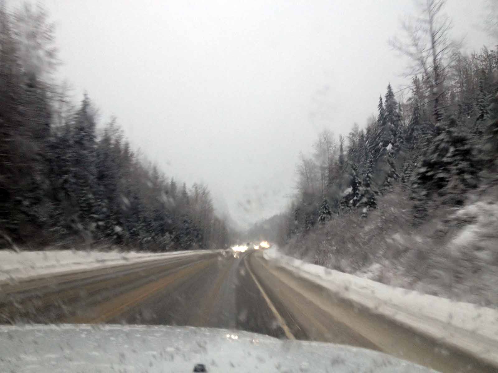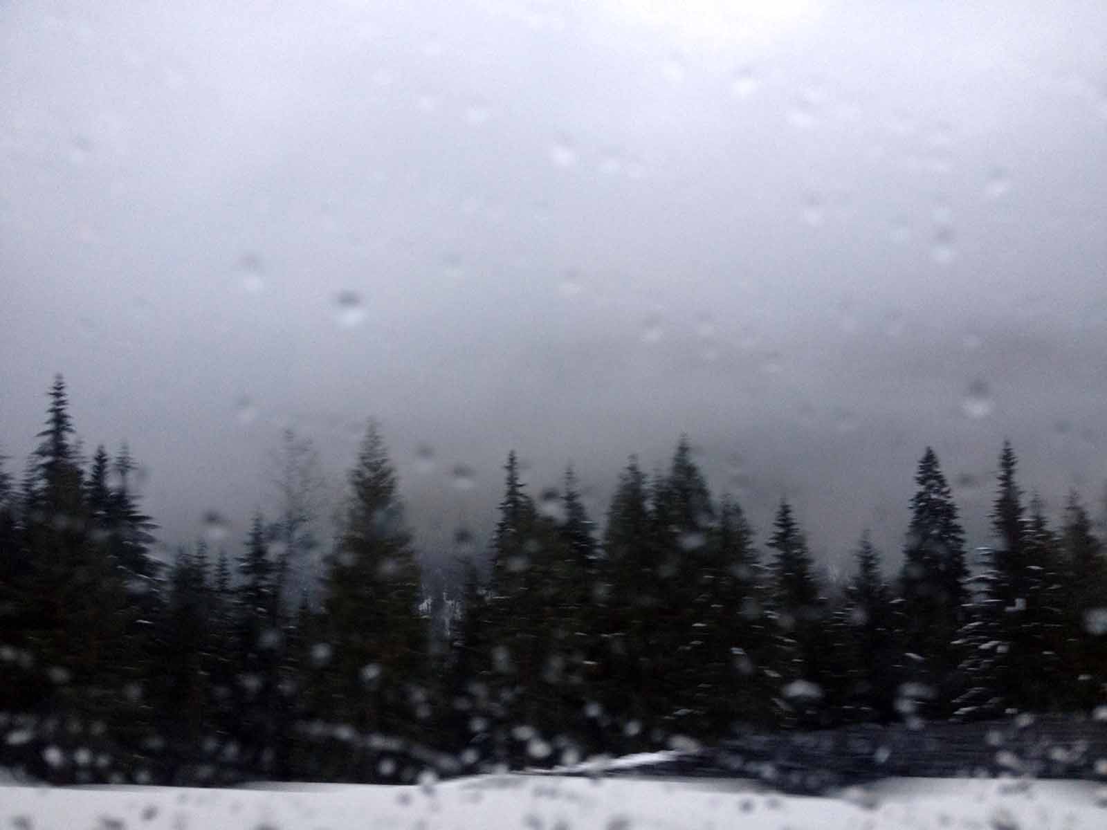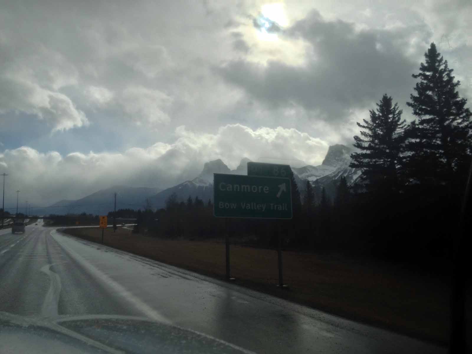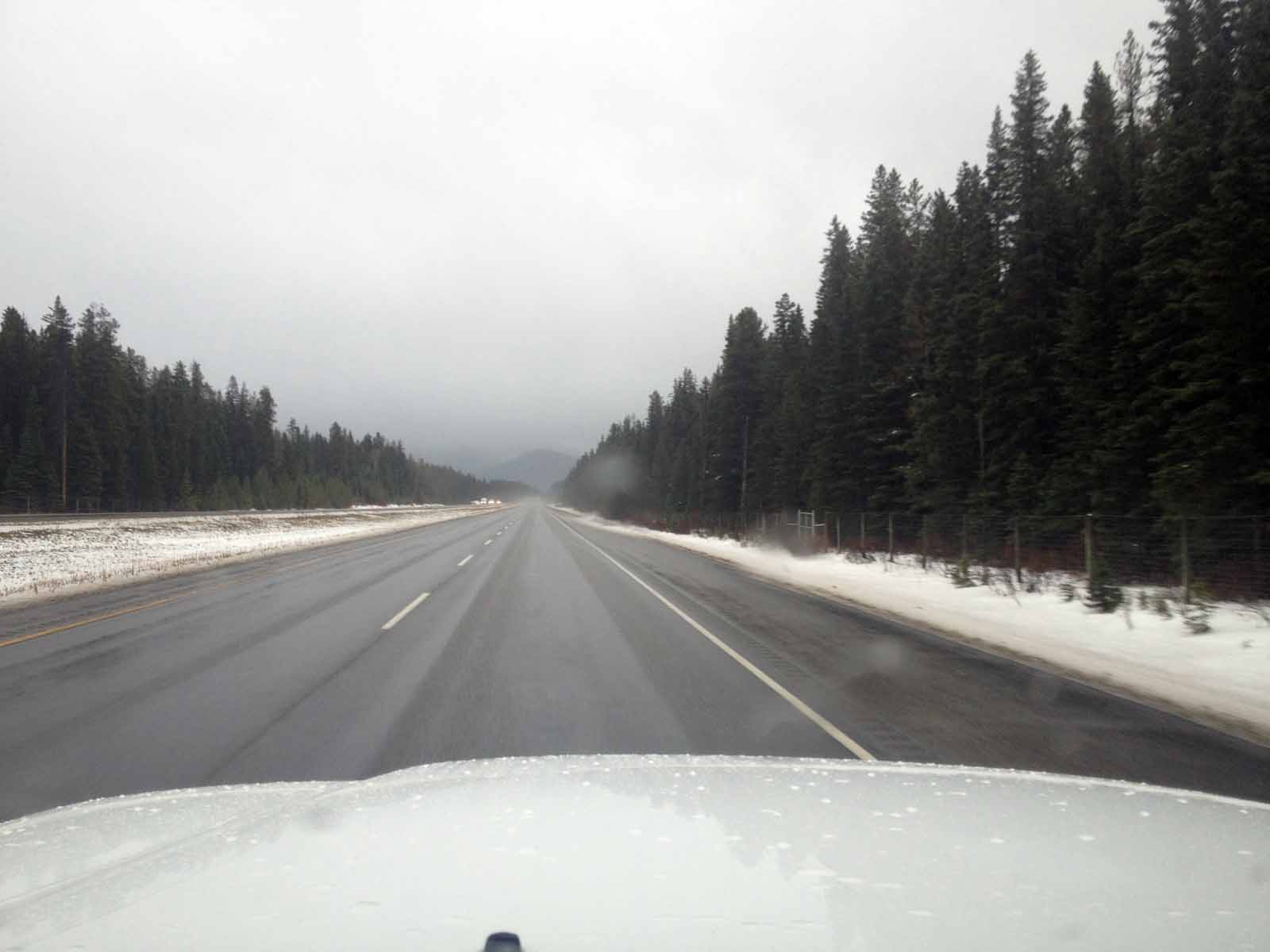 On se lève tôt car des chutes de neige sont annoncées en fin de matinée et on ne veut pas se retrouver bloqués dans le parc Glacier et le terrible col Rogers. L’ascension du col se fait lentement sous une légère neige. Il y a un peu de nous dans cette région ou un peu de cette région en nous… Nous y retrouvons nos bonnes habitudes (ou nos bonnes adresses) et faisons un arrêt ravitaillement à Golden. Direction le Bacchus café pour y déguster un bon café et un bon muffin. Notre arrêt suivant se fera de l’autre côté des Rocheuses, à Canmore, pour un ravito d’essence.