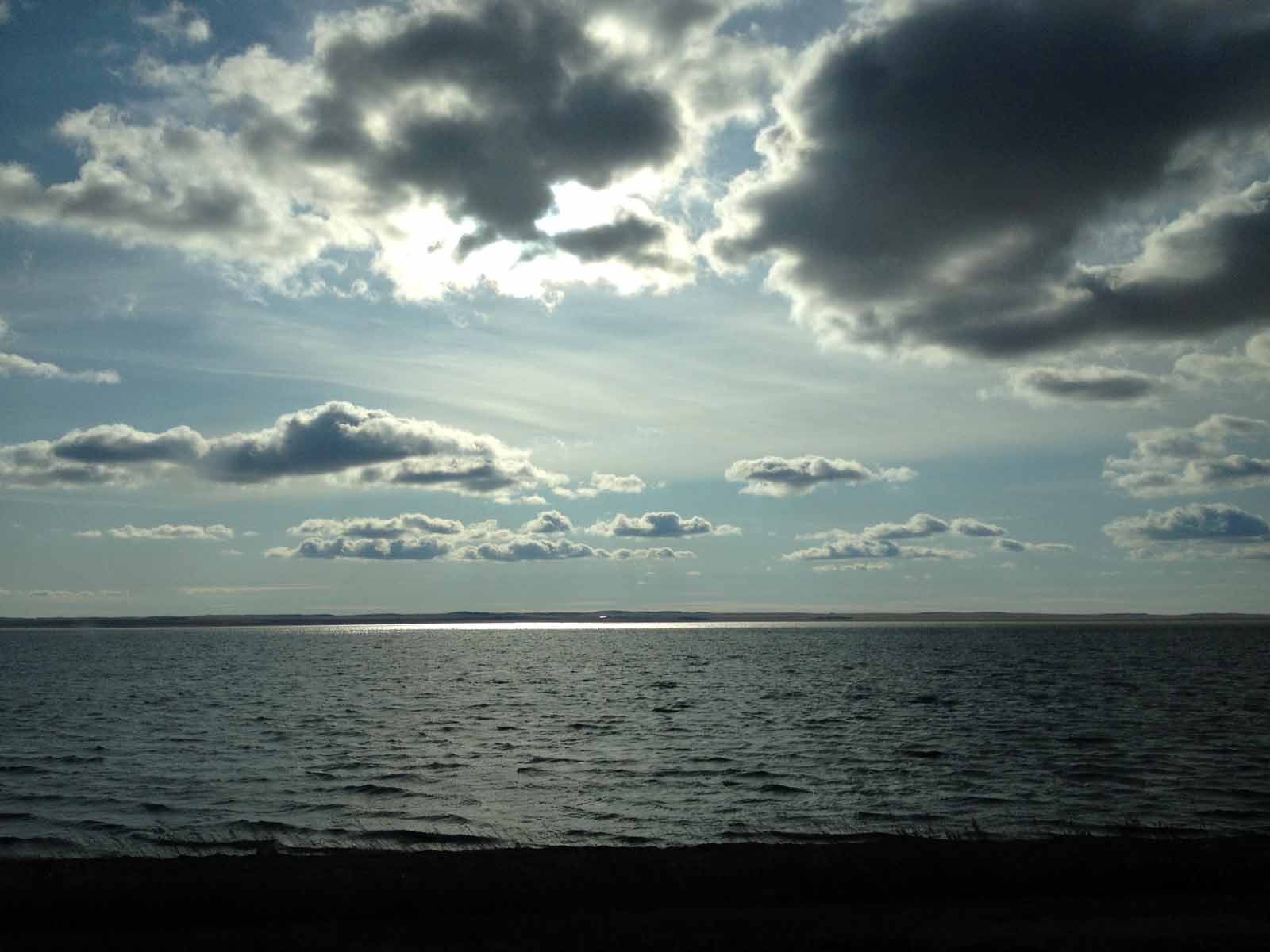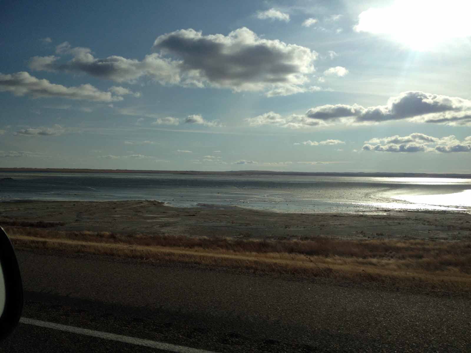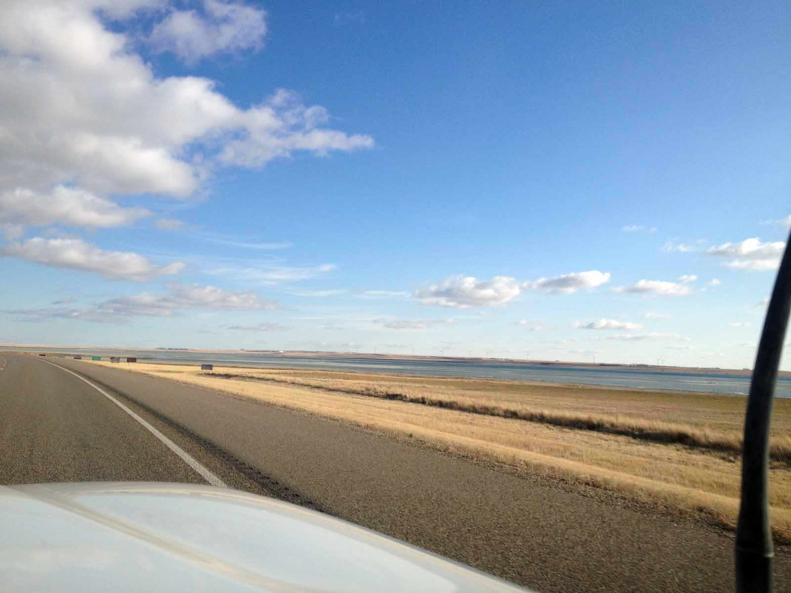 Après une heure d’attente et trente minutes dans l’atelier, nous raccrochons la remorque au cul d’Étienne, la rechargeons et repartons vers midi de Medicine Hat avec quatre pneus gonflés à bloc, prêts à rattraper notre retard. Notre destination est Moosomin, à presque 700 km. Nous y arrivons en soirée. Avec le vent dans le dos (et quel vent!) et la platitude des prairies et des lacs salés, nous avons avalé les kilomètres bien plus vite…