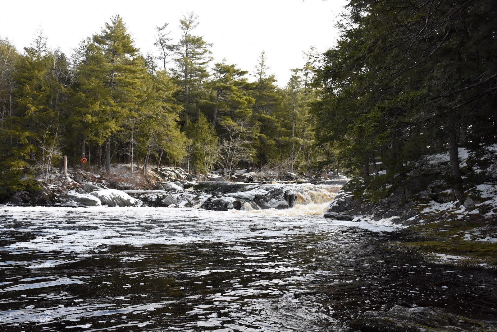 Bref, après avoir admiré les chutes Mills et arpenté le sentier de la rive est, nous reprenons la voiture pour nous rendre à un point de départ qui nous permettra de longer la rive ouest de la rivière. Après avoir marché pendant quelques kilomètres et sans véritable entrain car le trajet semble long sous les bois, nous rebroussons chemin et revenons à notre point de départ.