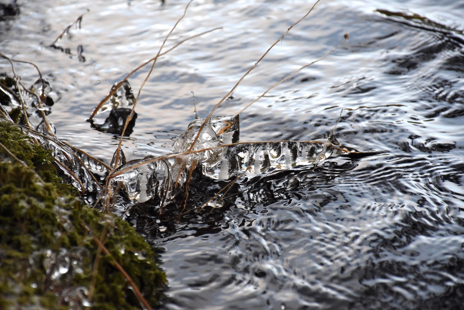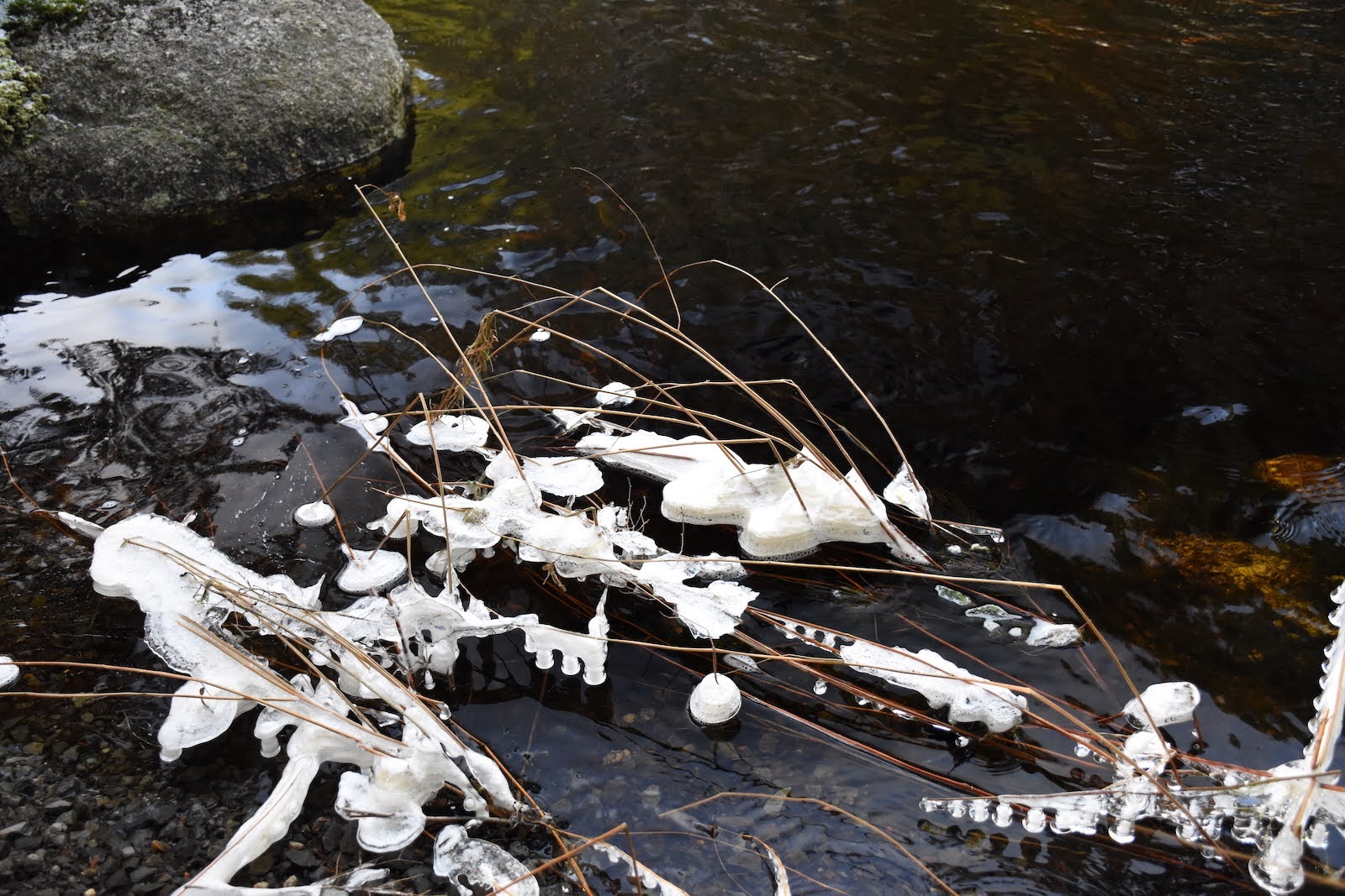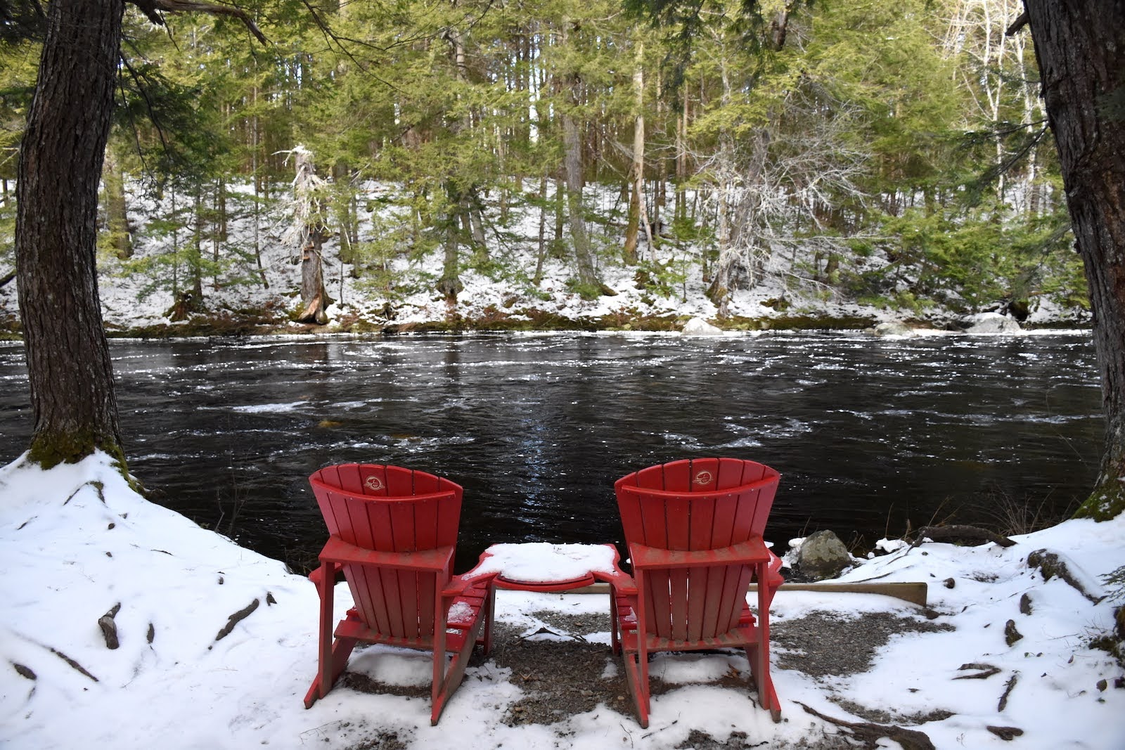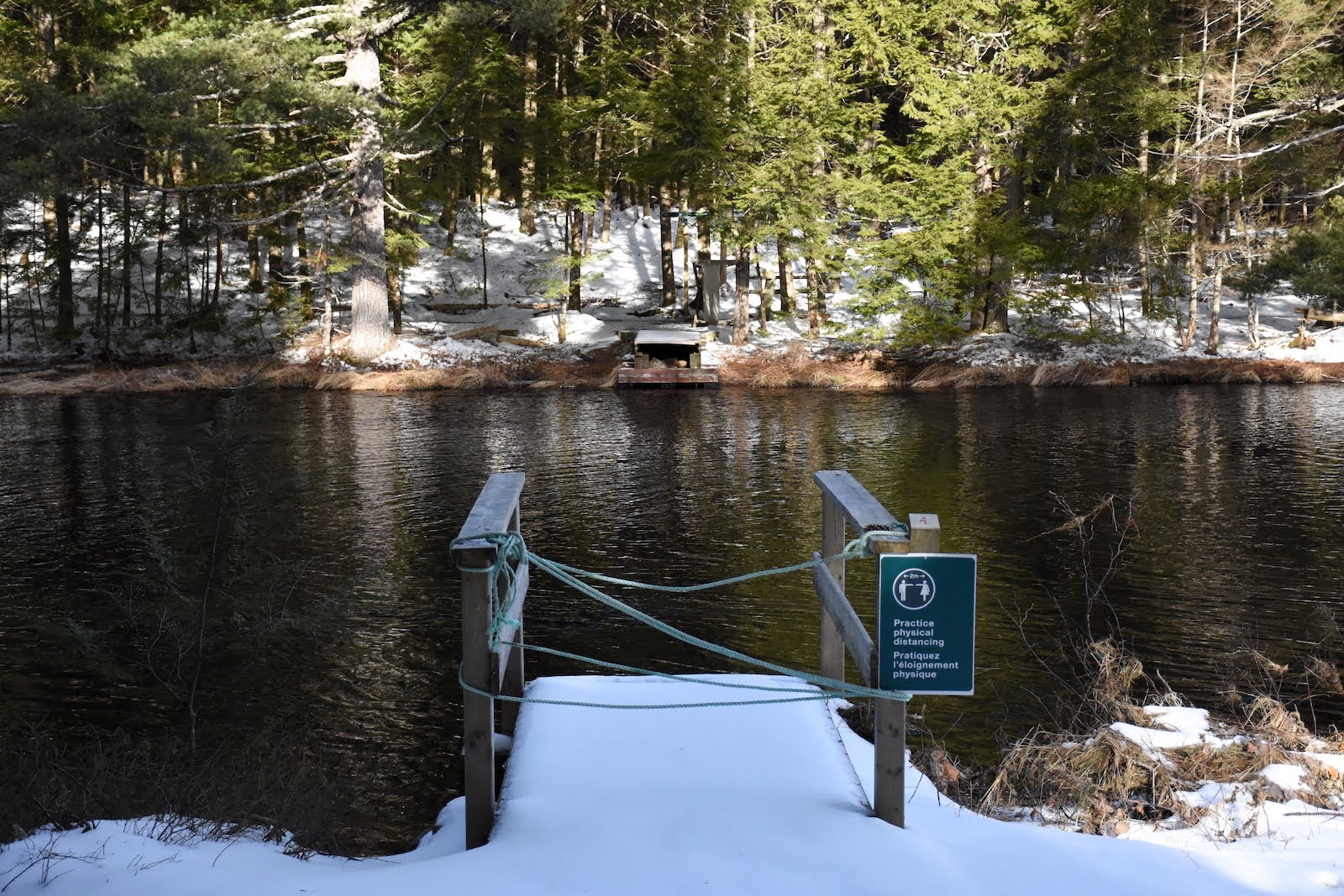 À notre arrivée dans le parc, nous devons nous résigner à laisser les raquettes dans le coffre du pickup car il n’y a pas assez d’accumulation sous les arbres. La boucle de 12 km que nous avons prévue traverse puis longe la rivière Mersey. Malheureusement, le pont n’étant pas assez large pour permettre la distanciation sociale, il a été enlevé. Fier de ma culture cinématographique, je m’écrie : « Si je connaissais le con qu’a fait sauter le pont !«