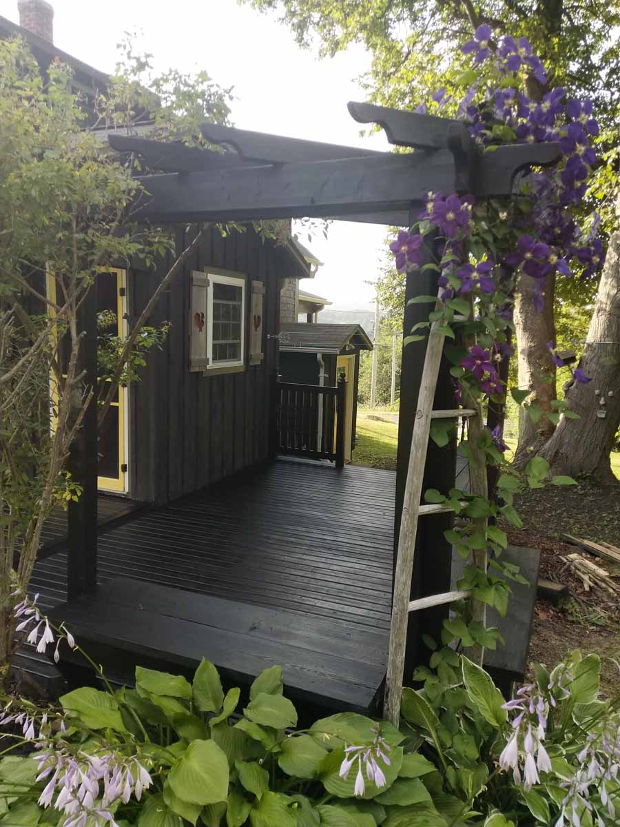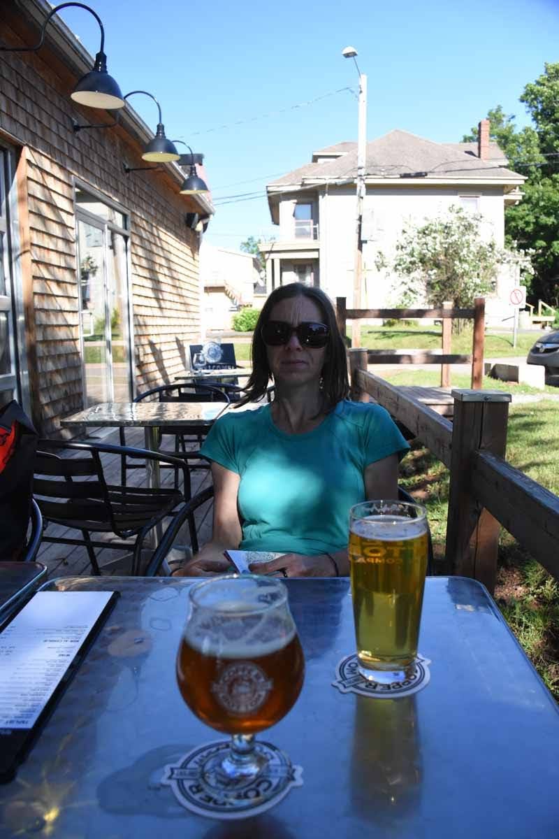 De retour à Souris, on nous annonce une météo exécrable pour le lendemain : 100 % de probabilités de précipitations. Nous décidons donc de faire une halte pour la journée et parvenons à réserver une chambre dans un petit établissement. Et nous avons eu raison. Après quelques coups de pédales sur le sentier en fin de journée et une soirée agréable et ensoleillée dans le jardin de l’hôtel, nous nous réveillons sous des trombes d’eau! Nous voilà donc cloitrés dans notre minuscule chambre à ne rien pouvoir faire. Je tente une sortie pour aller voir les deux-trois boutiques de touristes ouvertes, mais ne tarde pas à rentrer, trempée. La pluie s’arrête enfin en soirée, et après une deuxième nuit à l’abri, nous repartons sur nos montures en direction de l’ouest, après un petit détour dans la région de Montague par un embranchement vers le sud. Nous y passons deux jours très agréables à profiter de l’ambiance de ce village, ainsi que de ses deux microbrasseries.