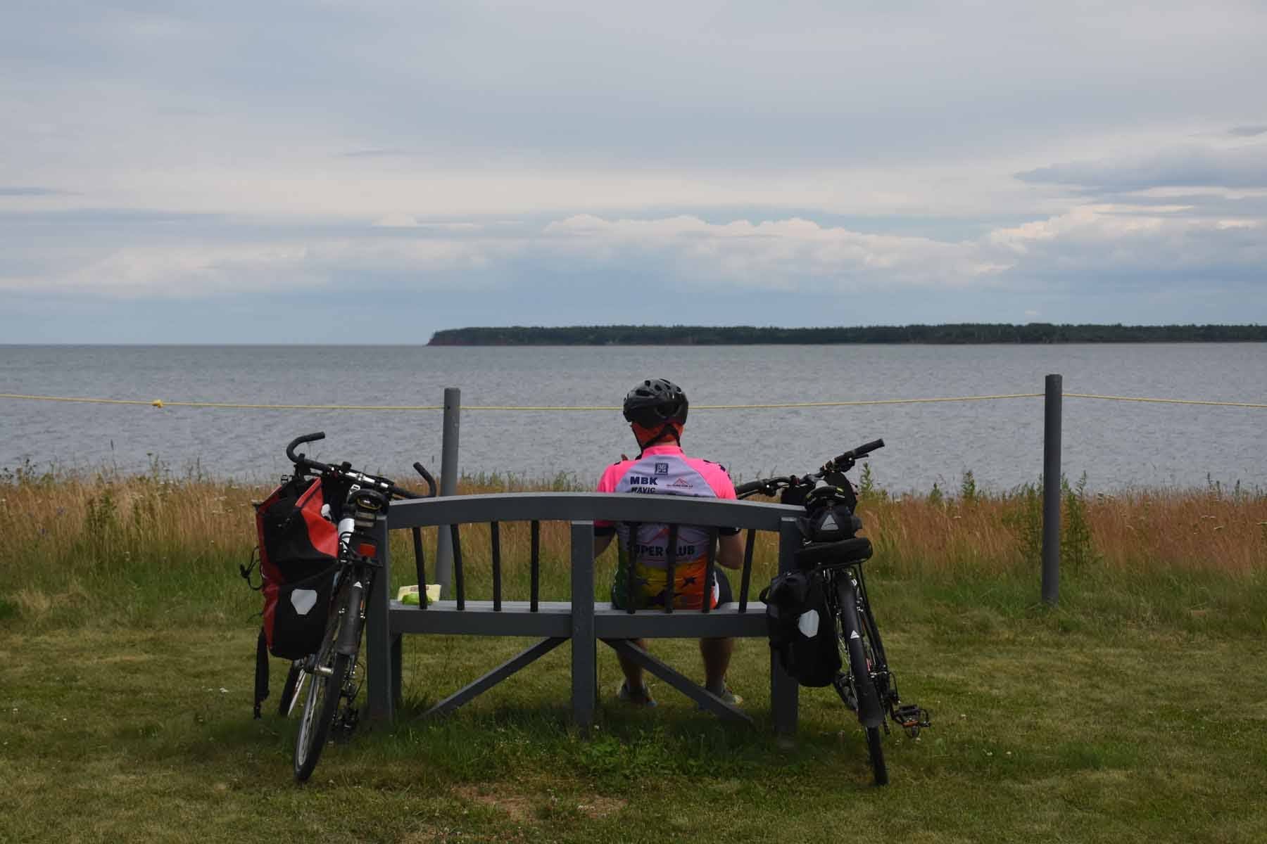Notre amie Johanna nous a accueillis et nous a laissés garer Étienne devant chez elle pendant notre périple. C’est donc depuis Mount Stewart que nous avons pris la route en direction de l’est. L’objectif est de nous rendre à Souris pour prendre le traversier jusqu’aux Îles de la Madeleine, au Québec, et de traverser complètement l’Île-du-Prince-Édouard vers l’ouest au retour. Nous n’avons pas vraiment vu passer la première journée, trop concentrés sur l’adaptation au transport de bagages et l’arrivée à destination suffisamment tôt pour prendre le bateau que nous n’avons pas réservé. Nous y sommes parvenus de justesse : 60 km en 4 h 30. Nous avons ensuite eu largement le temps de nous reposer pendant les cinq heures de traversée avant d’arriver à Cap-aux-Meules vers 19 h et de planter la tente au camping, devant un paysage incroyable et surtout – à la différence de l’Île-du-Prince-Édouard – à l’abri des moustiques! (Eh quoi, vous ne pensiez tout de même pas que j’allais écrire quelque chose pendant l’été sans vous parler de nos amis les moustiques, quand même…) Une bonne nuit de repos nous attend avant les deux prochains jours de découverte des lieux.