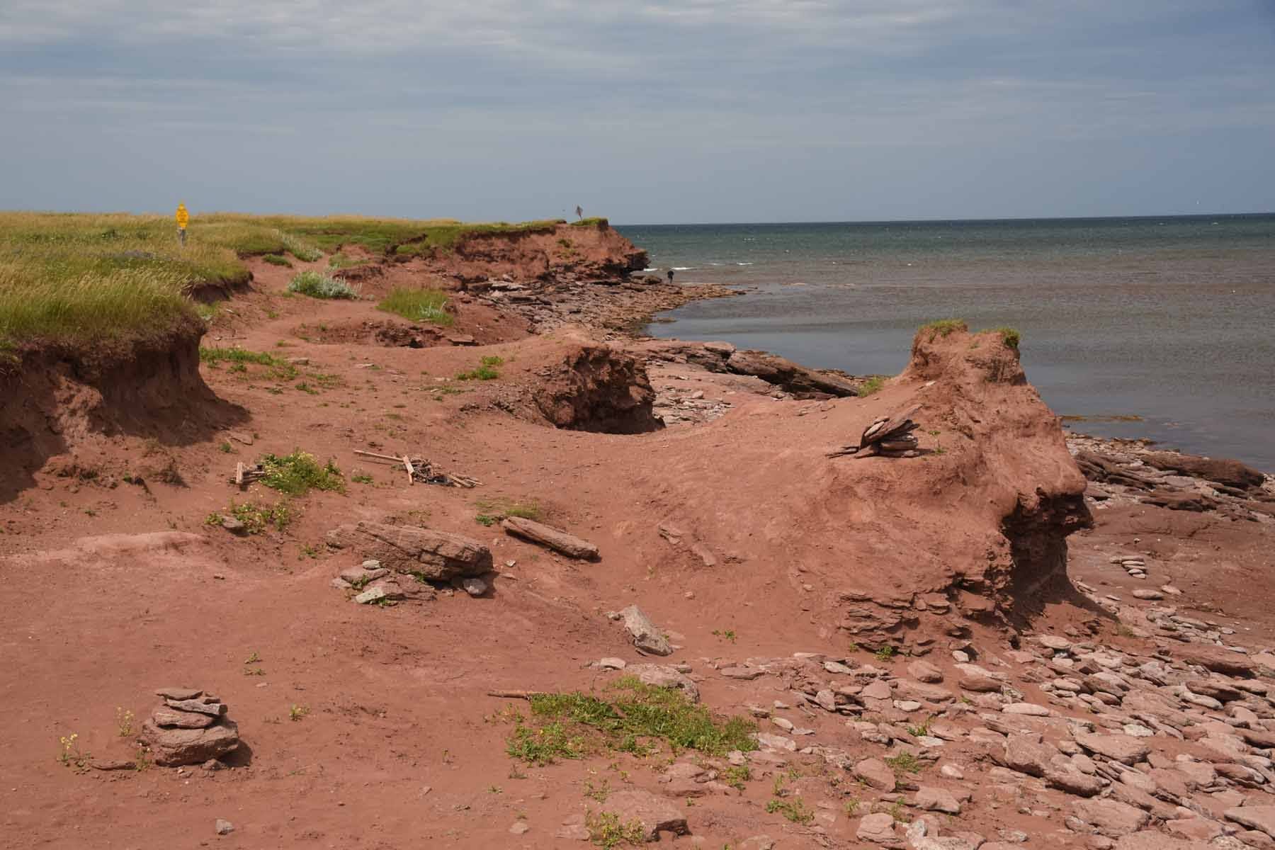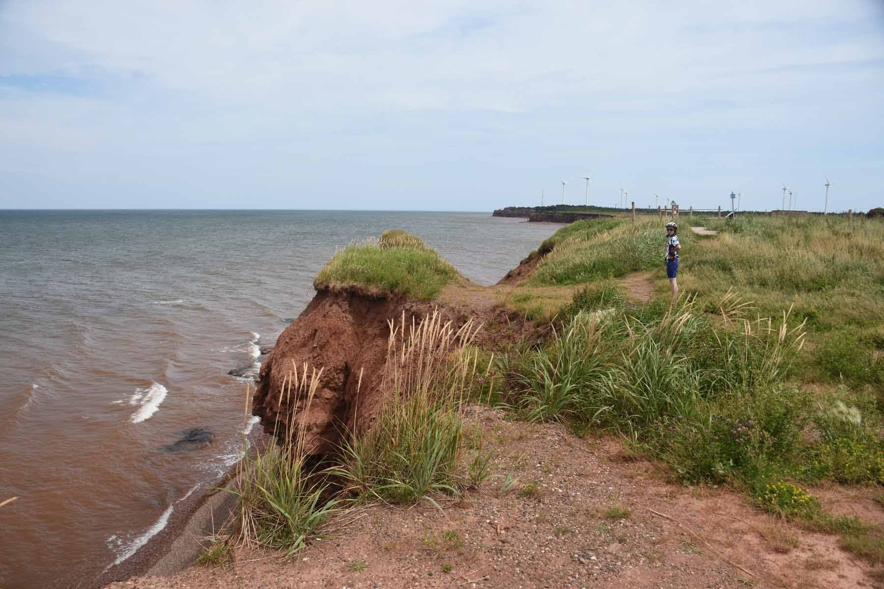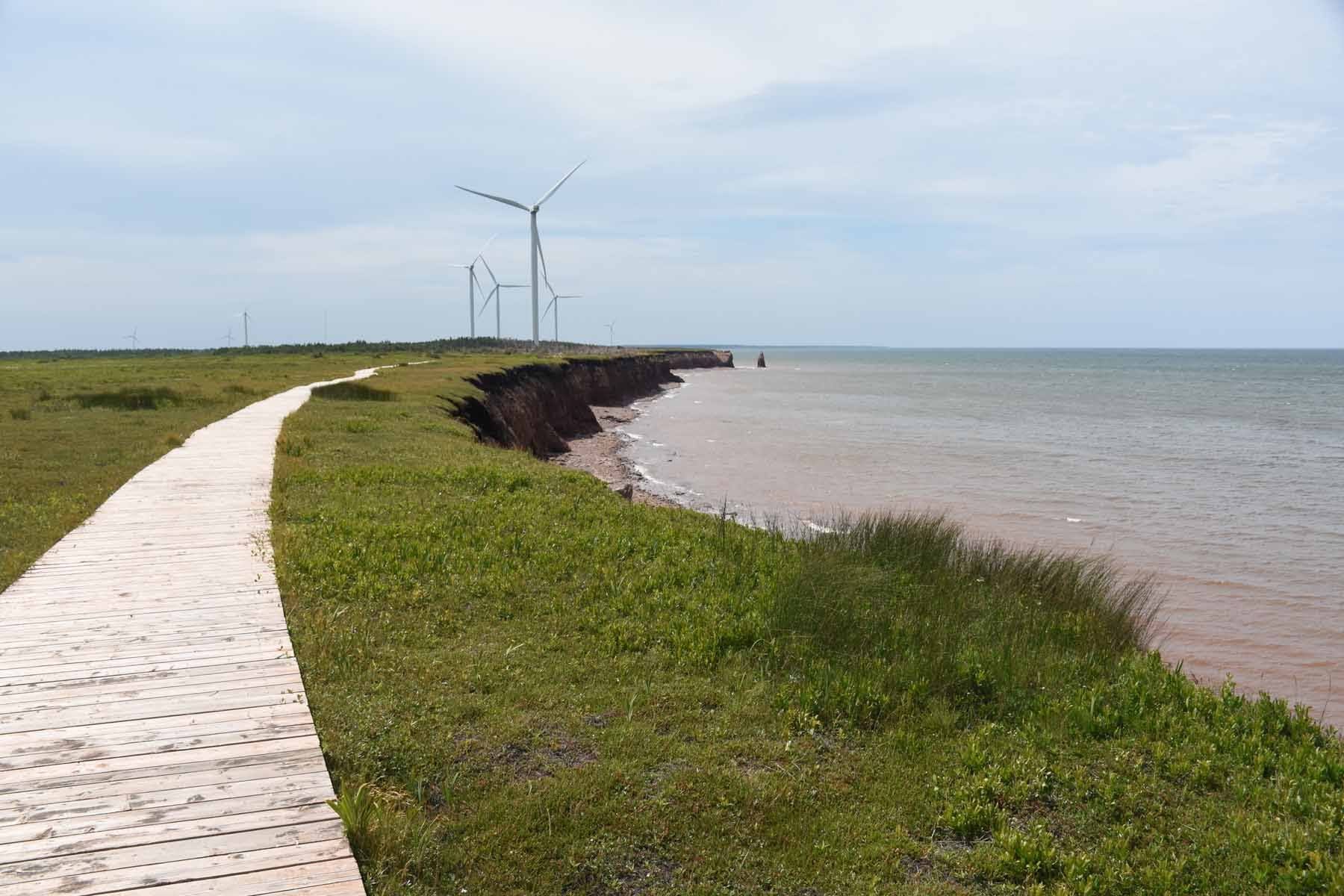 À partir de là, on peut dire que les jours se suivent et se ressemblent. En effet, après notre départ du camping du parc provincial Brudenell, nous n’avons quasiment plus quitté le Sentier de la Confédération, et il faut bien l’avouer : c’était long. Le problème avec les anciennes voies ferrées, c’est qu’elles sont très souvent dans les terres, ce qui fait que point de vue paysages, c’est plutôt monotone. Sachant que l’emblème de l’Île-du-Prince-Édouard, c’est la patate, je vous laisse imaginer ce que nous avons pu admirer pendant des kilomètres et des kilomètres de route. Et ça, c’était quand on voyait quelque chose. Parce que dans l’ensemble, le Sentier est bordé d’arbres. Notez que cela n’a pas toujours été un inconvénient, car les arbres protègent du vent, et nous en avons eu, du vent. Mais quand même, entre une rangée d’arbres ou des champs à perte de vue, j’avoue que nous avons été bien contents de sortir du Sentier et de prendre la route pour rejoindre le parc provincial Jacques Cartier, au nord de l’île. Quel bonheur, malgré la circulation, de rouler sur une surface à peu près plane et d’avoir des choses à regarder pour passer le temps. C’est donc en dehors du Sentier que nous avons sillonné cette partie nord. De toute façon, il ne se rend pas jusqu’à la pointe où nous comptions aller. Un peu de diversité sur cette dernière portion où nous avons pu admirer la côte et découvrir l’Institut d’énergie éolienne du Canada.