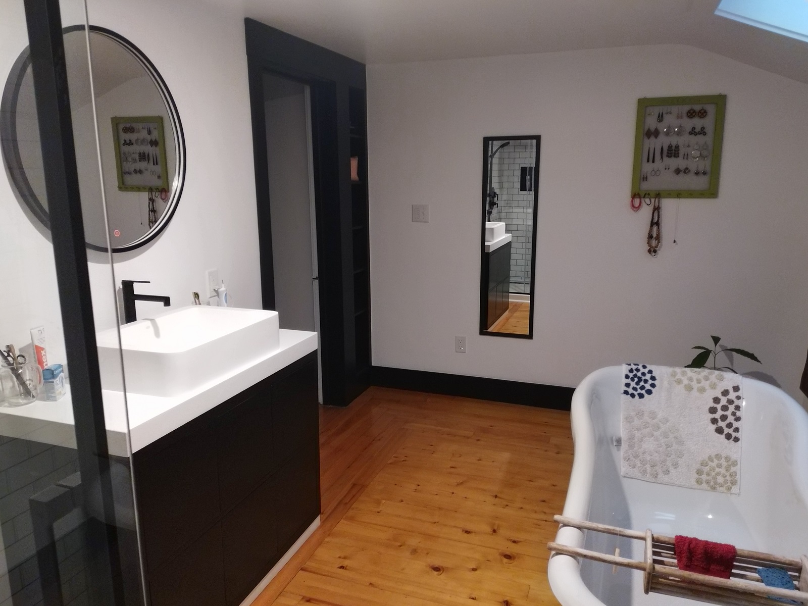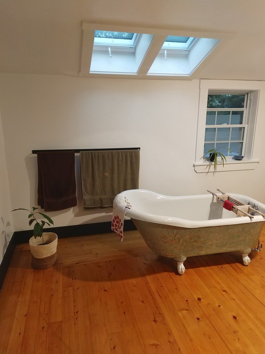 Effectivement. Tout d’abord, et pour conclure le billet précédent : la salle de bains est TERMINÉE!!! Et vous allez rire, mais cela n’est que très récent : la semaine dernière. La douche et le lavabo avaient été installés en avril, et les Vélux sont arrivés à la fin du même mois, si mes souvenirs sont bons. Ou début mai. Non sans mal, mais enfin, c’est fait. Pas tout à fait à notre goût non plus, mais on s’en contentera. J’imagine que par les temps qui courent, il ne faut pas être trop exigeant. Bref, la touche finale a été posée tout récemment, et voilà le travail!