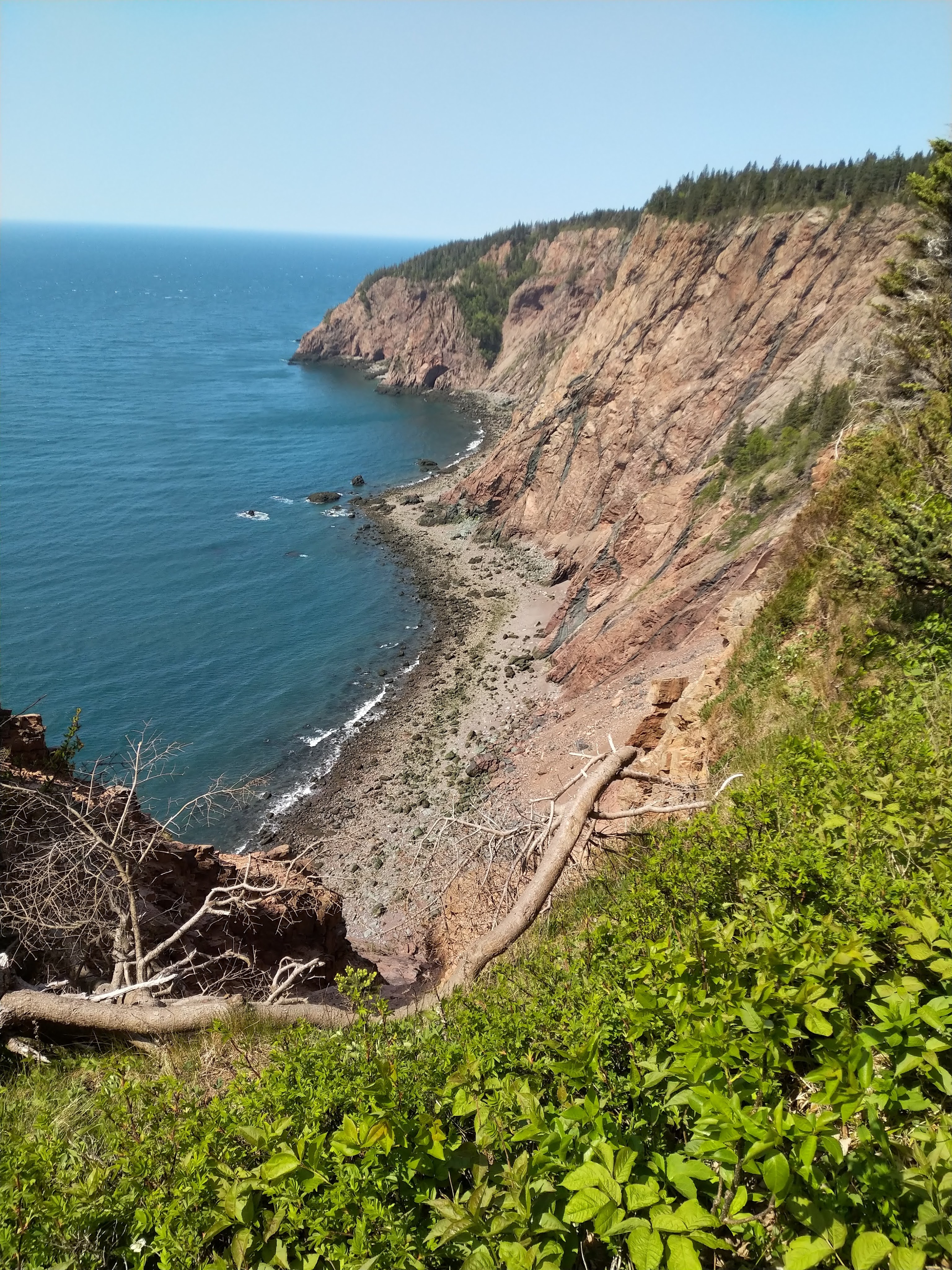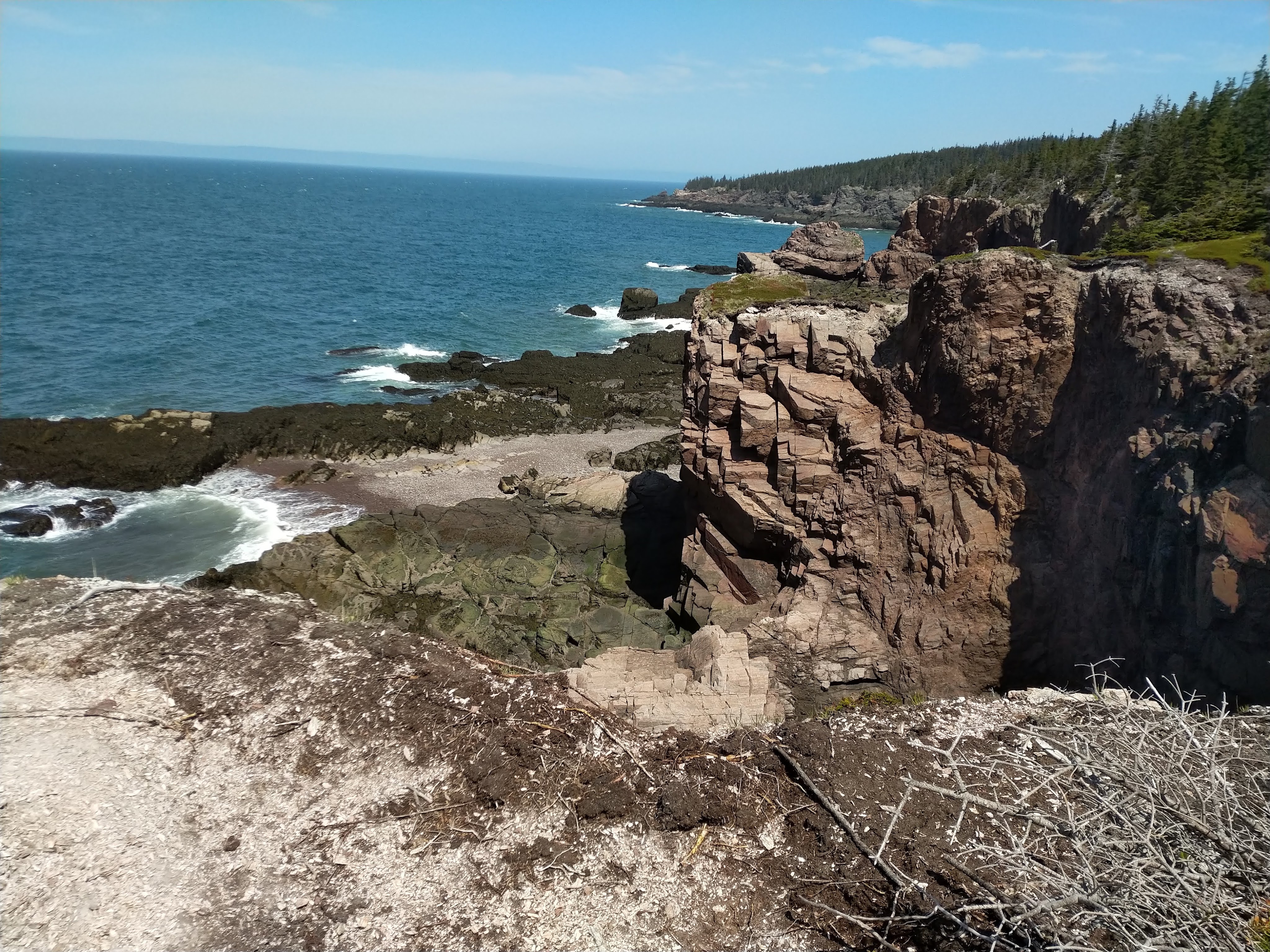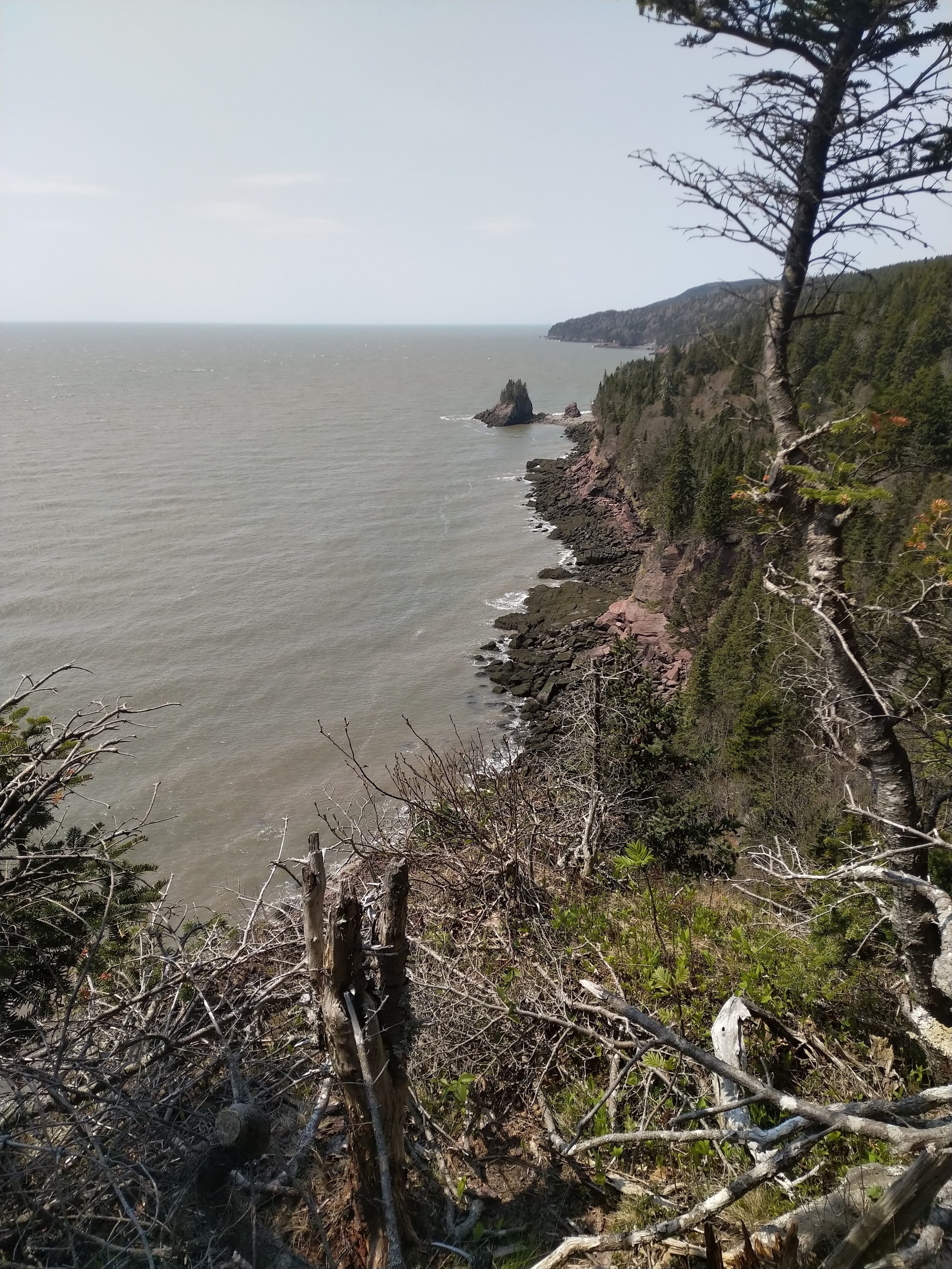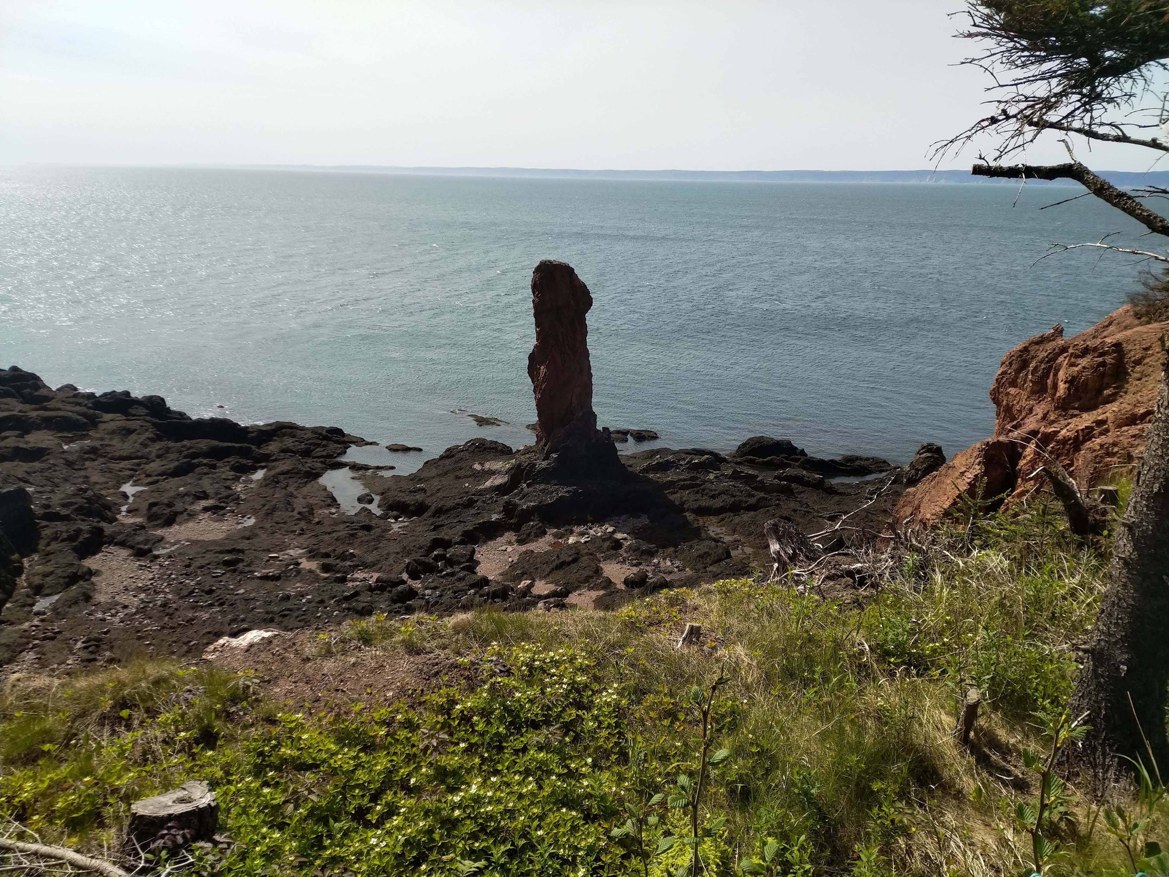 Au début du mois, nous nous sommes offert un weekend à l’auberge d’un vignoble de Grand Pré, à deux heures de chez nous. C’est une région que nous affectionnons particulièrement et c’est toujours un plaisir d’y passer du temps. C’est également dans ce coin que se trouve la randonnée Cape Split. Nous y étions allés peu de temps après notre arrivée en 2020, et avions été bien déçus. Les 8 km de marche sont censés mener à un cap depuis lequel on doit pouvoir voir des rochers pointus séparés de la falaise. Lors de notre dernier passage, les rochers avaient disparu. Nous étions donc restés sur notre faim. En fait, nous n’avions tout simplement pas marché assez loin. Nous avions bien atteint le cap, mais pour voir les rochers, il fallait contourner la falaise principale et se rendre sur une autre pointe à… 50 m de là. Cette fois, nous avons donc pris la décision d’aller jusqu’au bout et d’aller vérifier que les rochers étaient toujours là. C’est quand même le clou du spectacle de cette rando, qui, il faut quand même l’avouer, est un peu longue et monotone. Bref, pour faire court, veni, vidi, vici. La rando n’est toujours pas palpitante, mais les cailloux sont toujours là. Et on ne refuse jamais un pique-nique au soleil au bord de la mer. Mais c’était la dernière fois.