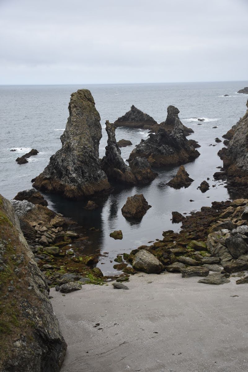 De là, nous reprenons la route jusqu’à la Pointe des poulains. Ne nous étant pas renseignés avant, nous découvrons que l’actrice Sarah Bernhardt, qui adorait ce lieu, s’y était fait construire deux maisons (une pour elle et une pour ses enfants), et qu’elle avait pris ses dispositions pour se faire enterrer dans cet endroit. Cela ne se produira pas puisqu’elle repose au Père Lachaise. Toujours est-il qu’elle avait bien choisi. C’est vraiment magnifique!