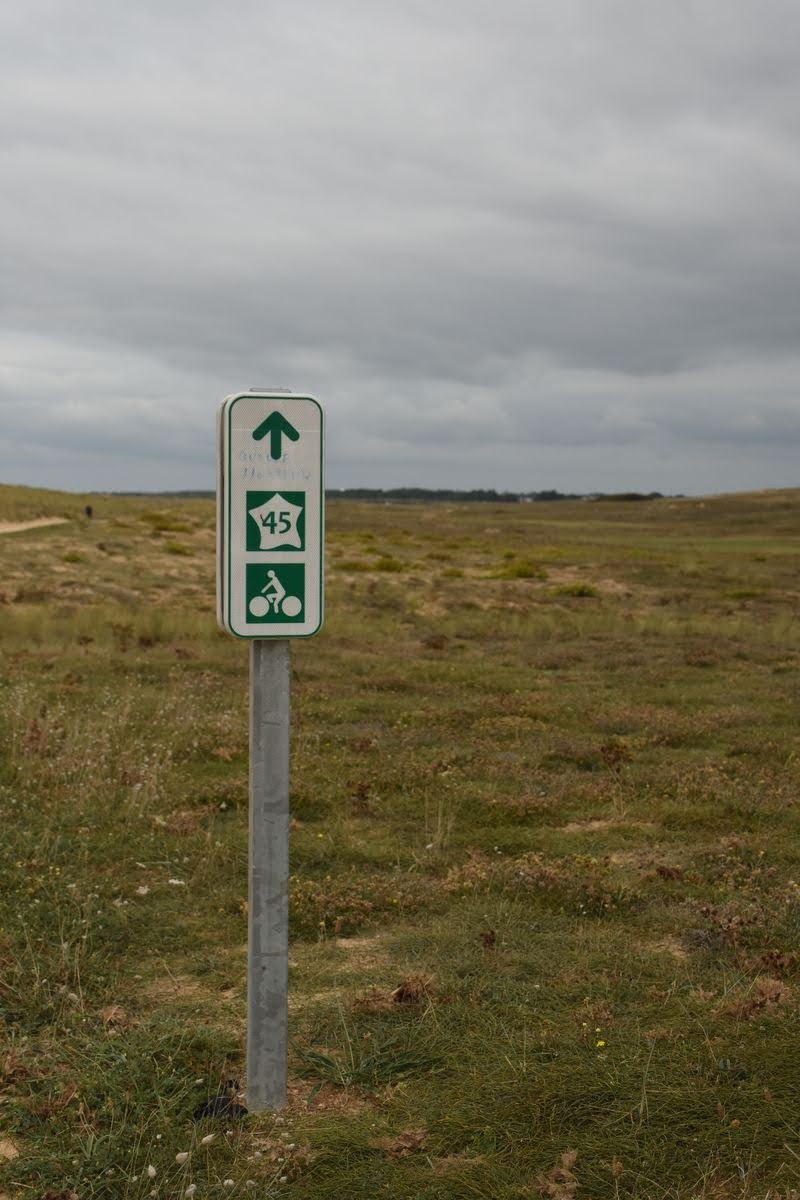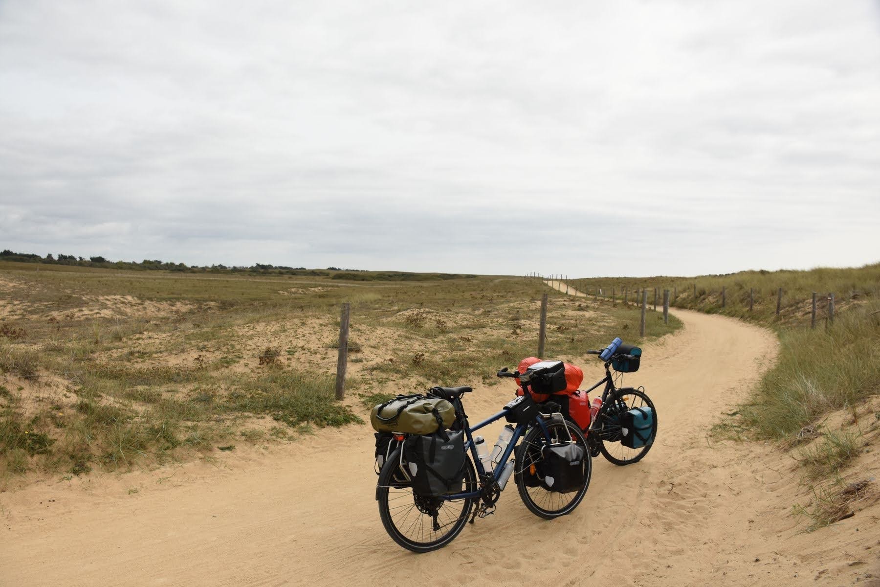 Nous roulons donc jusqu’à Étel, où nous prenons notre pause déjeuner. C’est là que nous bifurquons officiellement sur la véloroute 45, la Vélocéan, et entrons dans la presqu’île. Nous longeons alors les dunes d’Étel et de longues plages de sable. Le terrain n’est pas facile, car rouler sur du sable à vélo, ce n’est pas évident. Mais le paysage est magnifique et ça en vaut la peine.
