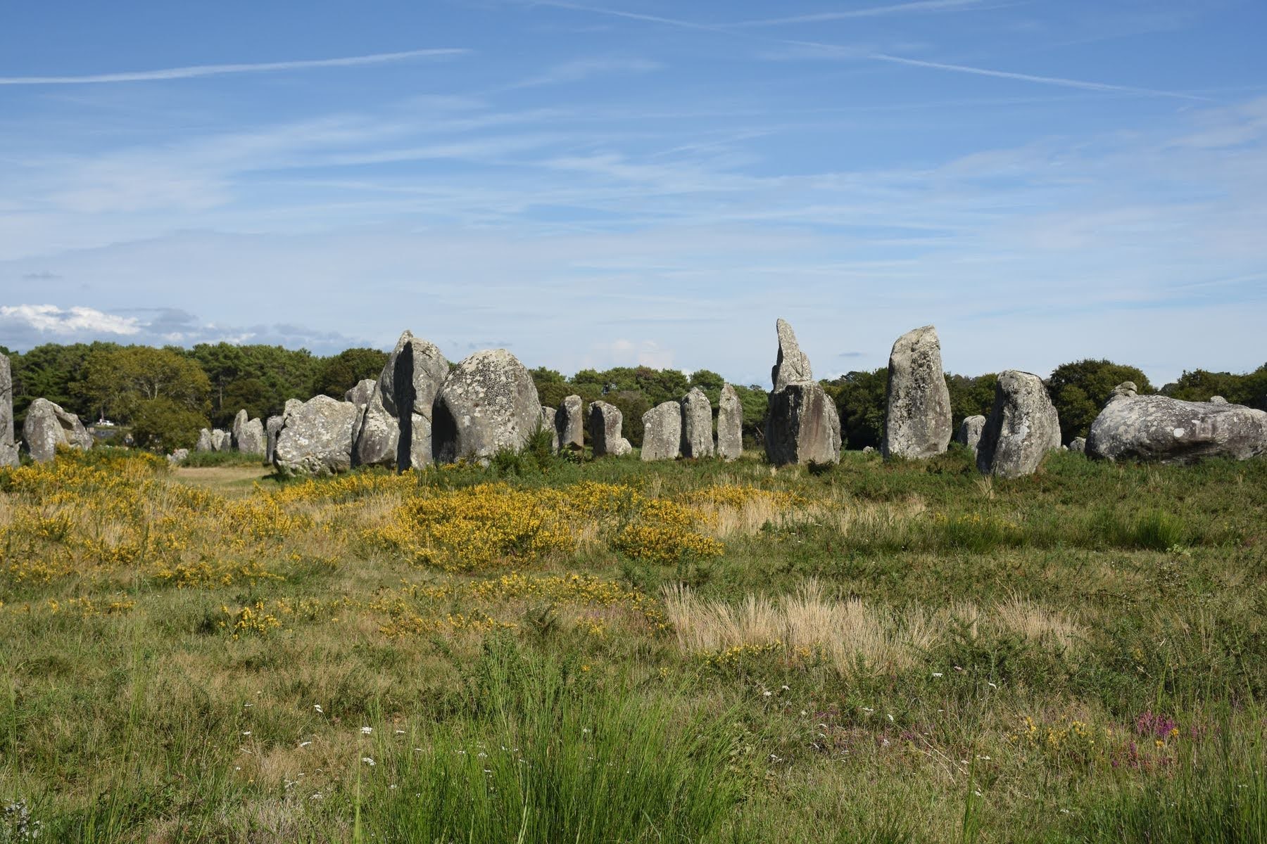 Nous remontons la presqu’île en sens inverse et arrivons à Carnac en fin de matinée. La visite guidée n’étant qu’à 15 h, et le soleil étant revenu, nous avons amplement le temps de sortir toutes nos affaires sur l’aire de pique-nique et de faire sécher tout ça. Nous avions presqu’oublié l’intensité de la pluie du matin et avons été impressionnés par la quantité d’eau que nous avons vidée du sac de la tente. Mais passons. L’heure de la visite arrive et nous suivons donc la guide qui nous présente les impressionnants alignements de menhirs. Nous ne voyons pas tout, ils s’étendent sur plus de 4 km, pour ce qu’il en reste. Mais nous en observons d’autres après la visite. C’est vraiment impressionnant d’imaginer que ce sont des hommes qui ont déplacé et levé ces pierres.