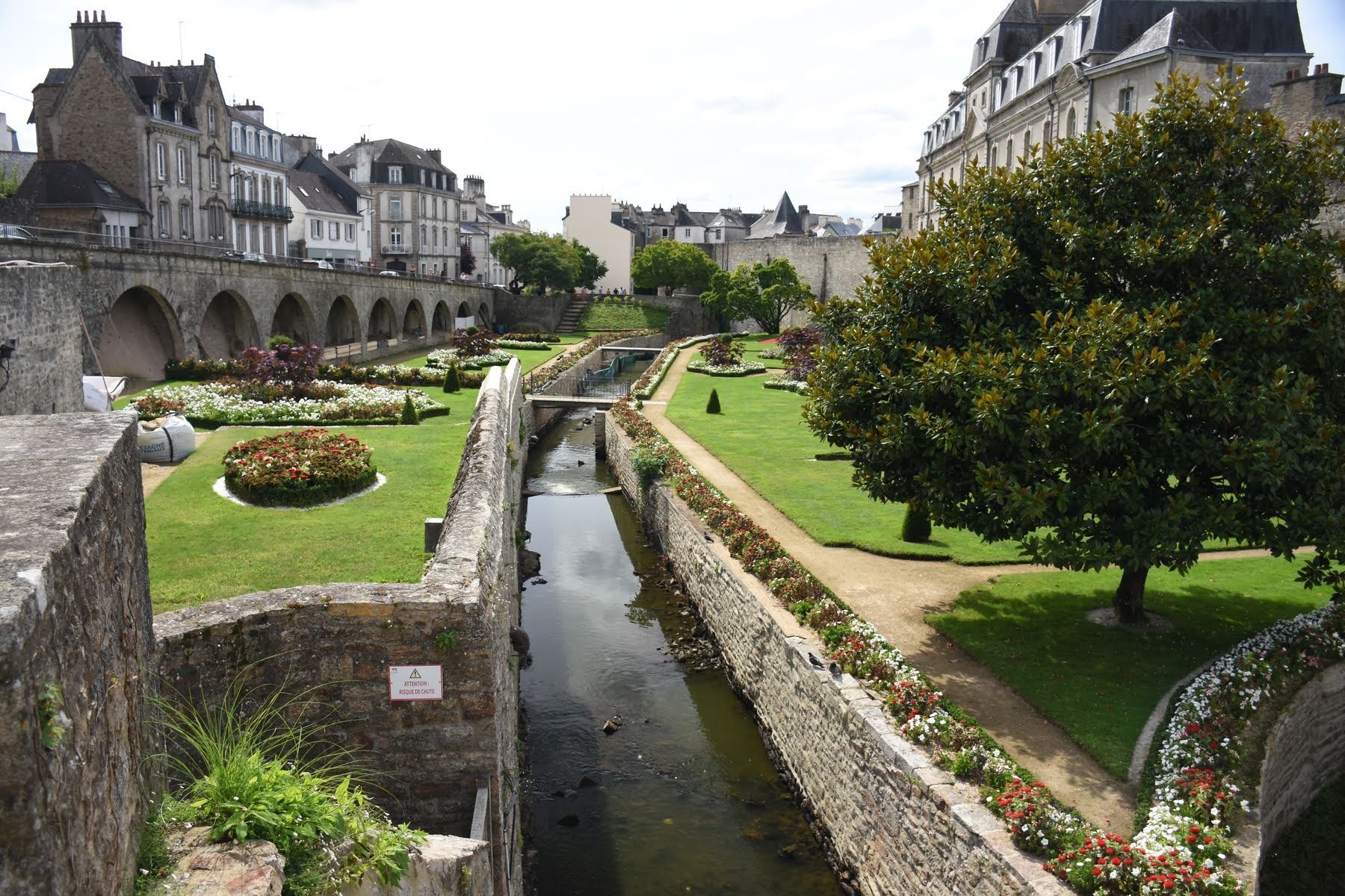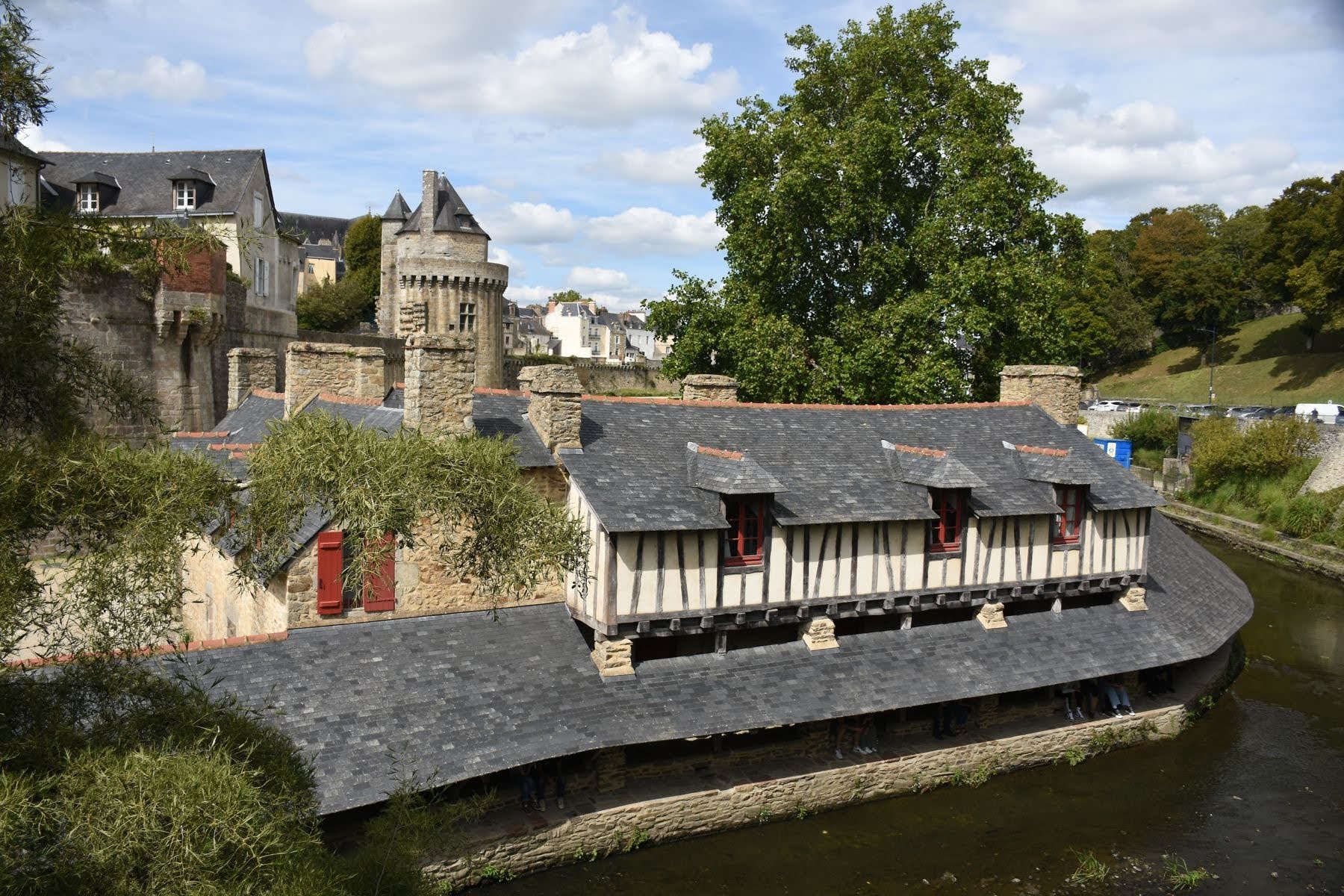 Ce matin, nous prenons notre temps. Mais vraiment. Nous devons absolument faire une lessive et avons décidé de faire cela au camping avant de partir pour Vannes notre première étape prévue pour la journée. Cela nous occupe une bonne partie de la matinée, ce à quoi s’ajoute la première crevaison du voyage, pour moi bien sûr. Elle date de la veille, mais je ne m’en étais même pas rendu compte. Stéphane passe donc un certain temps à essayer de trouver la fuite et à remplacer la chambre à air. Bref, nous partons tard, mais vu la distance, nous arrivons rapidement à Vannes où nous pique-niquons au pied des remparts. Puis nous réfléchissons et nous disons que quitter Vannes, cette très belle ville, sans même en avoir fait le tour serait vraiment une erreur. Après tout, nous ne sommes pas pressés, et surtout, nous sommes en voyage, ce qui signifie que nous faisons du tourisme. Il ne faudrait pas que nous perdions cela de vue.