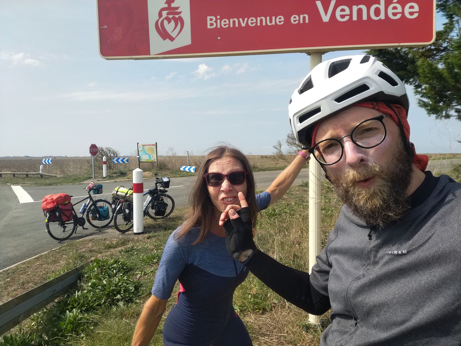 La traversée de la Loire est pour nous le signe que nous nous dirigeons vers la Vendée, et plus précisément vers Saint-Hilaire-de-Riez où nous ferons une petite pause-famille. Pour y arriver, nous parcourons nos derniers kilomètres bretons et faisons une halte à Pornic – prévue au départ, mais finalement forcée, car un arrêt d’urgence à Décathlon s’est imposé pour cause de… pédalier qui ne pédale plus sur le vélo de Stéphane. Sortant du Décathlon de Saint-Nazaire pour une réparation, disons que devoir marcher 5 km en poussant le vélo jusqu’au magasin n’a pas été des plus agréables. Cette fois-ci, le plateau frotte contre la fourche arrière… Décidément, le Touring 520 commence à taper sur les nerfs.