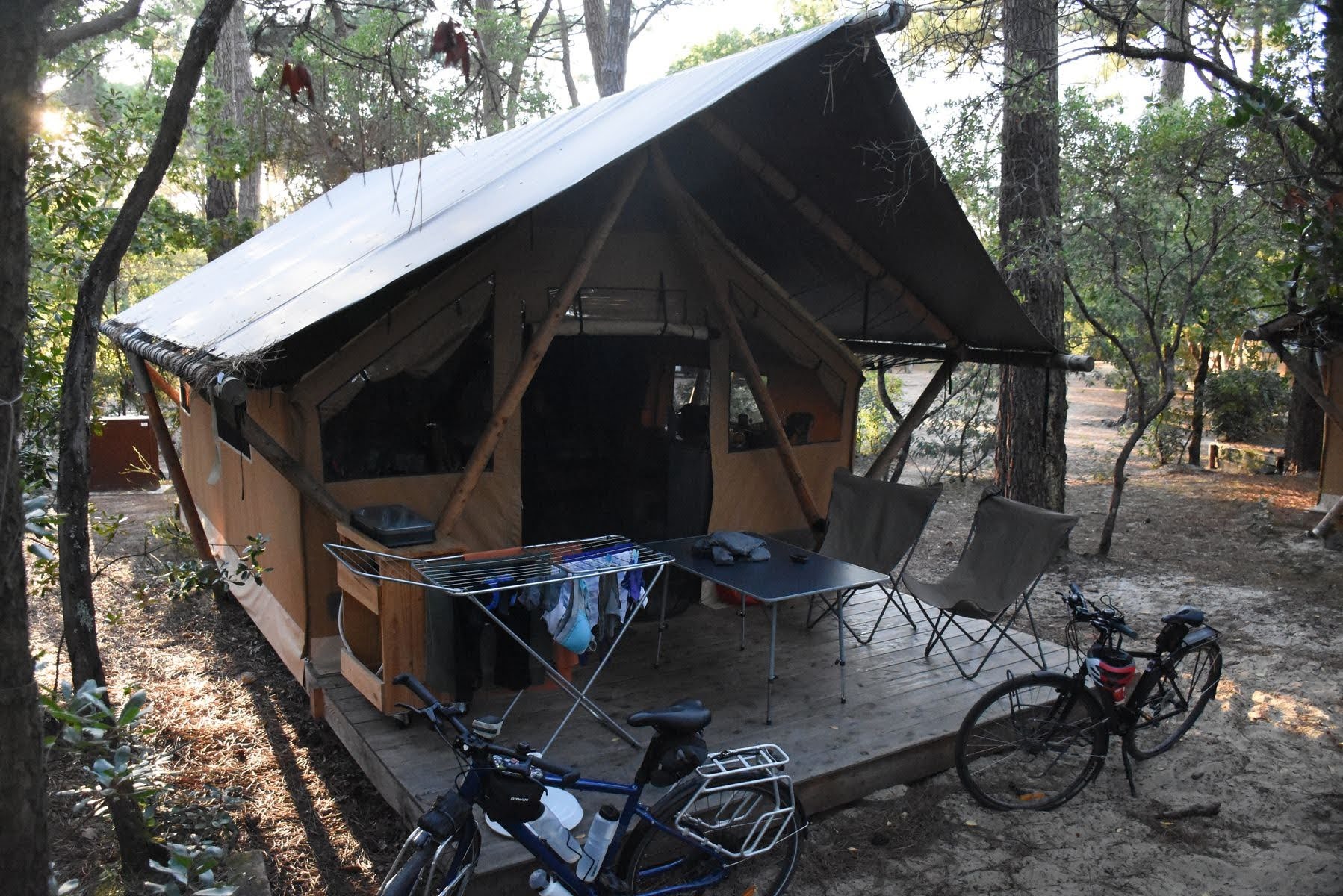 Nous embarquons ensuite sur un petit rafiot qui nous fait traverser le bassin et débarquons dans la ville d’Arcachon en fin de journée. Nous souhaitons y rester jusqu’au lendemain pour visiter, mais pas facile de s’y loger comme on veut. Il n’y a qu’un camping, et les tentes n’y sont pas acceptées. Nous choisissons l’option qui nous est offerte : la tente prospecteur. On a presque l’impression d’être de retour à la maison.