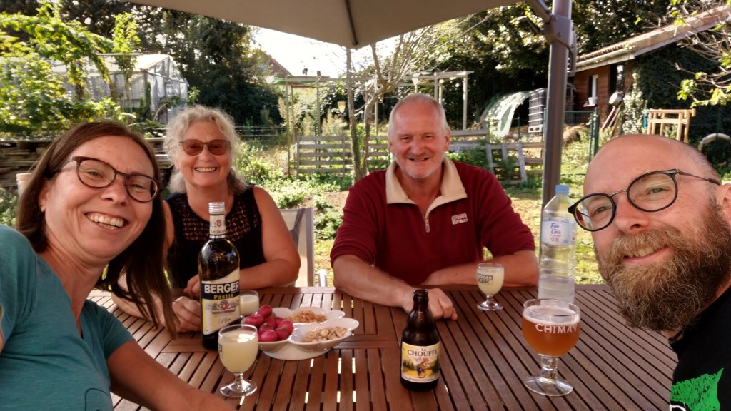 Nous quittons Pau en direction de l’Ouest, par la voie verte V81, la Véloroute du Piémont pyrénéen. Nous longerons le gave de Pau, puis l’Adour, avant de retrouver l’océan Atlantique. Mais avant, nous faisons un petit détour et entrons au Pays basque par Espès-Underein, près de Mauléon, où nous retrouvons ma tante Pascale et mon oncle Didier. Nous ne nous sommes pas vus depuis plus de 20 ans, autant dire que nous avons des choses à nous raconter! Nous sommes accueillis comme des rois dans la maison qu’ils ont construite à la force de leurs bras et passons un très bon moment en leur compagnie.