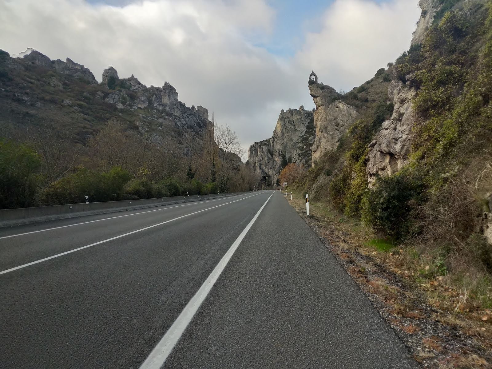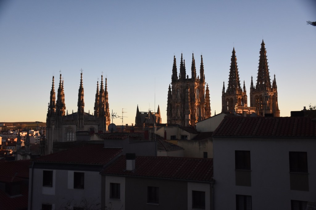 Deuxième étape : Briviesca-Burgos. Tout en montée, toute la journée. Nous avons même passé un col à 1 000 m d’altitude (nous partions de 400 m, mais chut. Et c’était quand même dur.) Et il a plu, tout le temps. Et le paysage était pour le moins monotone. Et encore une fois, ça caille, nos orteils sont gelés. Arrivés en haut du col, on s’arrête au café-restaurant-hôtel-épicerie ouvert pour prendre un café, se réchauffer les pieds et attendre que la pluie passe. La première chose que nous faisons à Burgos est de chercher un magasin de vélo qui vende des couvre-chaussures. Nous finissons par trouver et croisons les doigts pour que ce soit efficace.