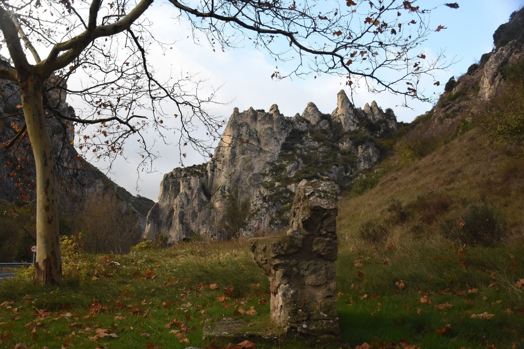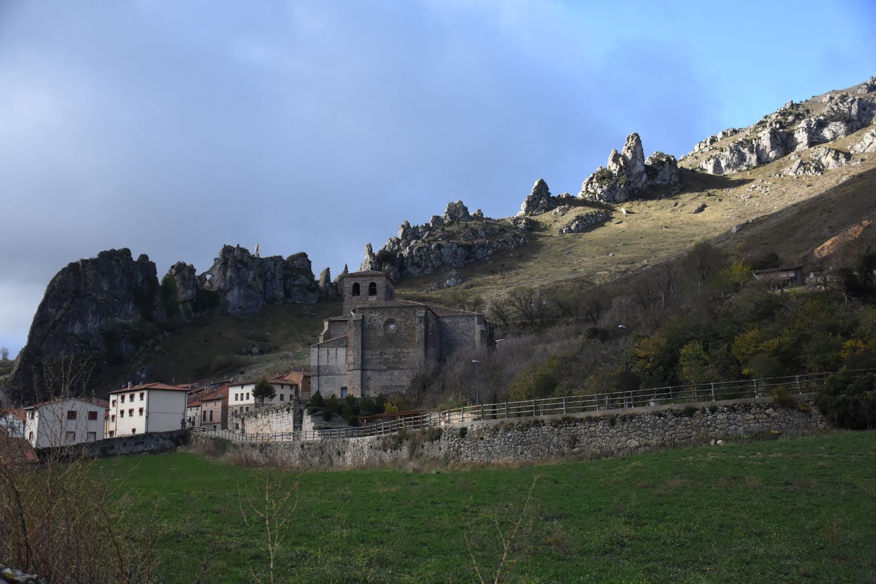 Nous arriverons à Burgos en deux étapes : premier jour dans les montagnes, en montée, dans le froid. Il faut vraiment que nous nous équipions mieux que cela. Nos pieds gèlent. Le paysage est très joli, ce qui nous fait un peu oublier la difficulté au début, mais il devient vite monotone et nous somme très heureux d’arriver dans notre petite pension à Briviesca. Nous sommes seuls dans l’auberge et pouvons profiter de la cuisine et de la salle de bains, habituellement communes, rien que pour nous. Et les vélos sont au garage. Petite promenade dans le village le soir, et au dodo.