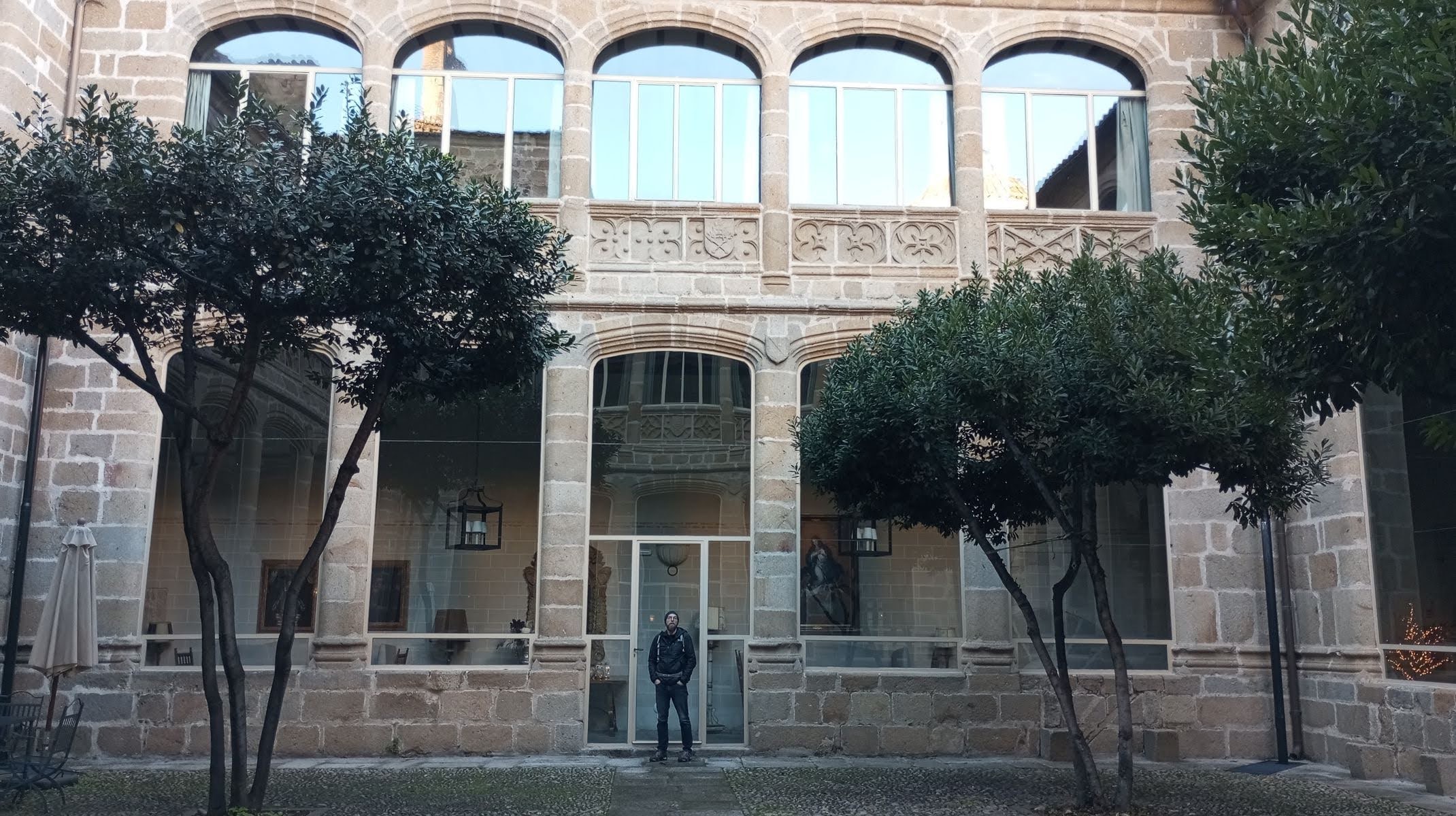 Régénérés ou pas, nous reprenons notre route sur la voie verte, elle aussi découverte par hasard. Comme souvent, il s’agit d’une ancienne voie ferrée réaménagée, donc majoritairement plate. Celle-ci est en altitude, ce qui nous offre un point de vue encore meilleur sur la région. Après Hervás, où nous prolongeons notre séjour d’une journée tant nous nous y sentons bien (enfin, il devait pleuvoir…), nous rejoignons Plasencia, magnifique ville fortifiée où il a l’air de faire bon vivre. Nous pouvons même manger au soleil sur la place tellement il fait beau! Nous n’y passons que l’après-midi et la nuit, faute de temps, mais cela nous donne une idée de l’ambiance plaisante (sûrement un peu différente en cette période des fêtes). Et ça nous donne l’occasion d’admirer encore des crèches (cela devient une vraie addiction) et de squatter le café du Parador pour profiter du luxe à bas coût (quoi que, 2,50 euros le café, c’est pas si bas…)