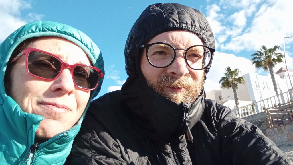 Le lendemain, nous quittons le désert, mais pas tout à fait. Les villages se font de plus en plus peuplés à mesure que nous approchons de la mer, et nous arrivons à Garrucha en milieu d’après-midi. Cette petite ville balnéaire est plutôt tranquille en ce jour férié (fête de l’Andalousie), mais on imagine bien que les touristes doivent affluer en masse en été. En tout cas, aujourd’hui, pas de baigneurs, seul un énorme vraquier se fait guider par 3 remorqueurs. Malgré le soleil, le vent est glacial et nous ne tardons pas à rentrer nous réchauffer et préparer la suite de notre route.