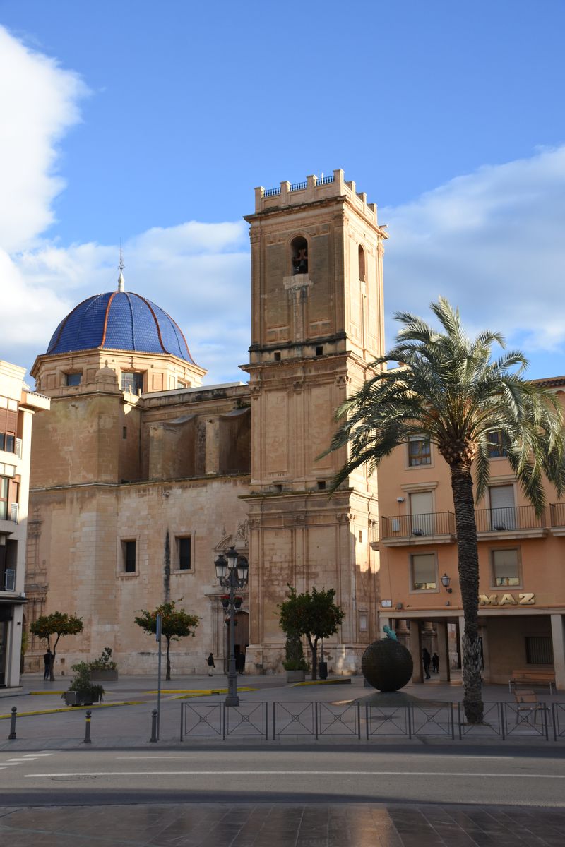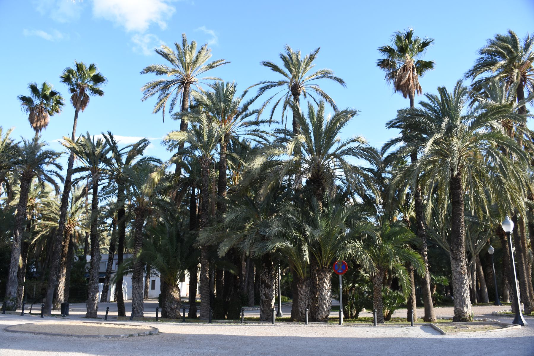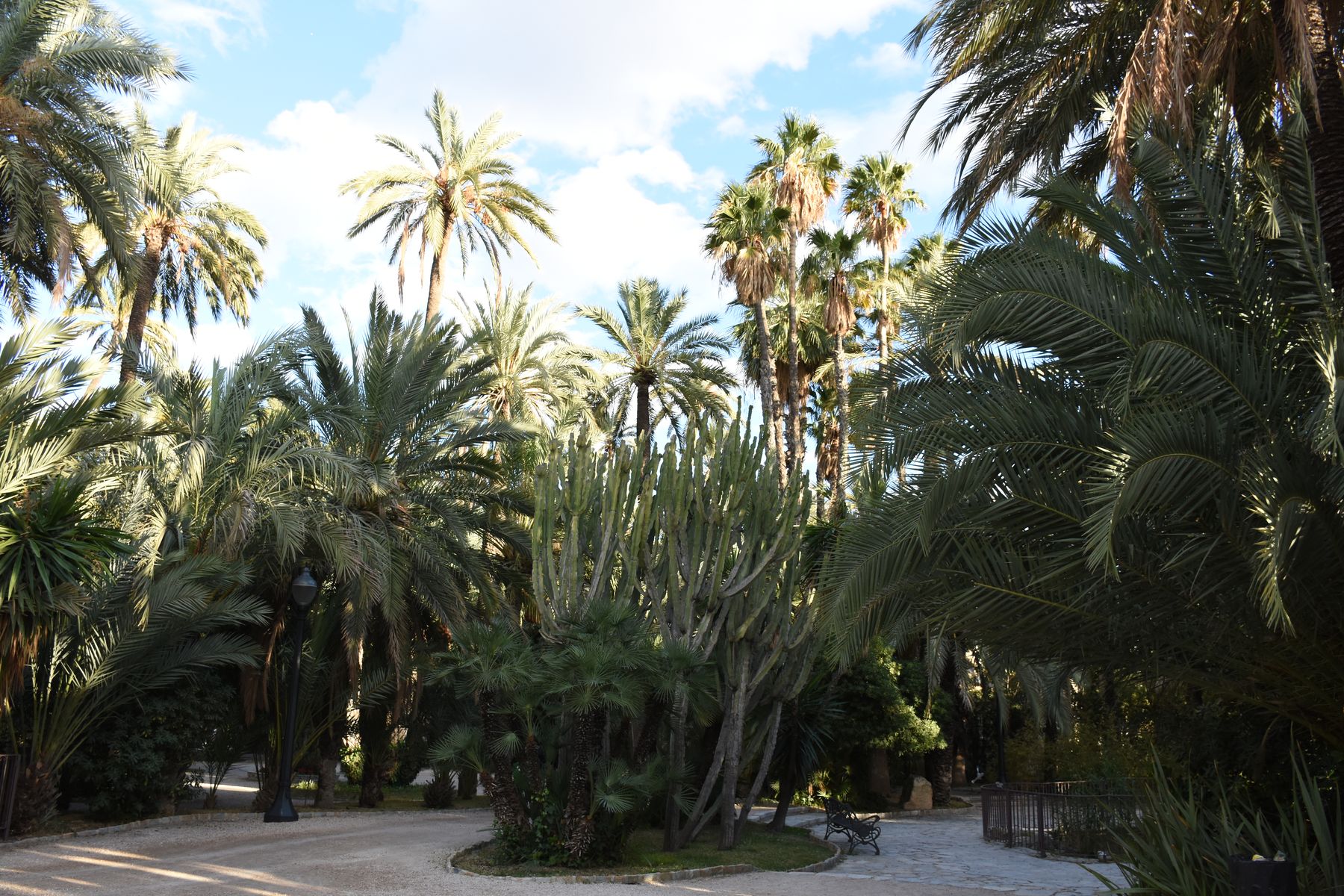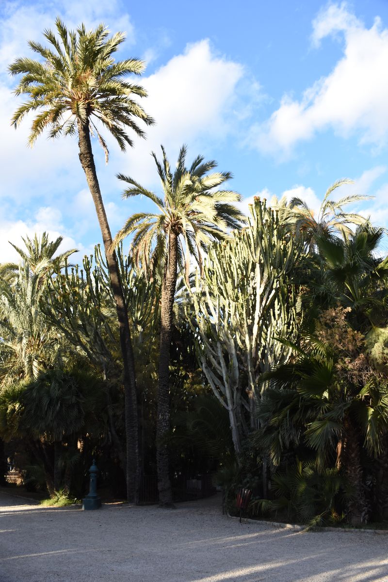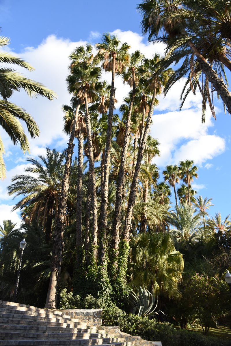 Nous voyons le paysage changer à mesure que nous avançons. Les champs laissent petit à petit place aux palmiers. Et pour cause, nous dormons à Elche, ville inscrite au patrimoine de l’Humanité notamment pour sa palmeraie – la plus grande d’Europe. Nous l’ignorions et avons été agréablement surpris de nous retrouver dans ce paysage inattendu : des palmiers en plein centre-ville. À l’origine, ce furent les Carthaginois qui cultivèrent ces arbres. Les peuples qui se sont succédé dans la région ont poursuivi et étendu leur culture. Ce qui est sûr, c’est que c’est très joli, et qu’en été, il doit être bien agréable de venir se promener sous cette canopée lorsqu’il fait 45 degrés.