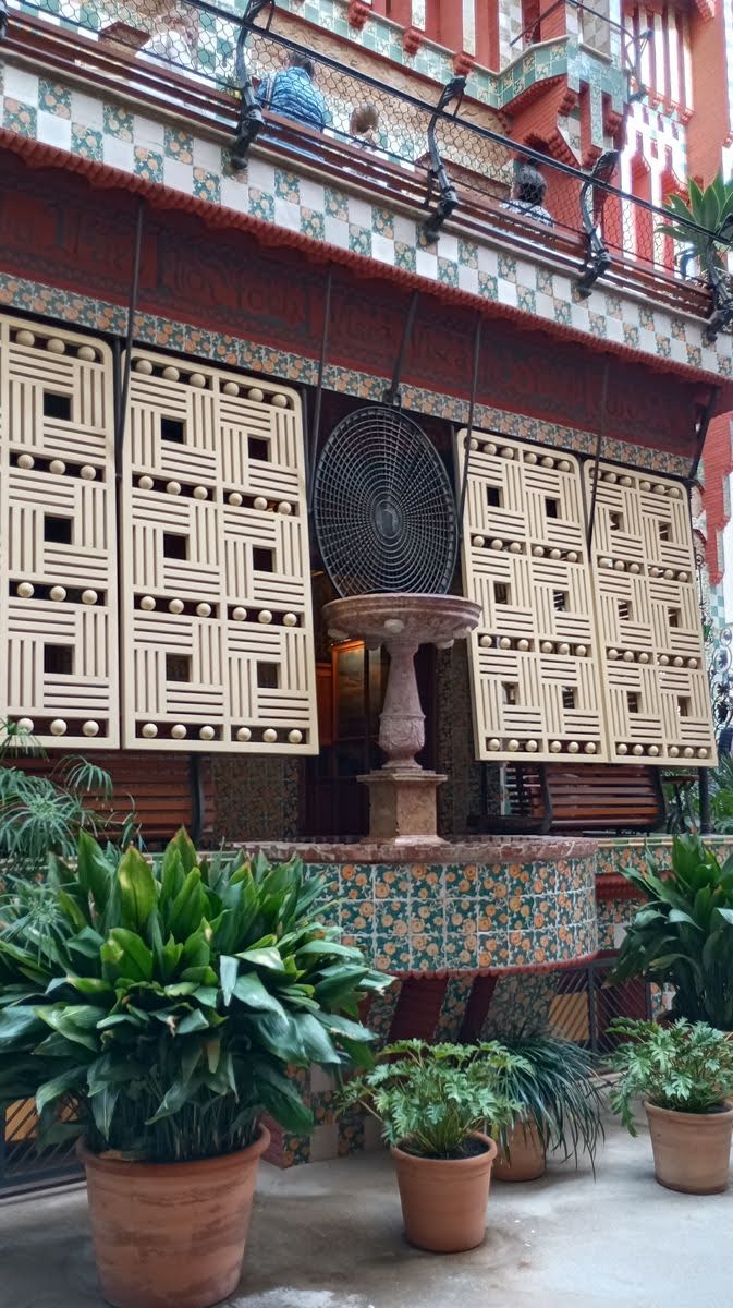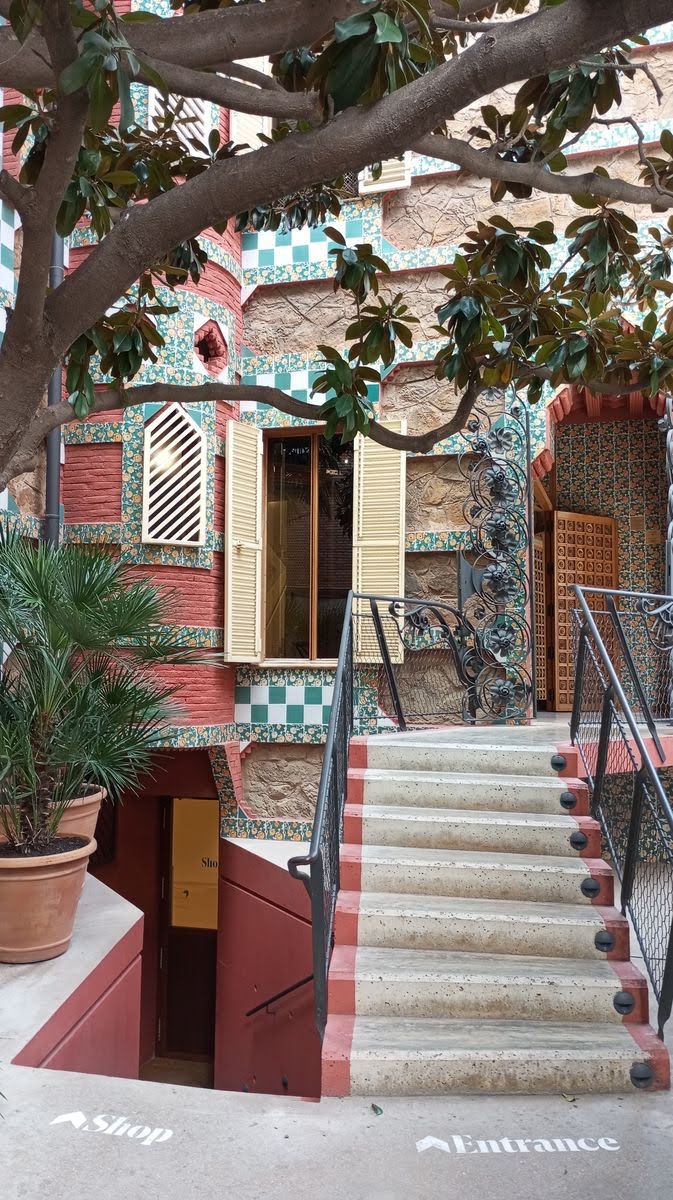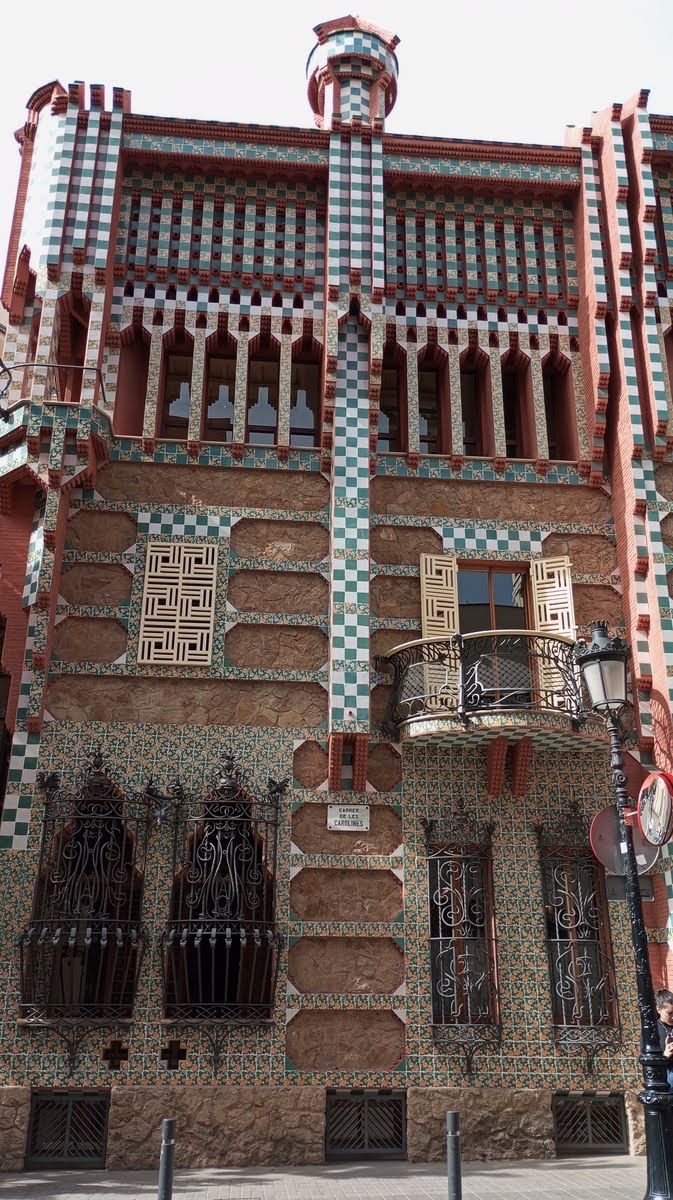Nous voulions retourner à notre bien aimée Sagrada Familia, pour voir où en étaient les travaux depuis notre dernier passage en 2019. Nous avons renoncé : 26 euros l’entrée, ça fait mal. De toute façon, il n’y avait plus de billets pour les dates où nous étions là (Pâques oblige), le problème a donc été réglé. Et comme elle est censée être terminée en 2026, autant attendre un peu et admirer l’œuvre dans son intégralité. Bon, cela veut quand même dire que nous devrons retourner à Barcelone, mais c’est un détail. Nous avons donc fait une croix sur la fameuse cathédrale, mais n’avons pas délaissé Gaudí pour autant et avons choisi d’aller visiter l’une des nombreuses maisons construites par l’architecte. Sa toute première, en fait. La Casa Vicens [https://casavicens.org/es/], qui comme son nom l’indique, lui a été commandée en 1883 par M. Vicens i Montaner, un riche courtier en bourse, pour en faire sa résidence d’été. Ce n’est sans doute pas la plus belle de toutes les créations de Gaudí, mais ce n’est pas non plus la plus courue, lui donnant un avantage certain. Et nous n’avons pas été déçus.