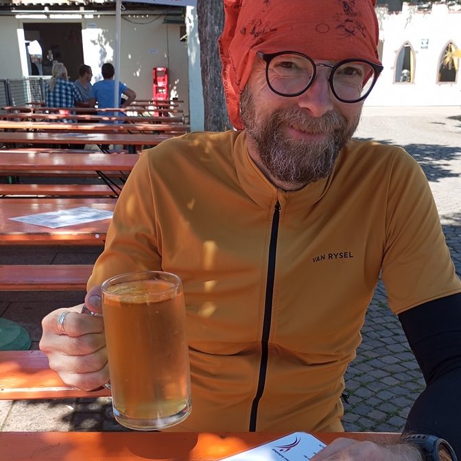 Le lendemain, nous retournons quand même faire un tour sur les pistes cyclables allemandes. À Neuenburg am Rheim, autre ambiance, mais tout aussi festive. Le centre est fermé à la circulation, les échoppes et les châteaux forts en contreplaqué sont sortis, la ville va célébrer Jean Népomucène pendant trois jours. C’est la Nepomukfest!!! Il est 11 h quand nous entrons dans le « village médiéval », c’est plutôt calme. Quelques valeureux sont déjà attablés avec leur bock de bière. Nous, on goûtera l’Apfelschorle. Ein groß Apfelschorle, bitte… (désolés pour les fautes, on ne parle pas allemand). C’est juste un jus de pommes avec de l’eau gazeuse, mais franchement, vu l’heure et la chaleur, c’est exactement ce qu’il nous faut.