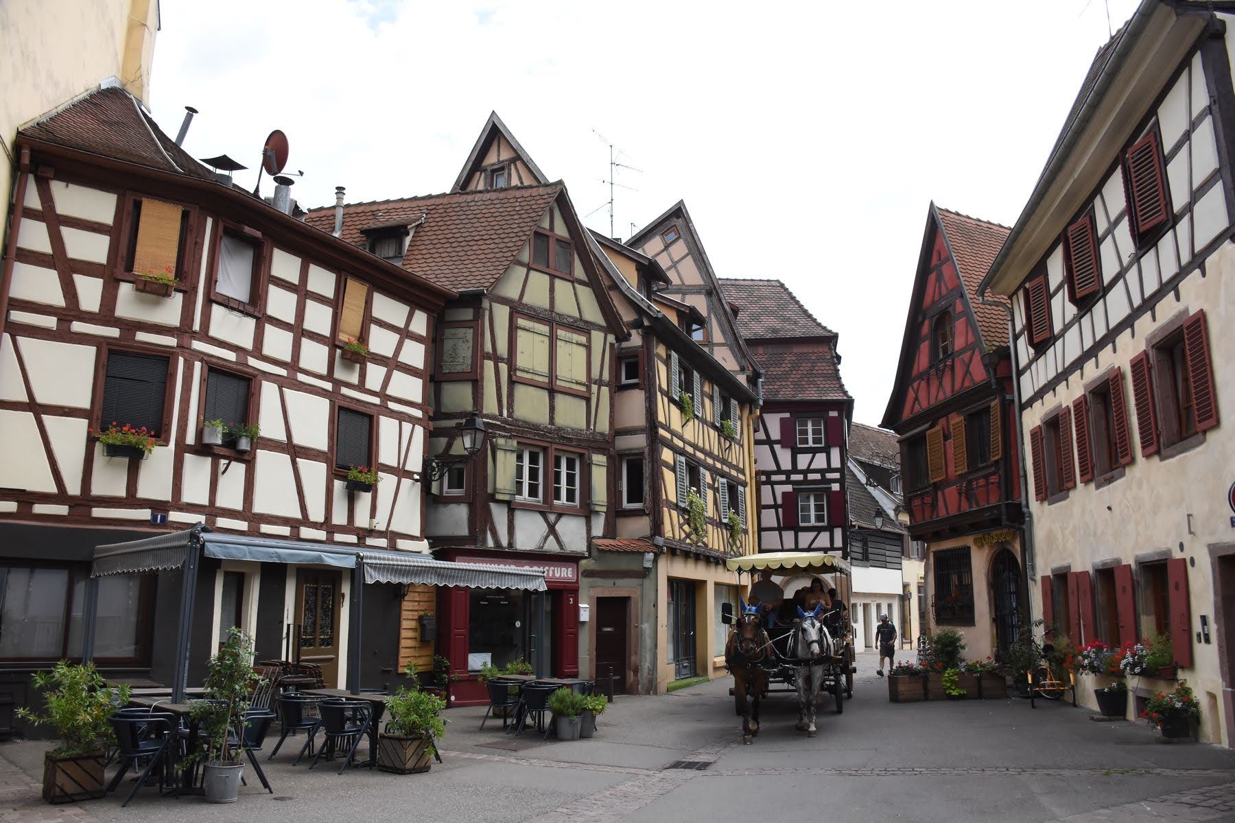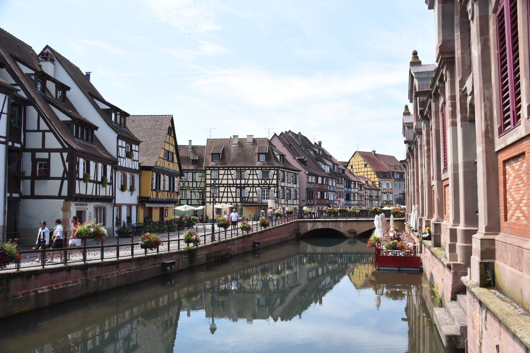 Nous poursuivons notre route du côté allemand sans découvrir grand-chose de bien exceptionnel en chemin, à part peut-être les champs de tabac. On n’a pas trop l’habitude d’en voir. Pour le reste, le maïs est plus ou moins similaire d’un côté ou de l’autre du Rhin, et nous retraversons la frontière pour dormir à Neuf-Brisach. Village classé au patrimoine de l’UNESCO pour sa forteresse Vauban (aaaahhhhhh, il nous avait manqué, celui-là), c’est également l’endroit idéal pour visiter Colmar située à une dizaine de kilomètres à l’ouest. C’est ce que nous faisons donc. La forteresse et le village nous laissent plutôt sur notre faim, un peu délabrés et tristounets, mais Colmar ne nous déçoit pas, si ce n’est peut-être par la quantité de touristes qui nous entourent. Contre cela, nous ne pouvons rien faire. Voyageurs nous-mêmes, nous participons à rendre ces lieux magnifiques ultra-touristiques et nous devons l’accepter. Cela fait partie du jeu, nous le savons bien maintenant. Alors nous essayons de ne pas nous énerver chaque fois que quelqu’un passe juste devant alors qu’on tente de prendre la photo parfaite, ou que l’on se fait marcher dessus pour aller voir ce qu’il y a dans une vitrine. Nous faisons sûrement cela aussi sans nous en rendre compte. Bref, la ville est magnifique et c’est ce que nous en retiendrons (ainsi que l’excellente glace maison végane et bio au café, j’en ai encore l’eau à la bouche…)