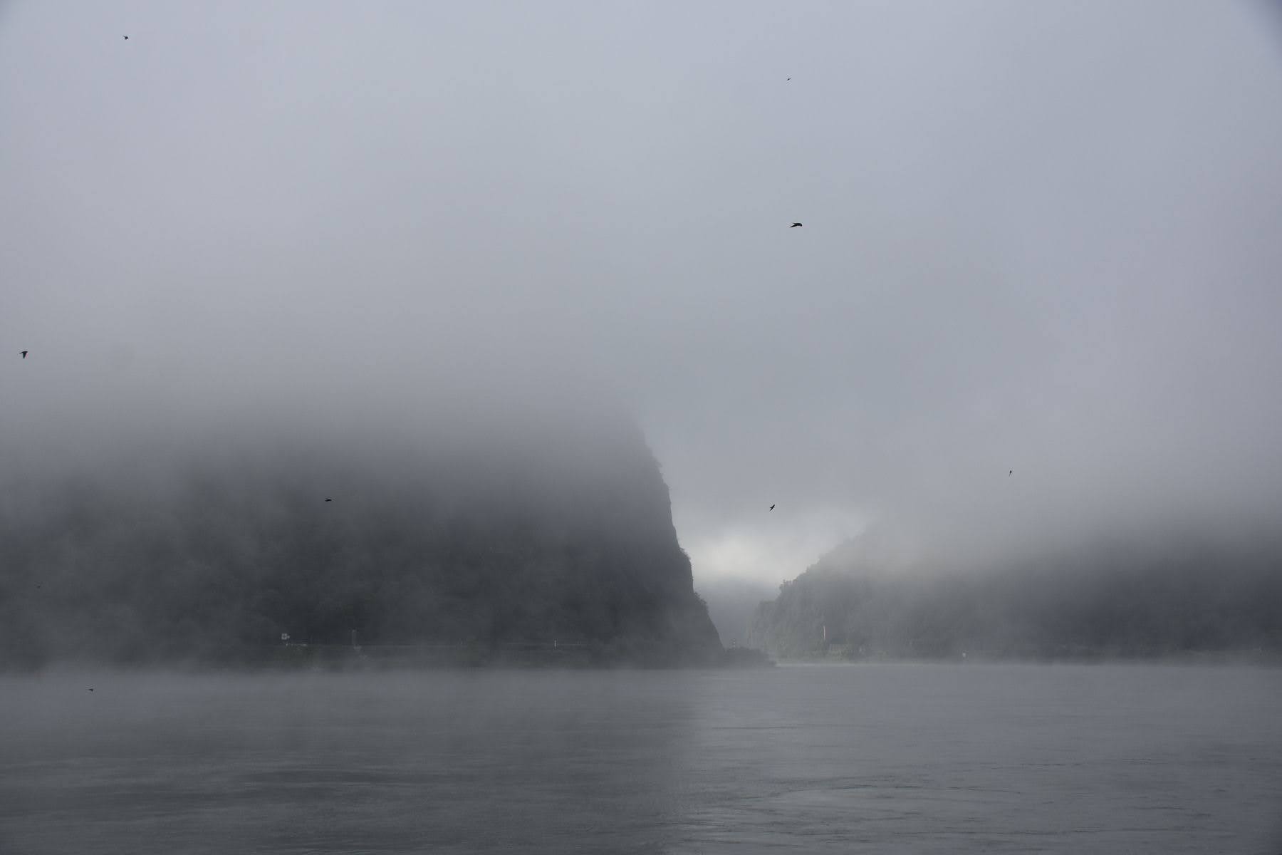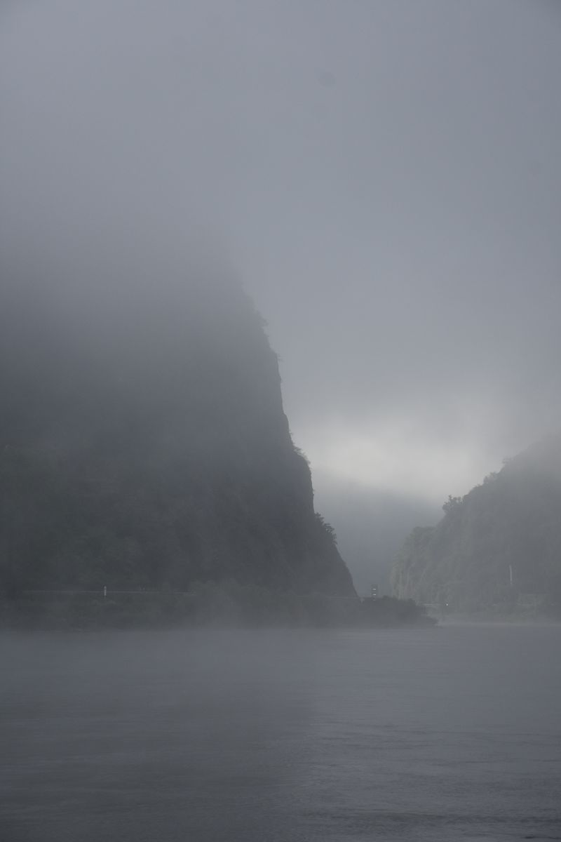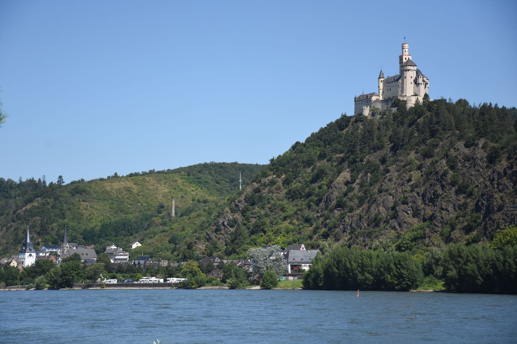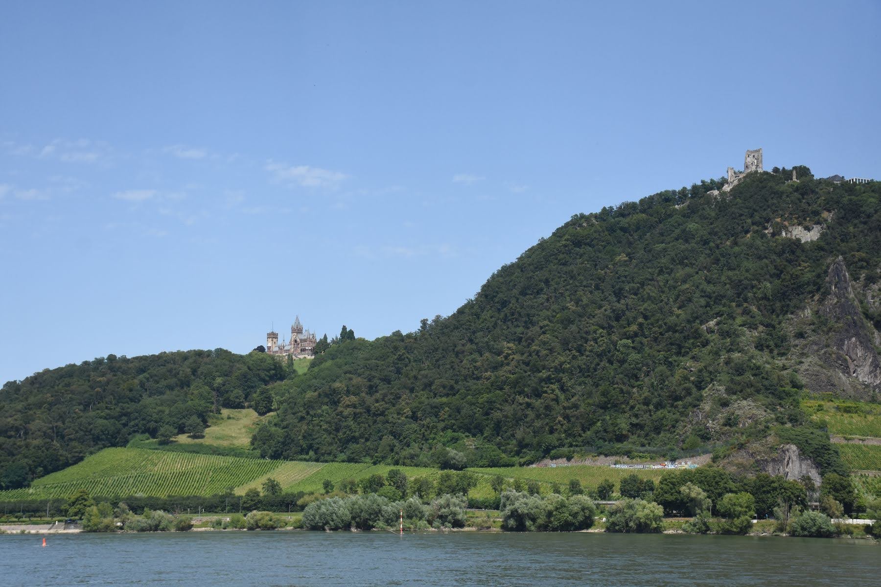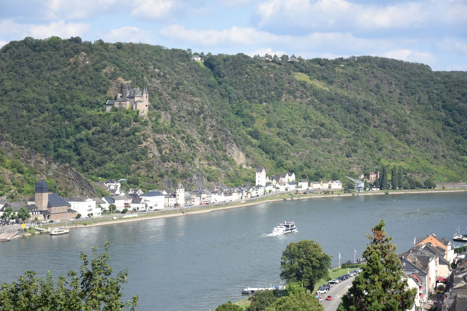 Jusque-là, nous nous ennuyions un peu le long du Rhin, au rythme des péniches de fret, qui d’ailleurs transportent tout et n’importe quoi. C’est une expérience en soi que de les regarder passer : conteneurs, gaz, vrac, métal, on voit de tout sur ces embarcations et on se rend bien compte de l’importance du fleuve d’un point de vue commercial. Mais depuis Mayence, nous nous trouvons au fond de la vallée, entourés de falaises, de coteaux et de vignes (tellement pentues qu’on les arrose par hélico…). Nous découvrons un château perché à chaque courbe, c’est vraiment magnifique.