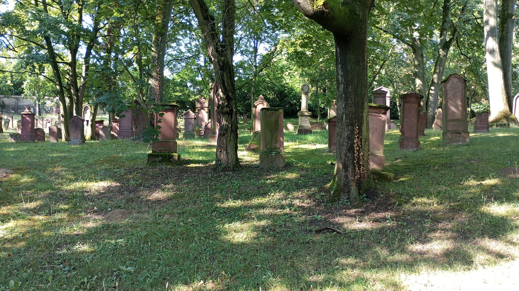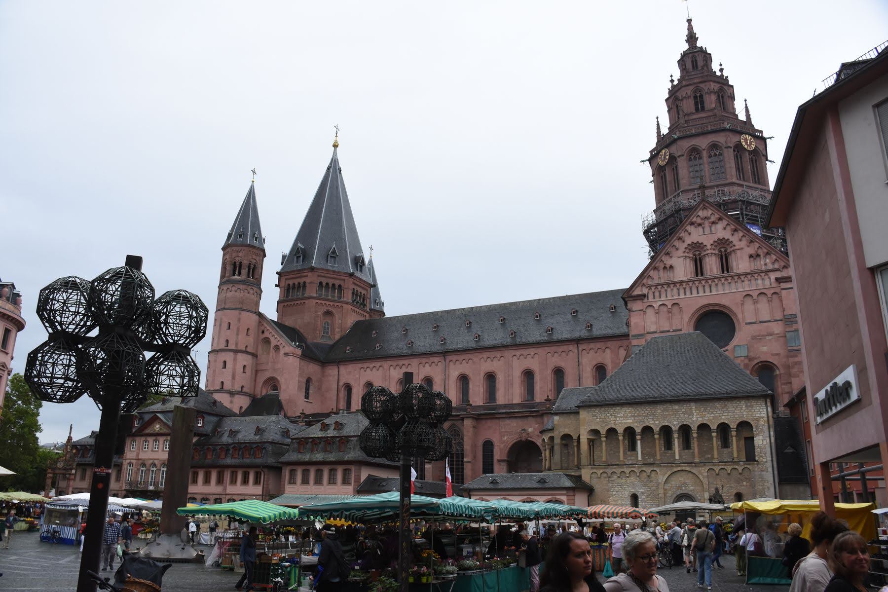 La ville, en effet, est très jolie. Mélange d’architecture romaine, baroque et moderne, les monuments à explorer ne manquent pas. De l’imposante cathédrale romane à l’église St. Stephen célèbre pour ses vitraux bleus réalisés par le peintre juif Marc Chagall, en passant par la fontaine de carnaval ou la nouvelle synagogue, tous les styles et toutes les religions sont représentés. La communauté juive, notamment, est très importante. Il s’agit de l’une des plus anciennes du pays, et sa présence remonte au Moyen-Âge. De nombreux points d’intérêt sont donc visibles à Mainz. Malheureusement, il est rarement possible de visiter sans guide et sans rendez-vous, ce qui nous oblige à rester à l’extérieur des sites. Nous avons tout de même pu pénétrer dans l’ancien cimetière juif, par chance, car une cérémonie allait s’y tenir à notre arrivée. On nous a donc permis d’entrer pendant 10 minutes, en proposant une kippa à Stéphane (il avait déjà un couvre-chef et a donc refusé, mais il n’aurait pas été autorisé à entrer sans cela).